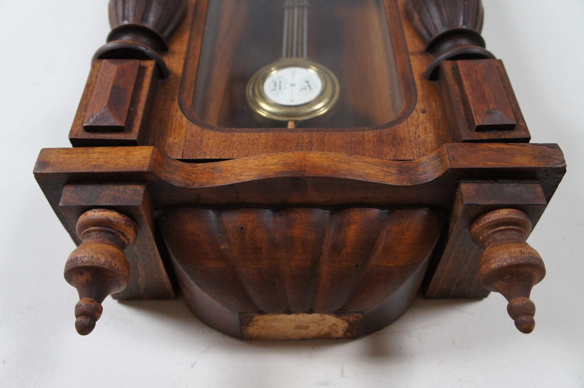 Antique German wall clock circa early 1900’s – wooden case with triangular pediment, carved columns at the sides and turned finials suspended from the base. Arched glass front and sides. Brass and white enameled face with Roman numerals. R-A pendulum. Original works replaced sometime in the late 20th century with battery operated mechanism.