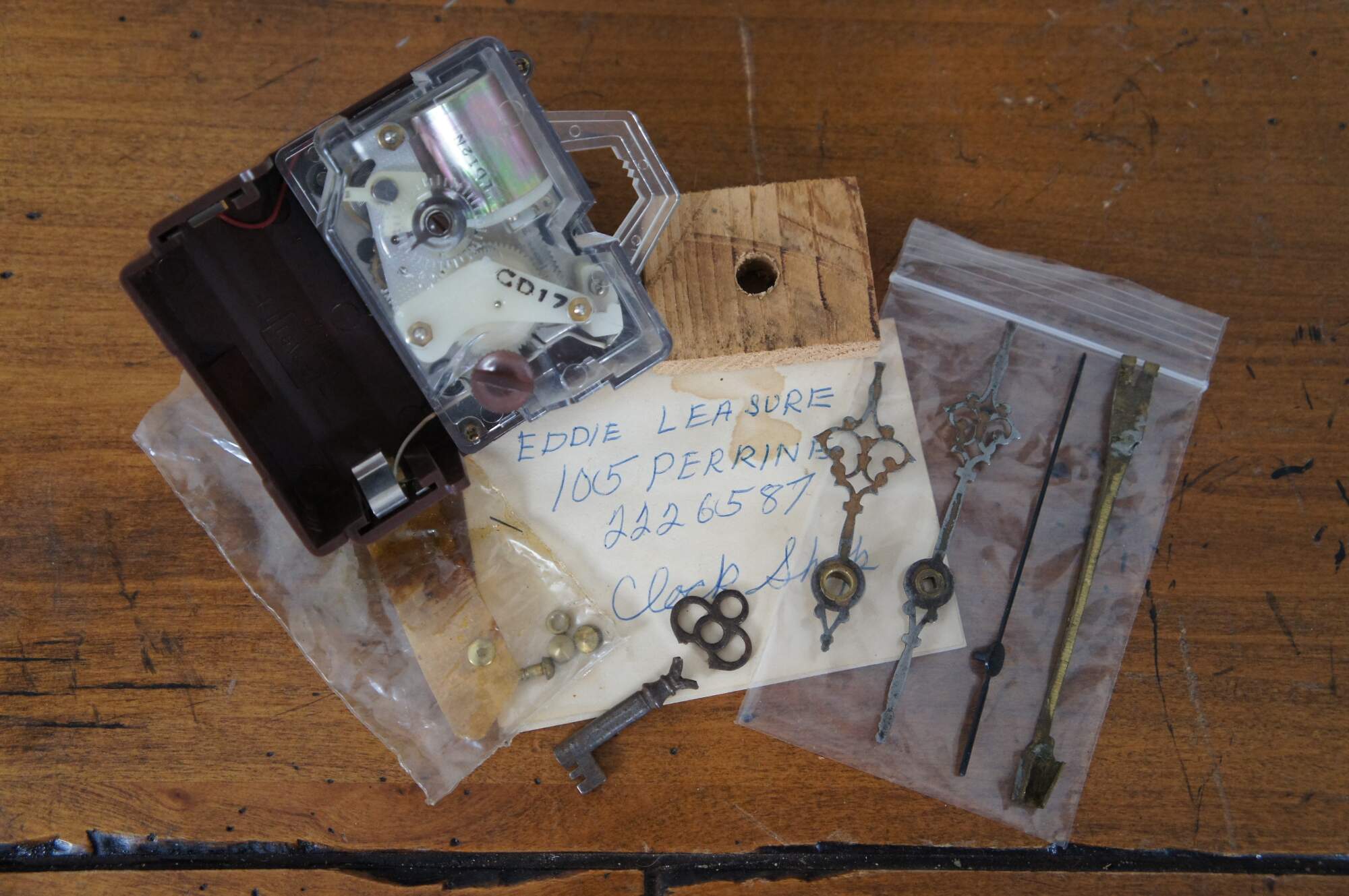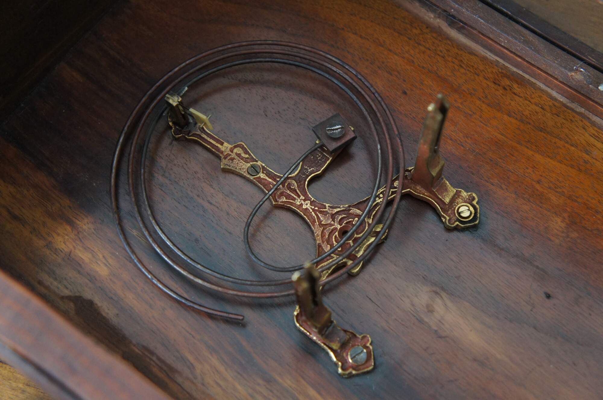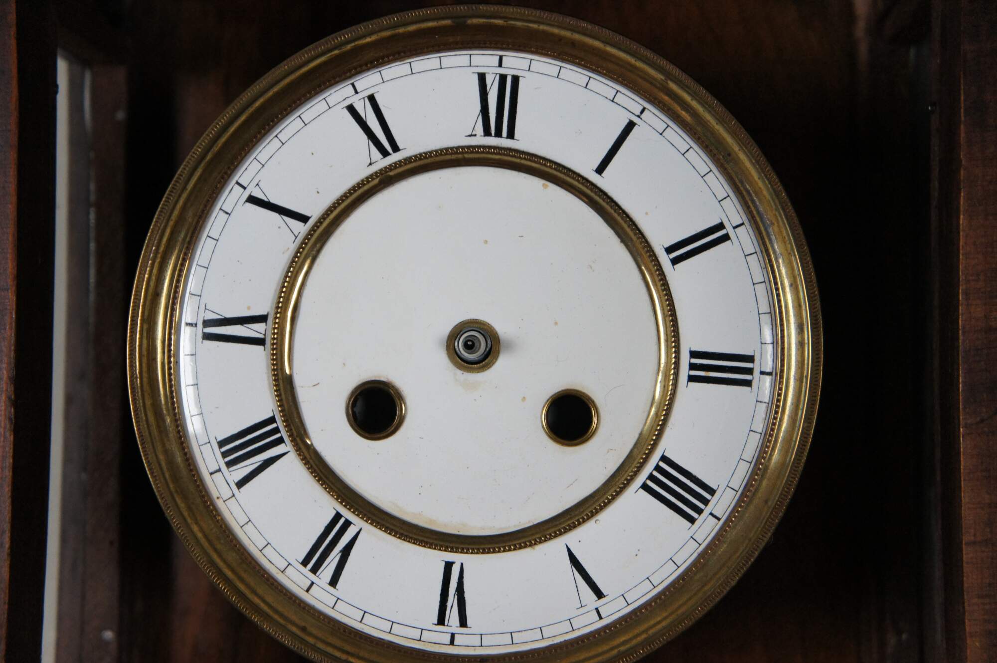 Good Overall - Works replaced; hands detached; chime/pendulum currently not connected to mechanism; missing center finial on base; one base finial loose