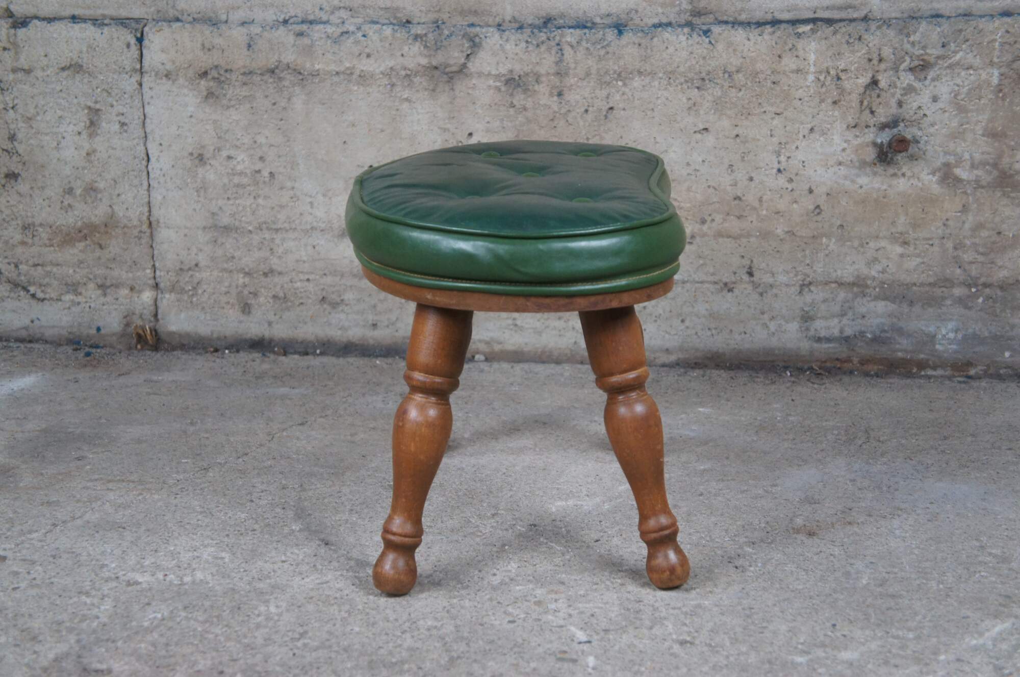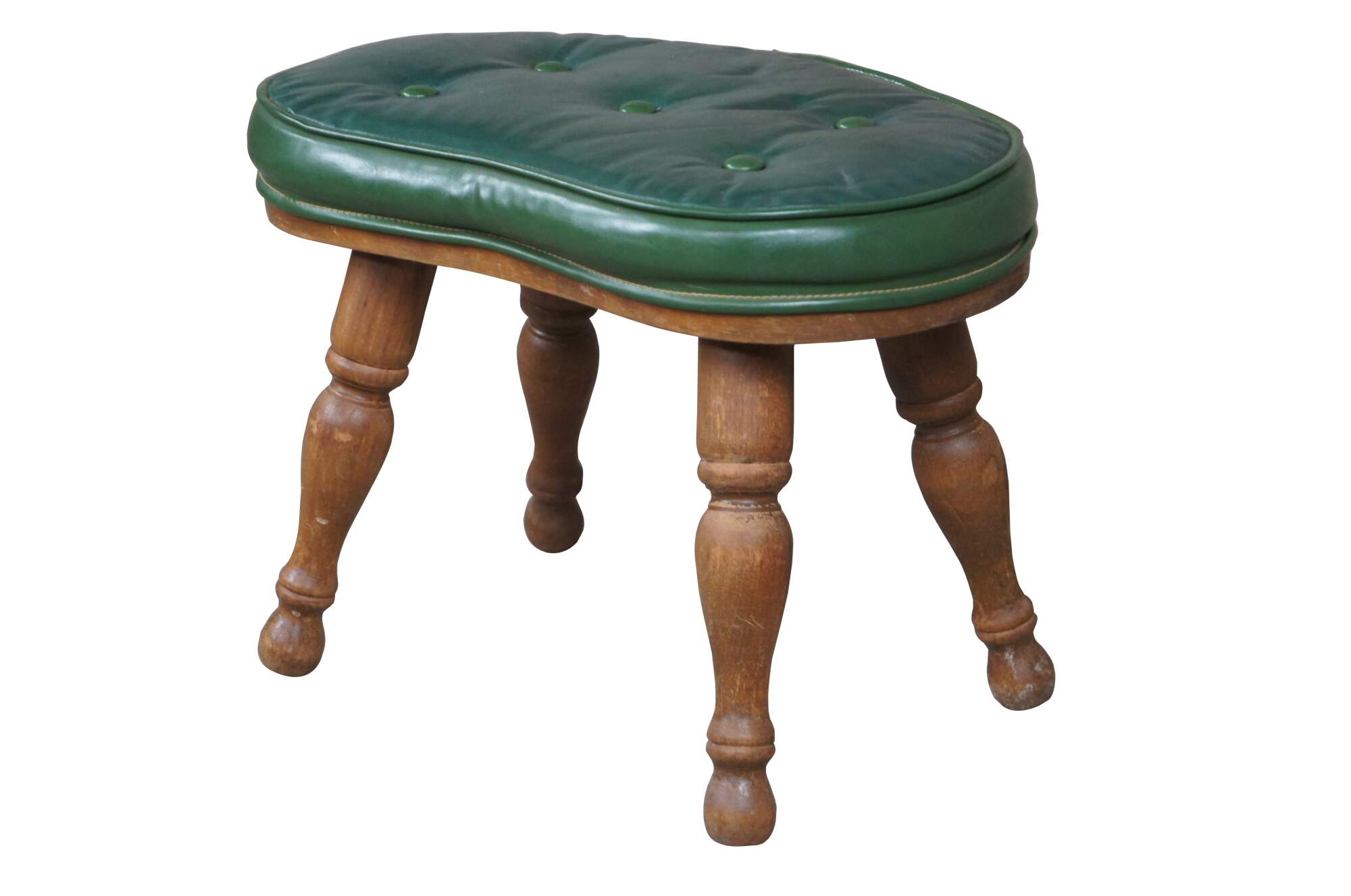 Mid Century Kidney Bean Foot Stool, Bench seat or Ottoman. Features a hardwood frame with turned legs and a green vinyltufted seat. A retro design that will draw attention in any space.