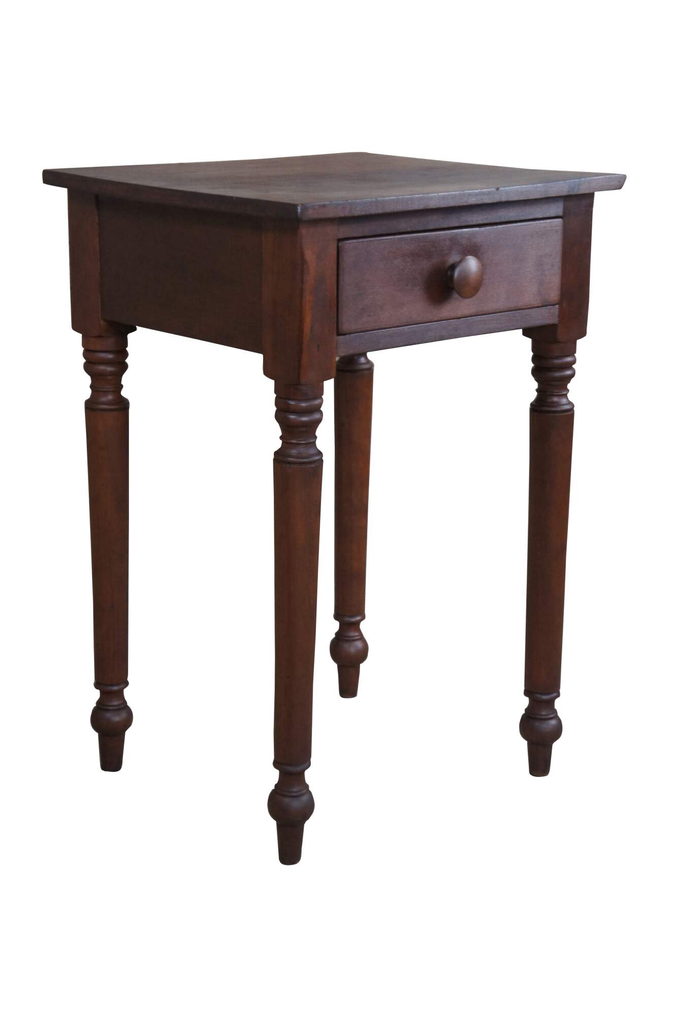 Early American walnut side table with drawer. Features turned ribbed legs leading to arrow foot and hand dovetailed drawer with wooden knob. The interior drawer has a divided drawer.
