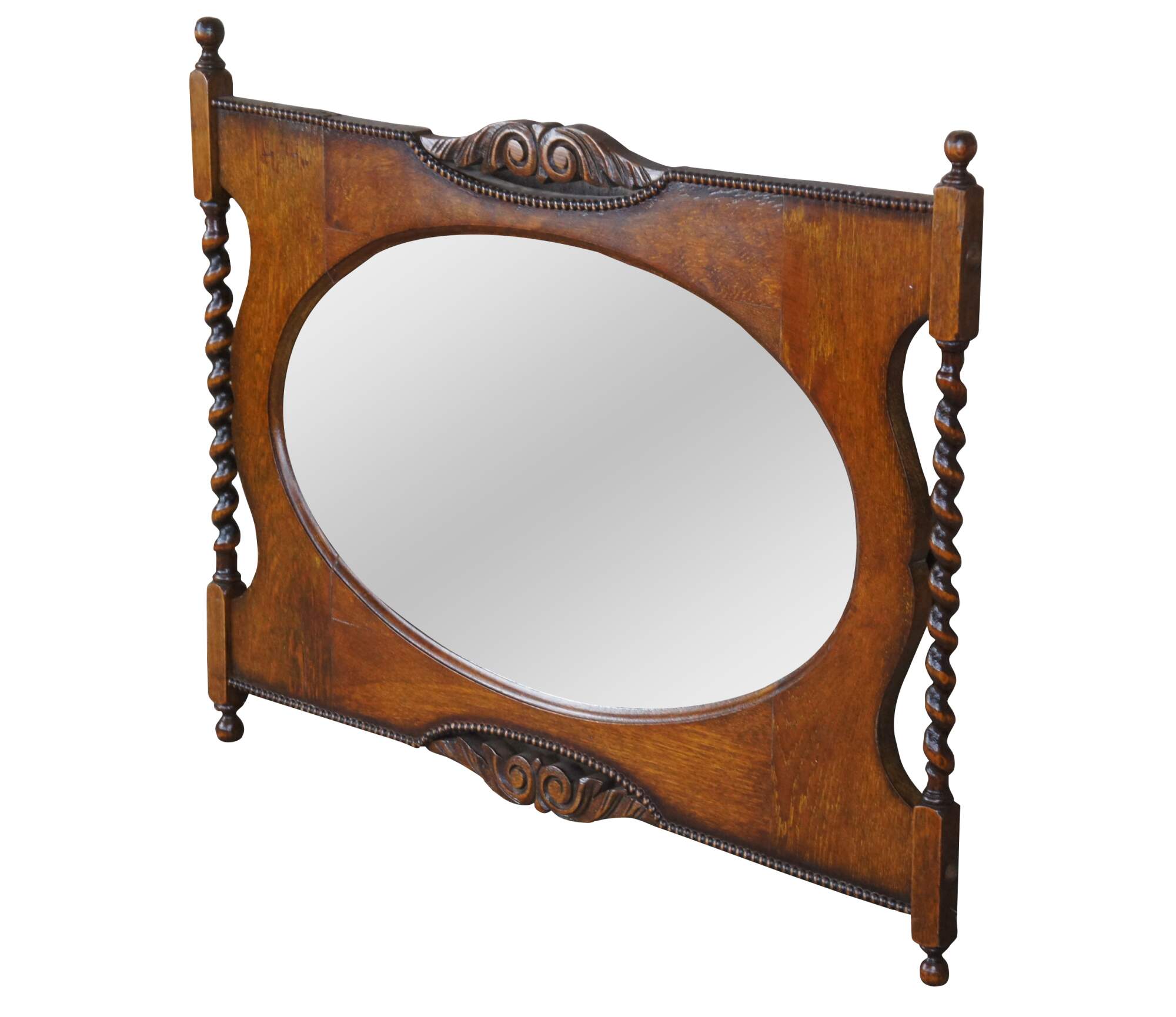 Antique Victorian parlor vanity mirror. Made of quartersawn oak featuring ornate accents with gadrooned edge, ornate carvings, barley twisted supports and beveled oval mirror.