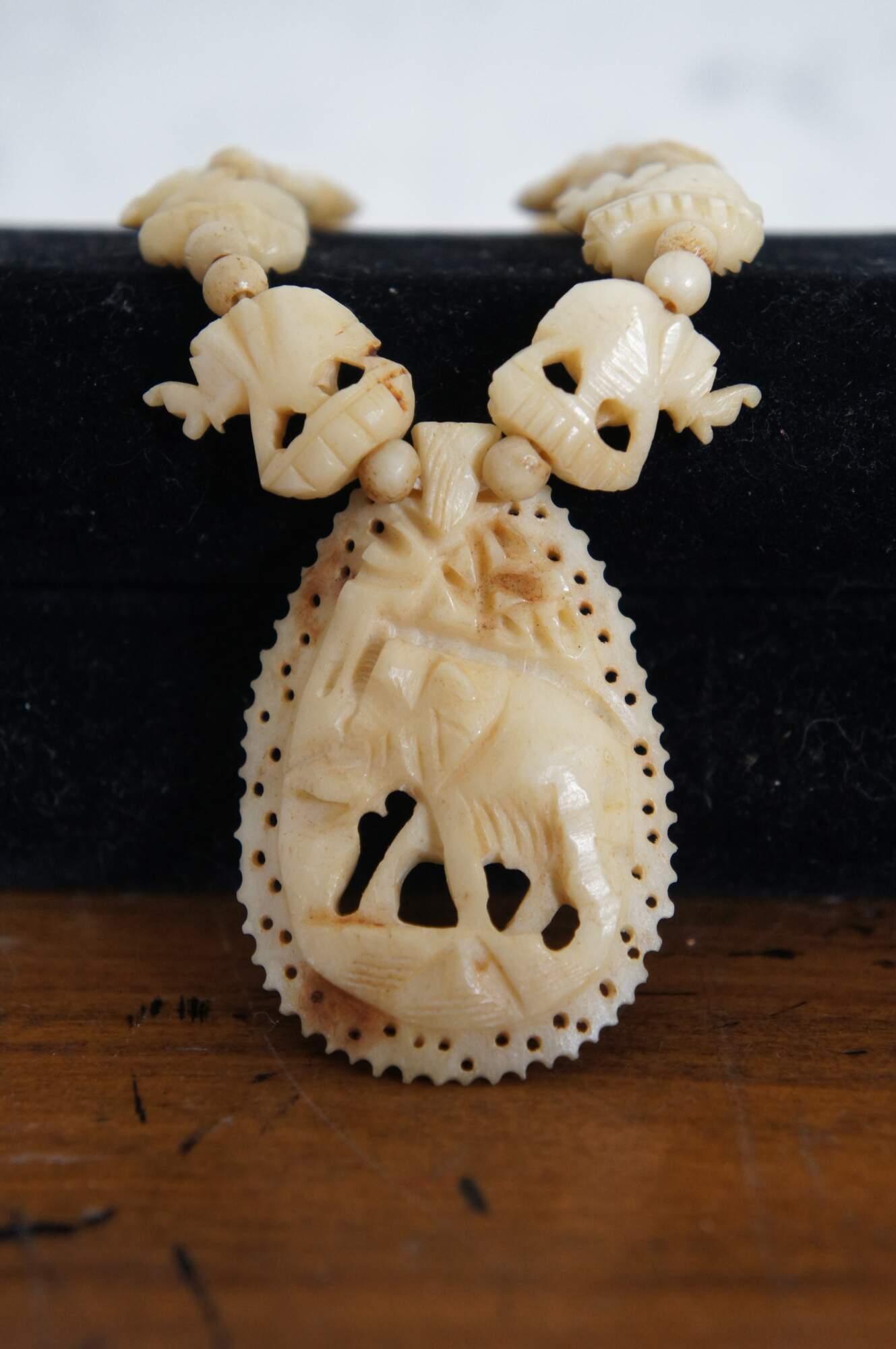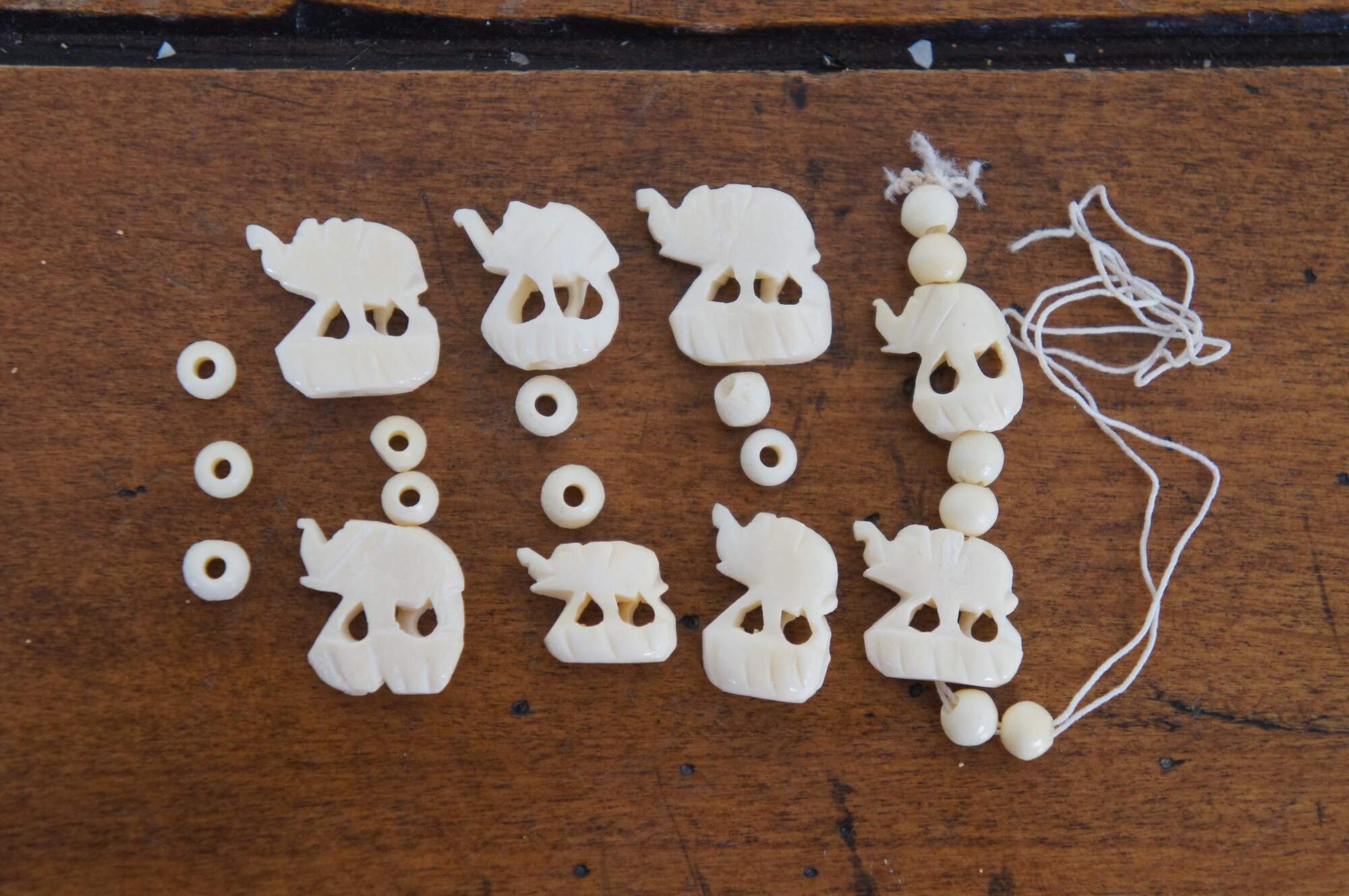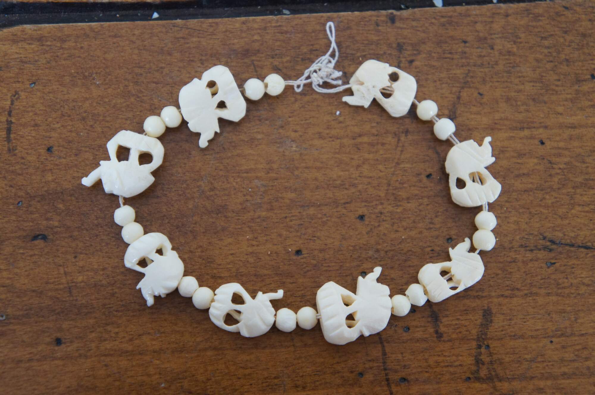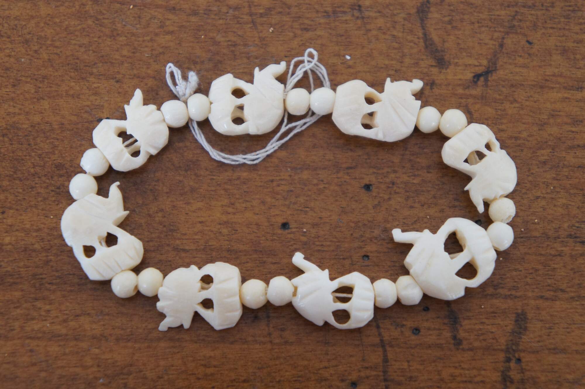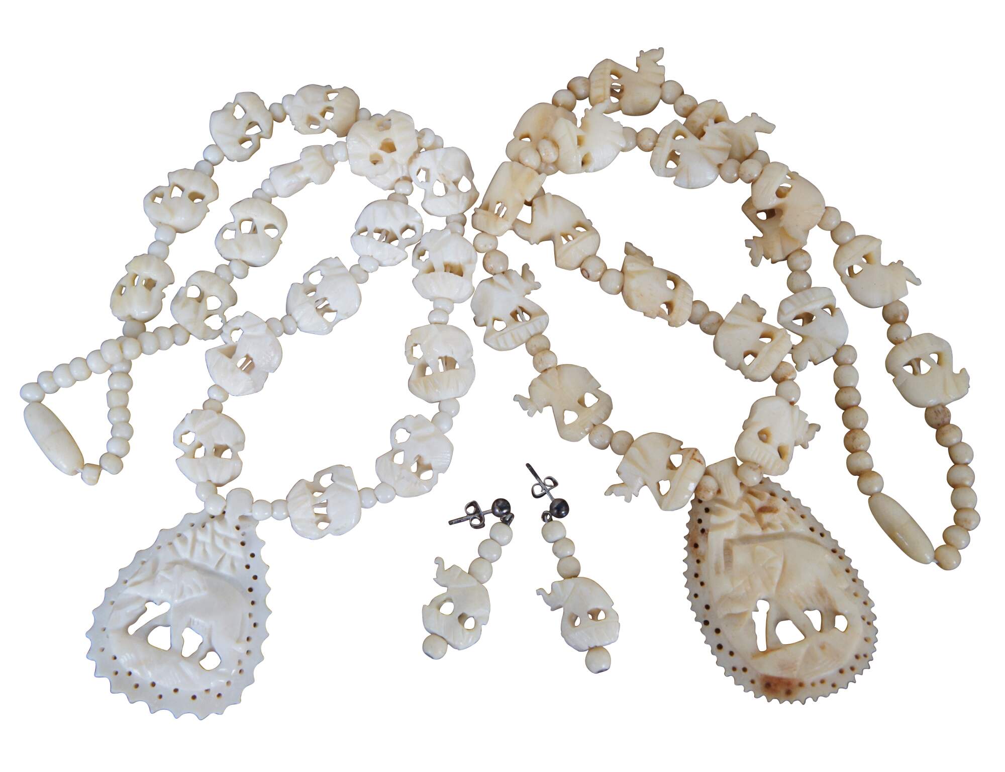 Lot of 6 antique and vintage carved bone beaded jewelry pieces with an elephant motif including two pendant necklaces, three bracelets that need re-stringing, and a pair of dangle post back earrings.