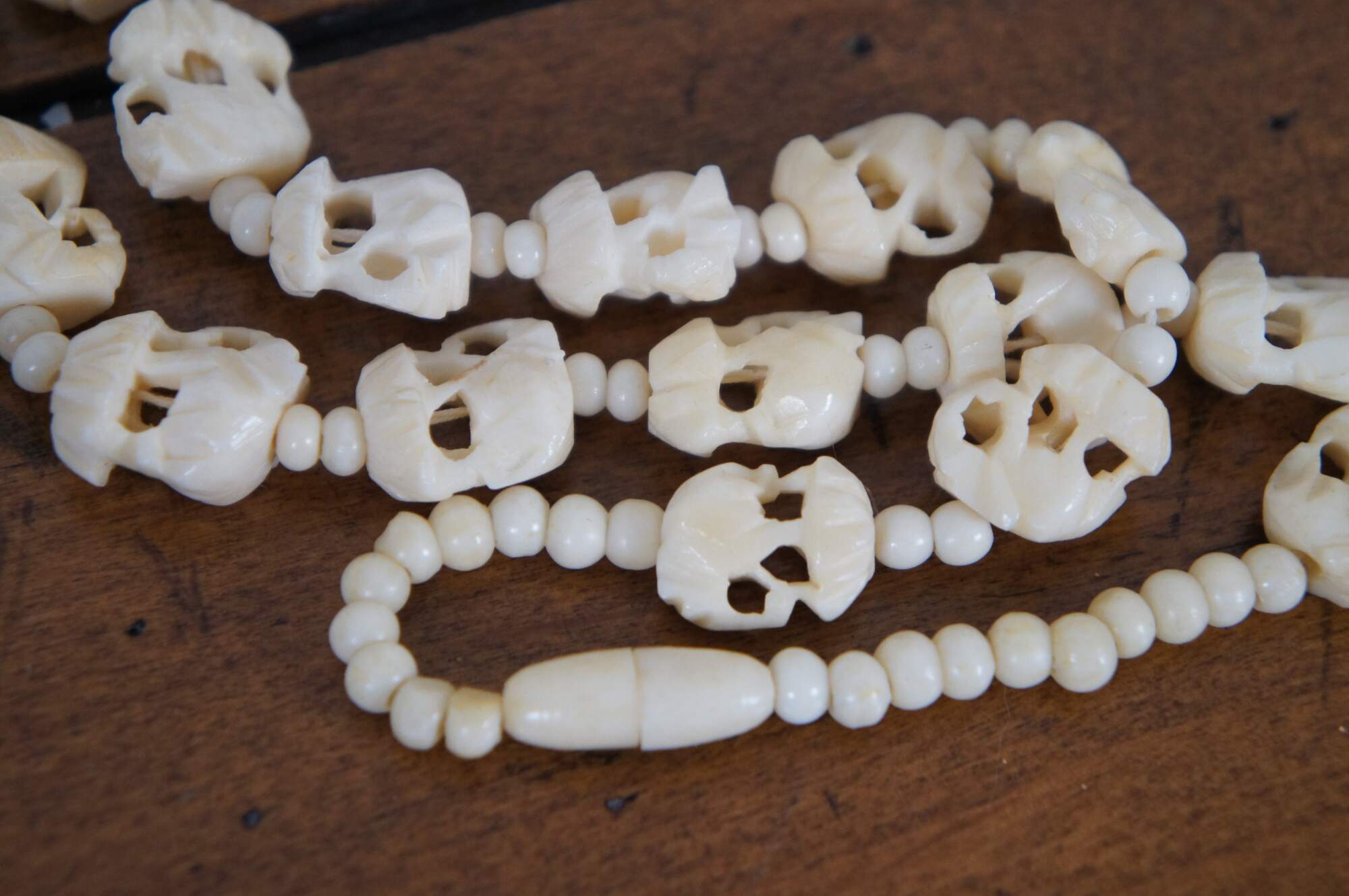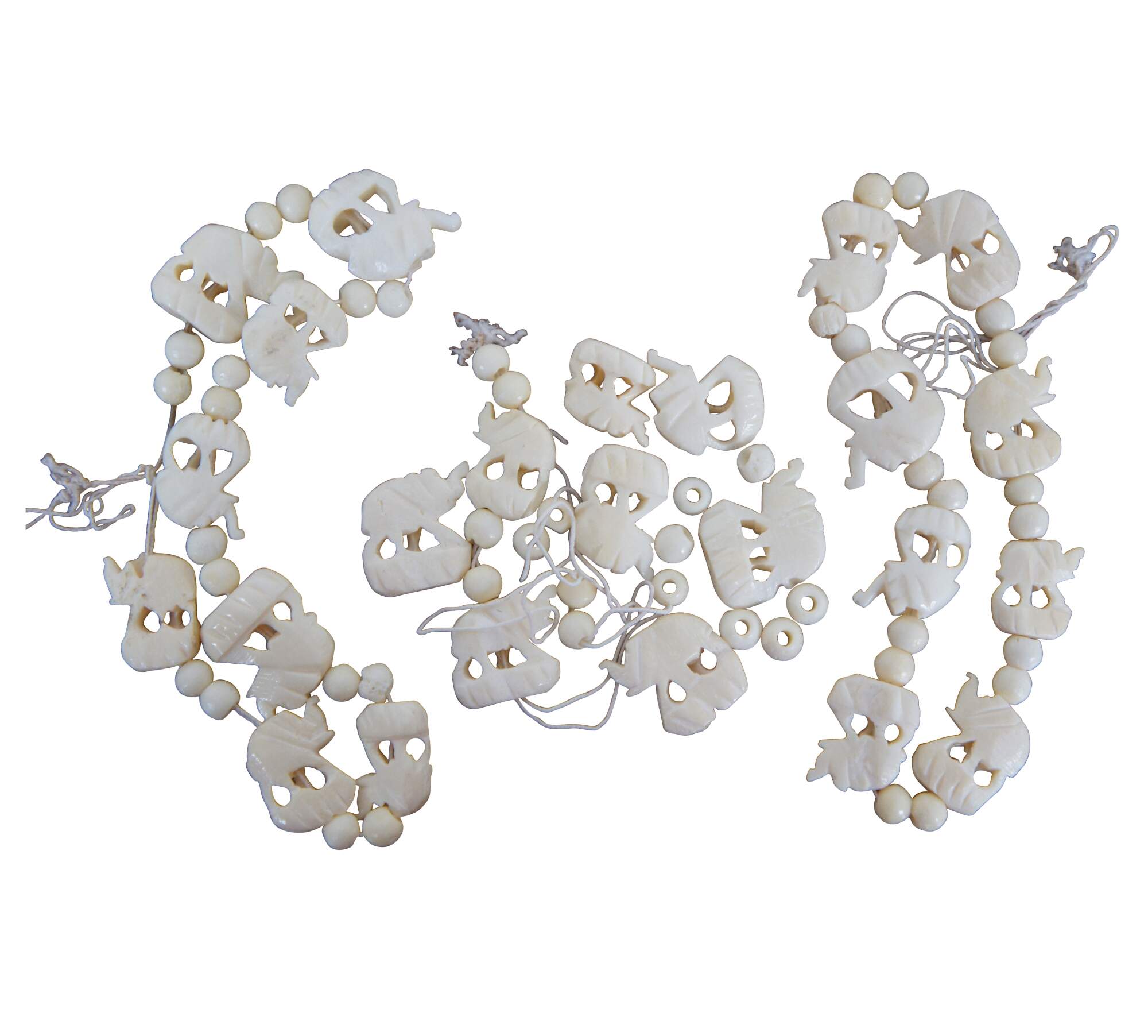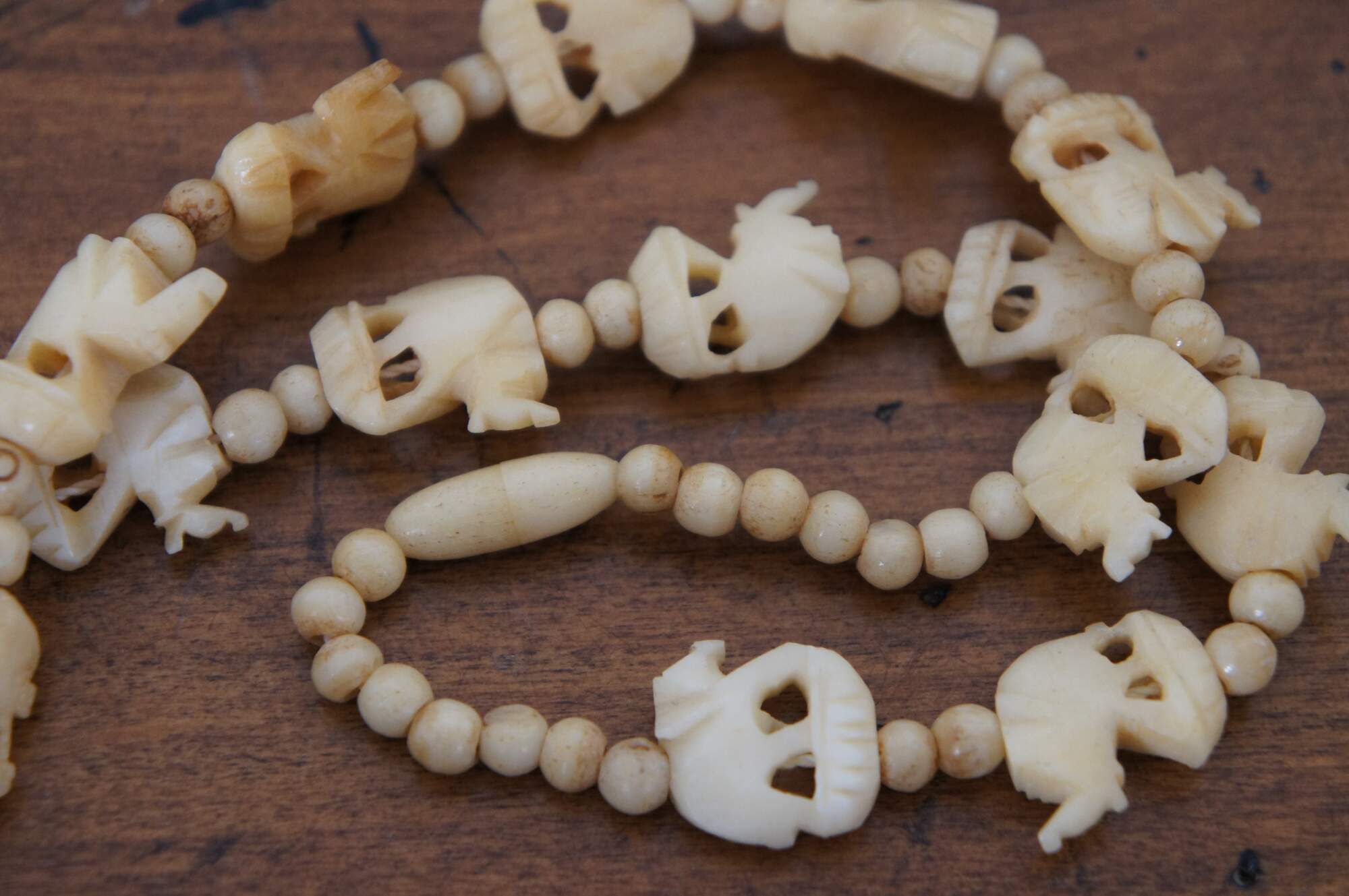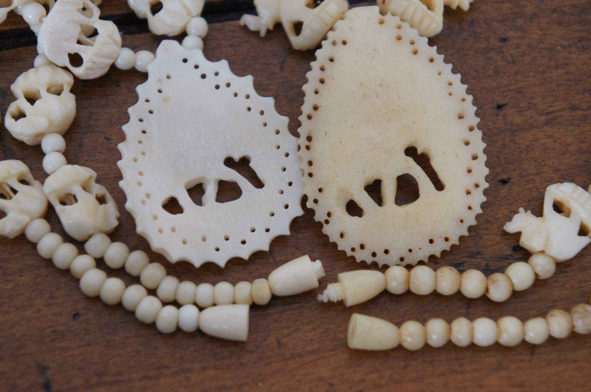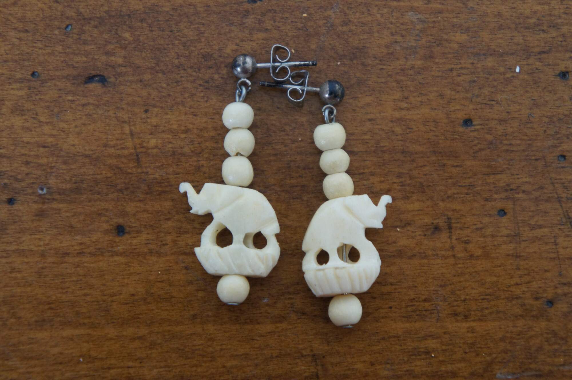 Lot of 6 antique and vintage carved bone beaded jewelry pieces with an elephant motif including two pendant necklaces, three bracelets that need re-stringing, and a pair of dangle post back earrings.