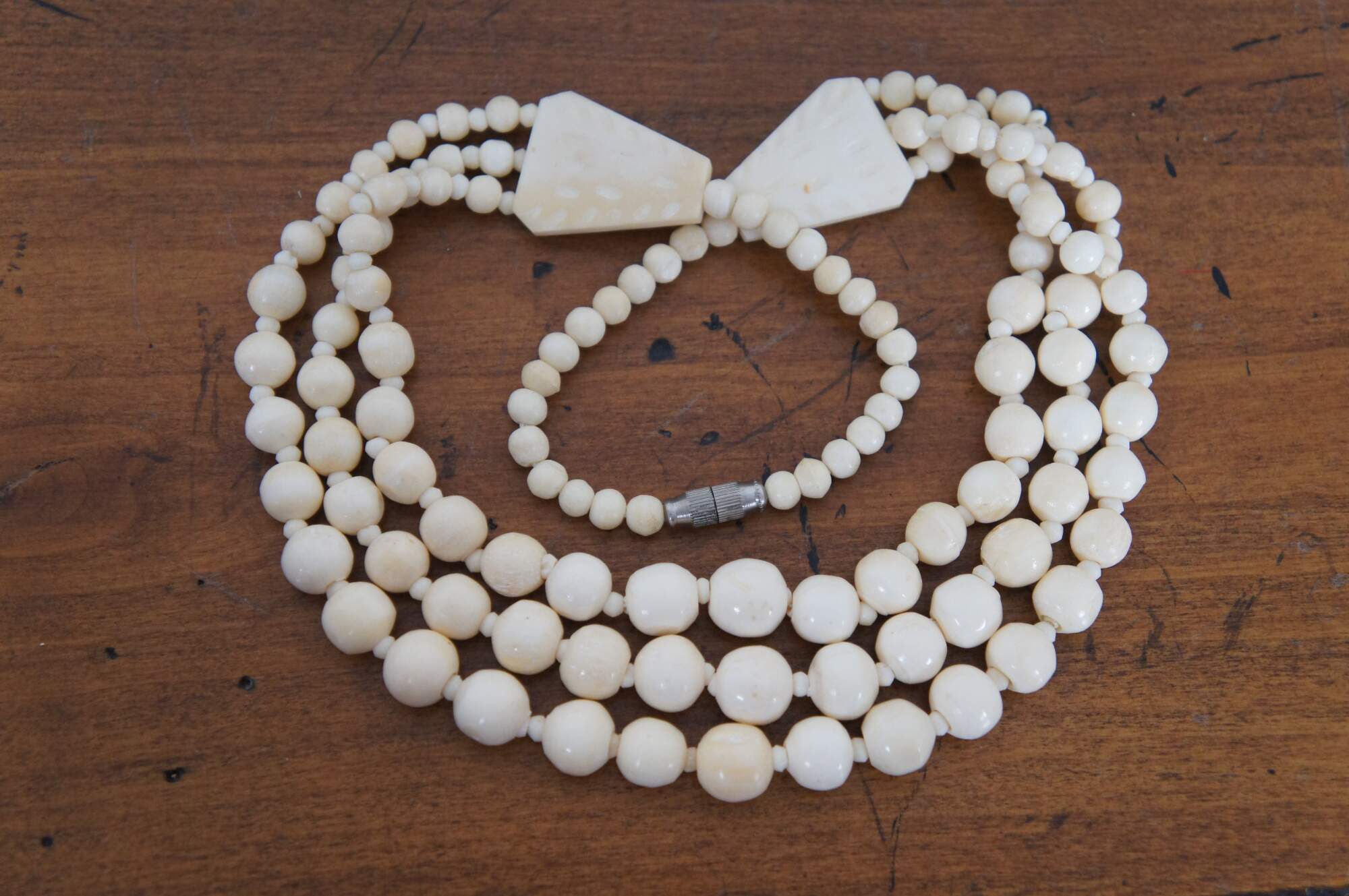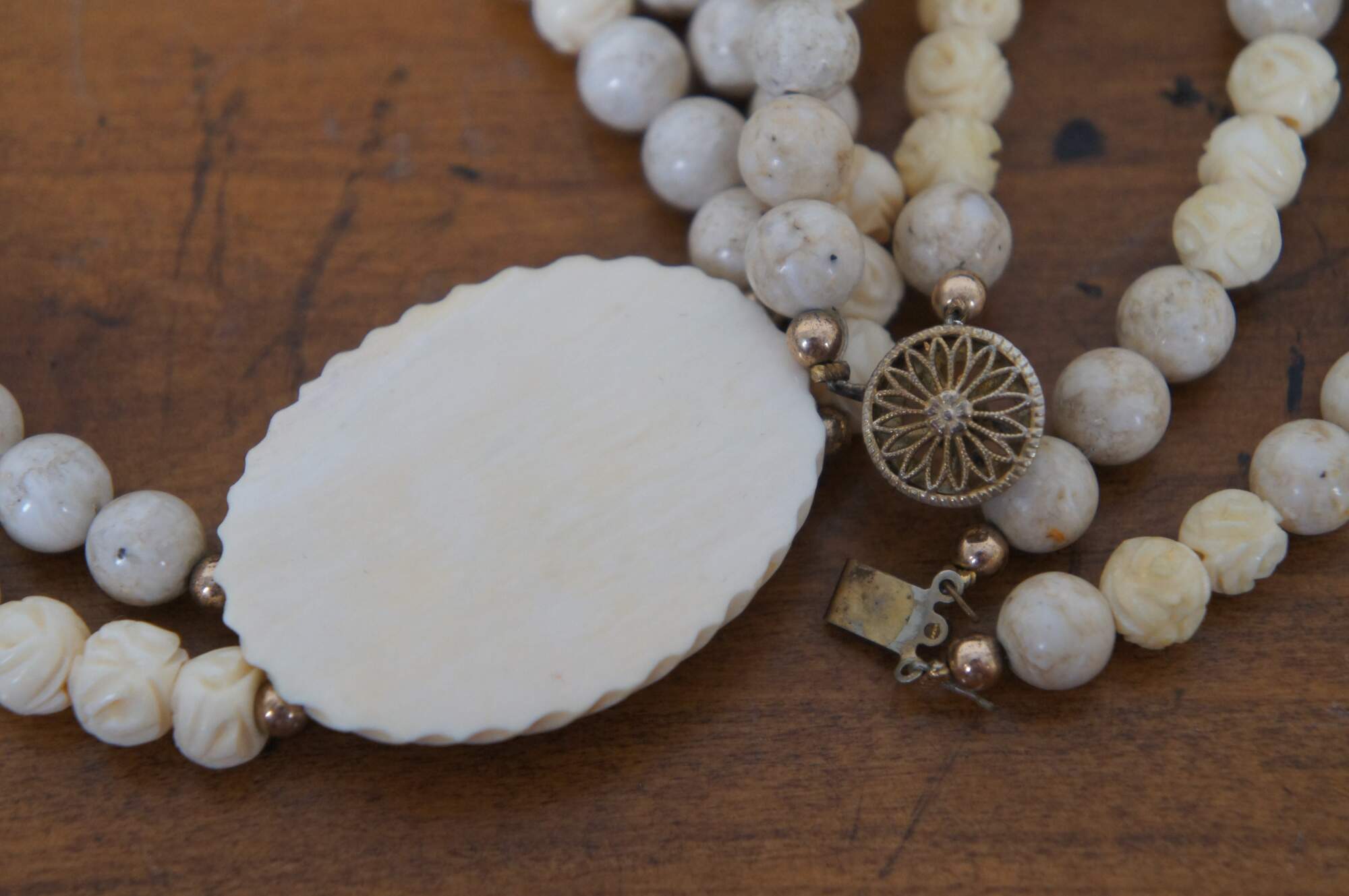 Set of three antique / vintage multi-strand beaded necklaces, one with smooth, round, graduated beads, one with graduated floral carved beads, and one with round carved floral beads alternating with round stone beads and an asymmetrically placed cameo. Set also includes a set of dangle earrings with fishhook back.