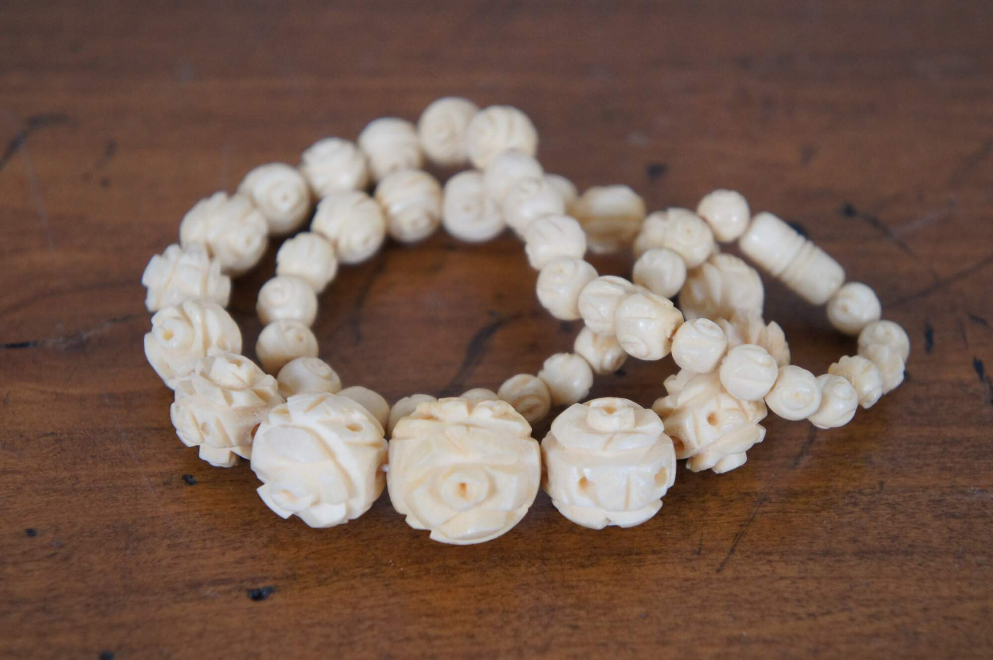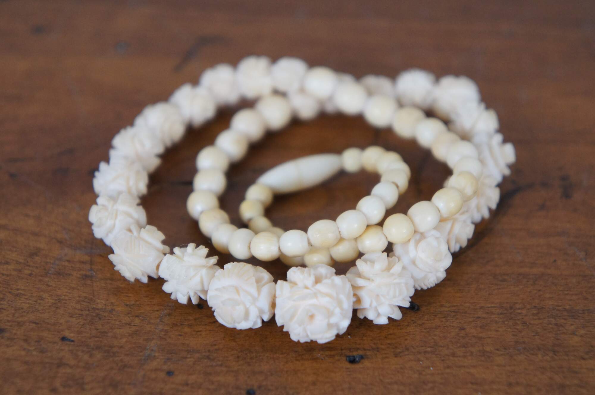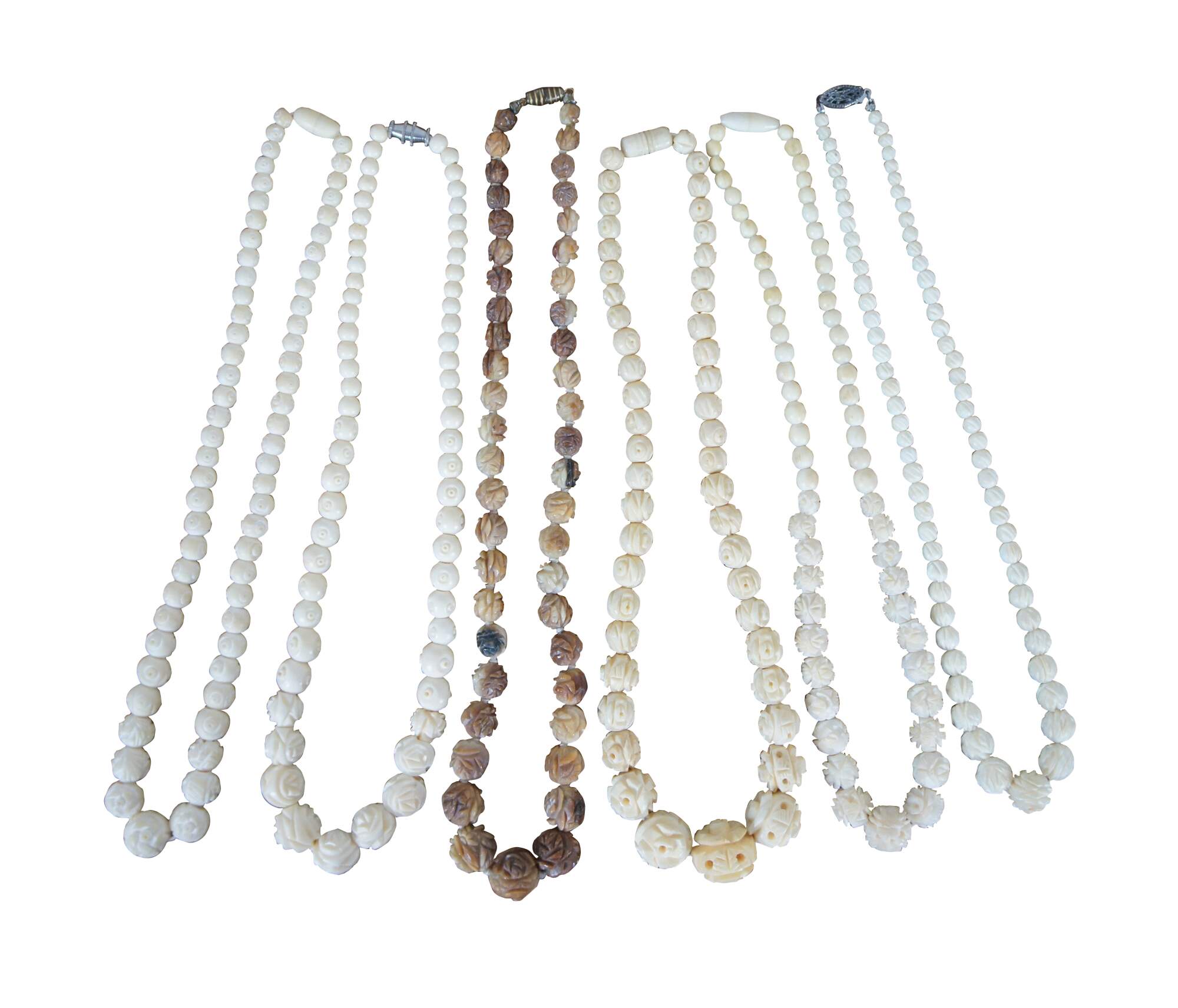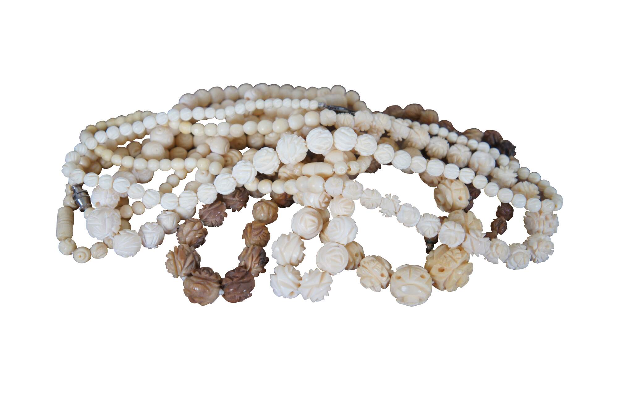 Lot of 6 antique and vintage necklaces crafted of round, floral, graduated carved bone beads and barrel clasps.