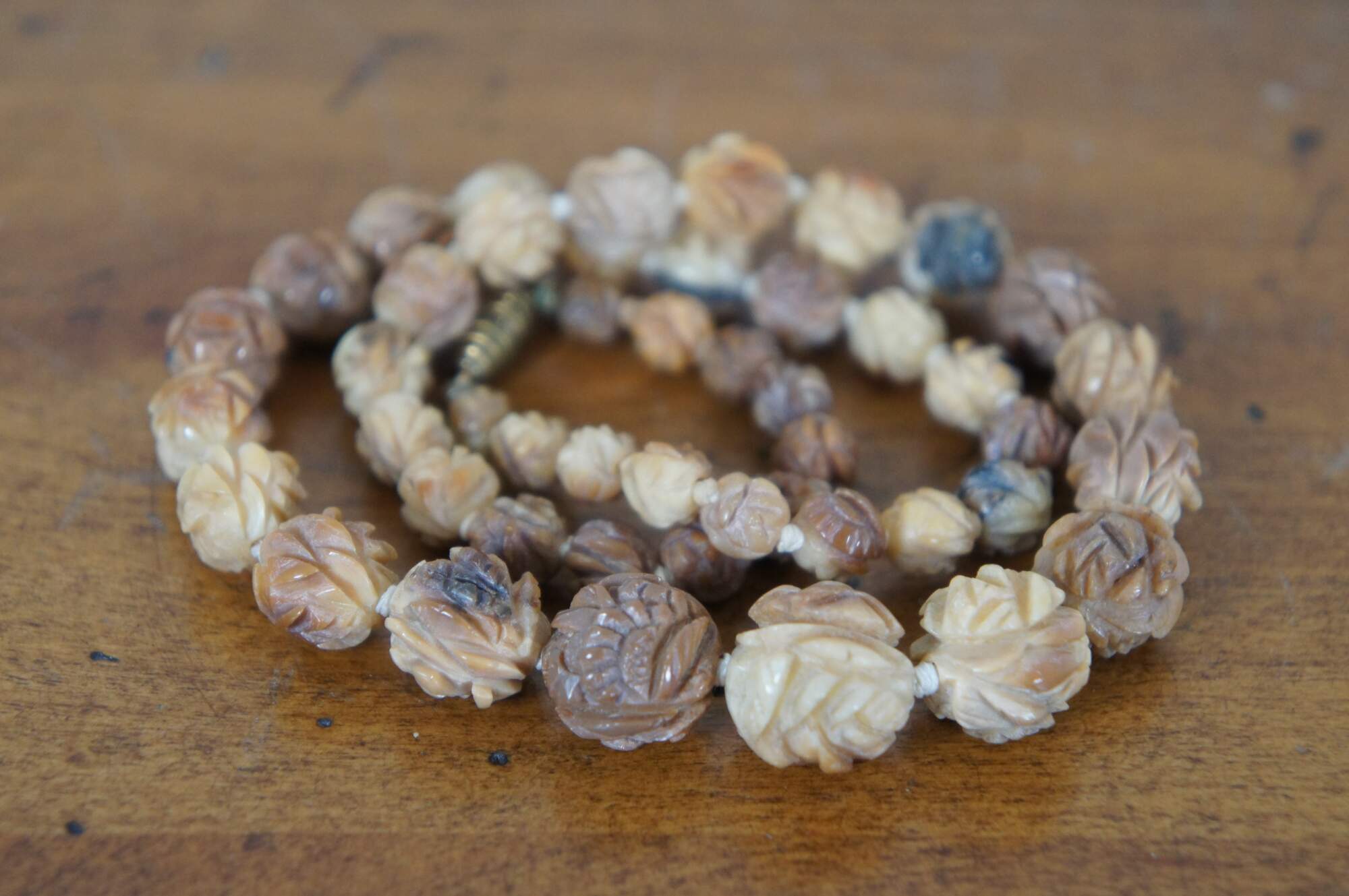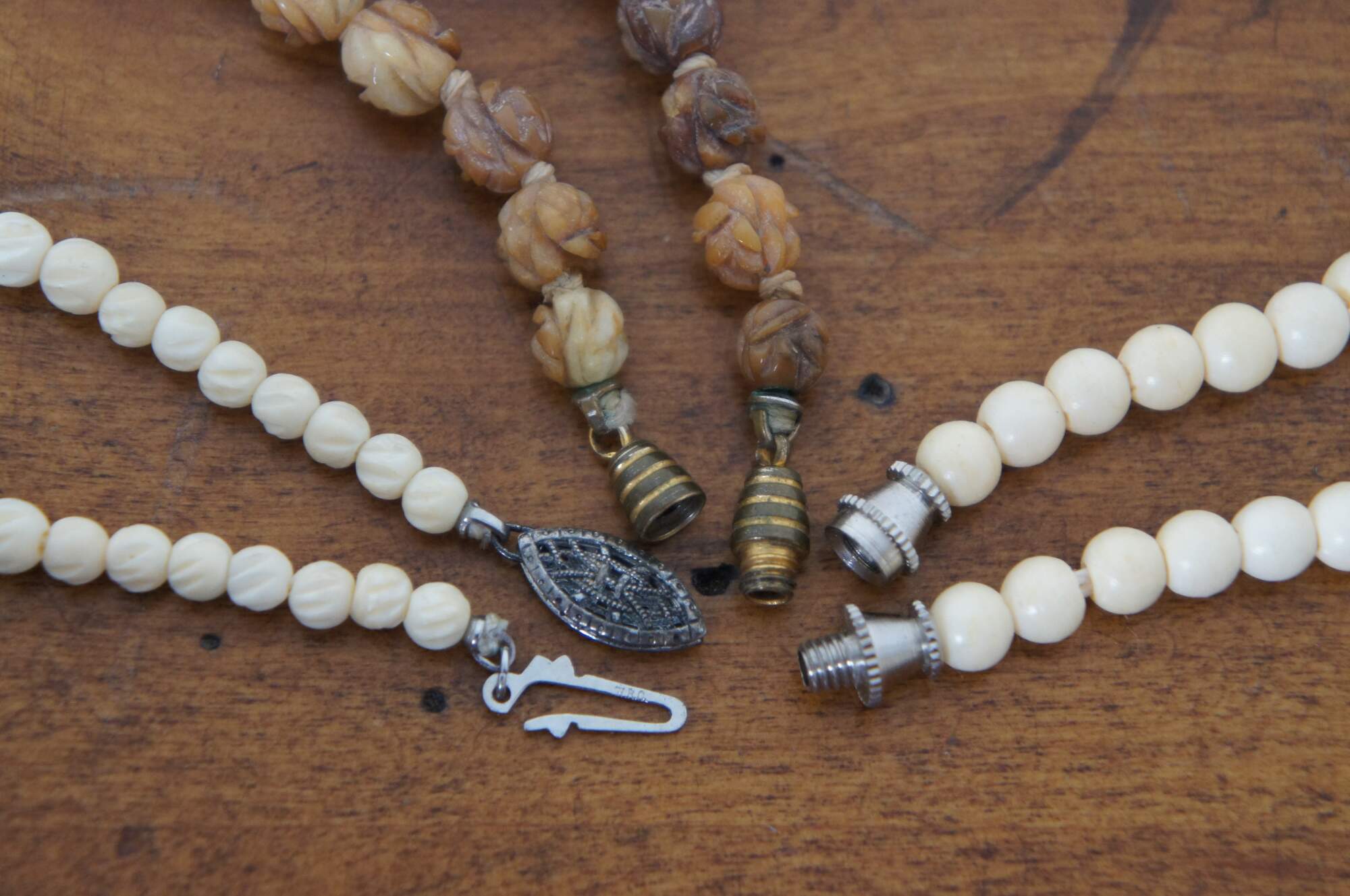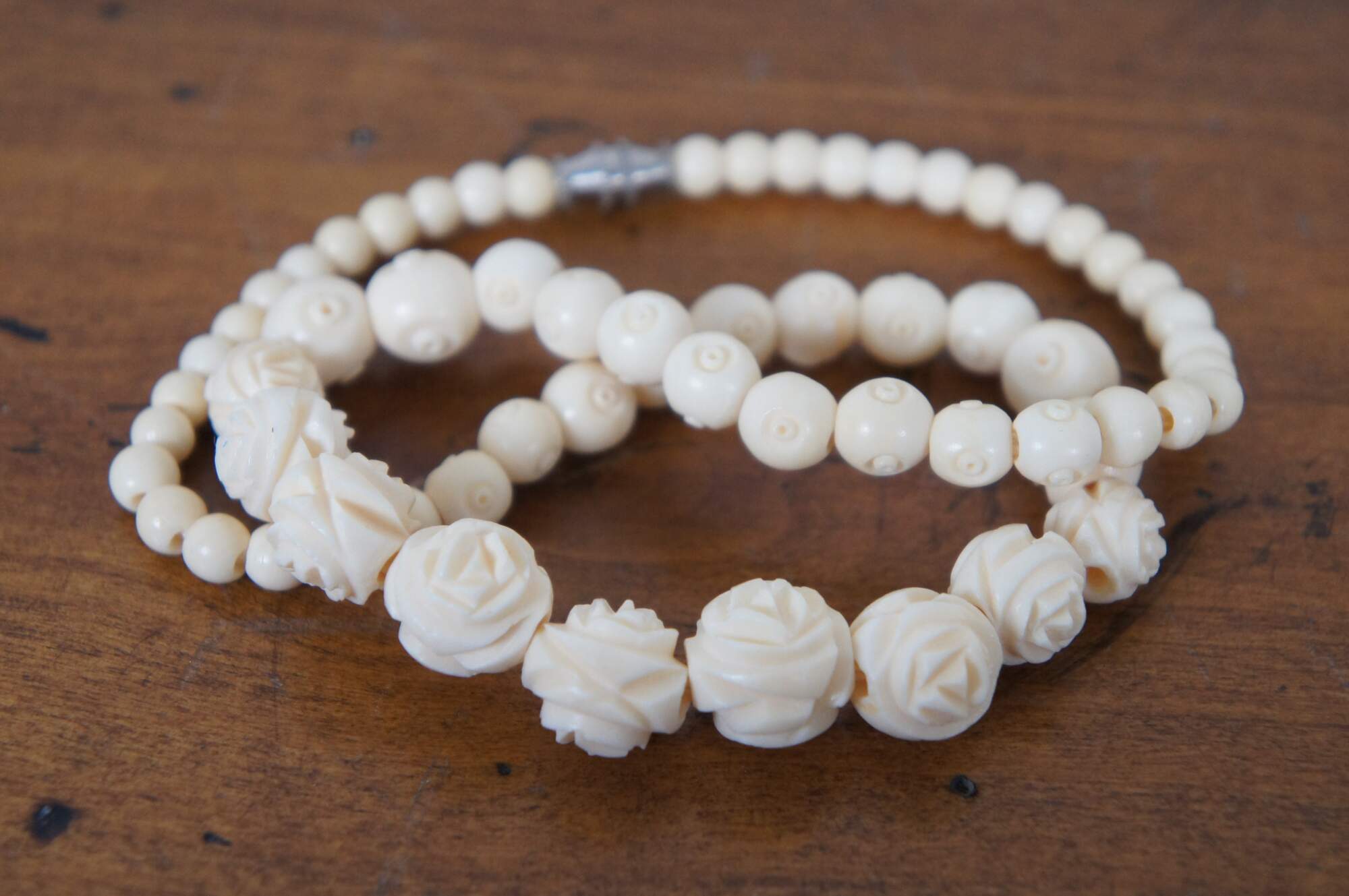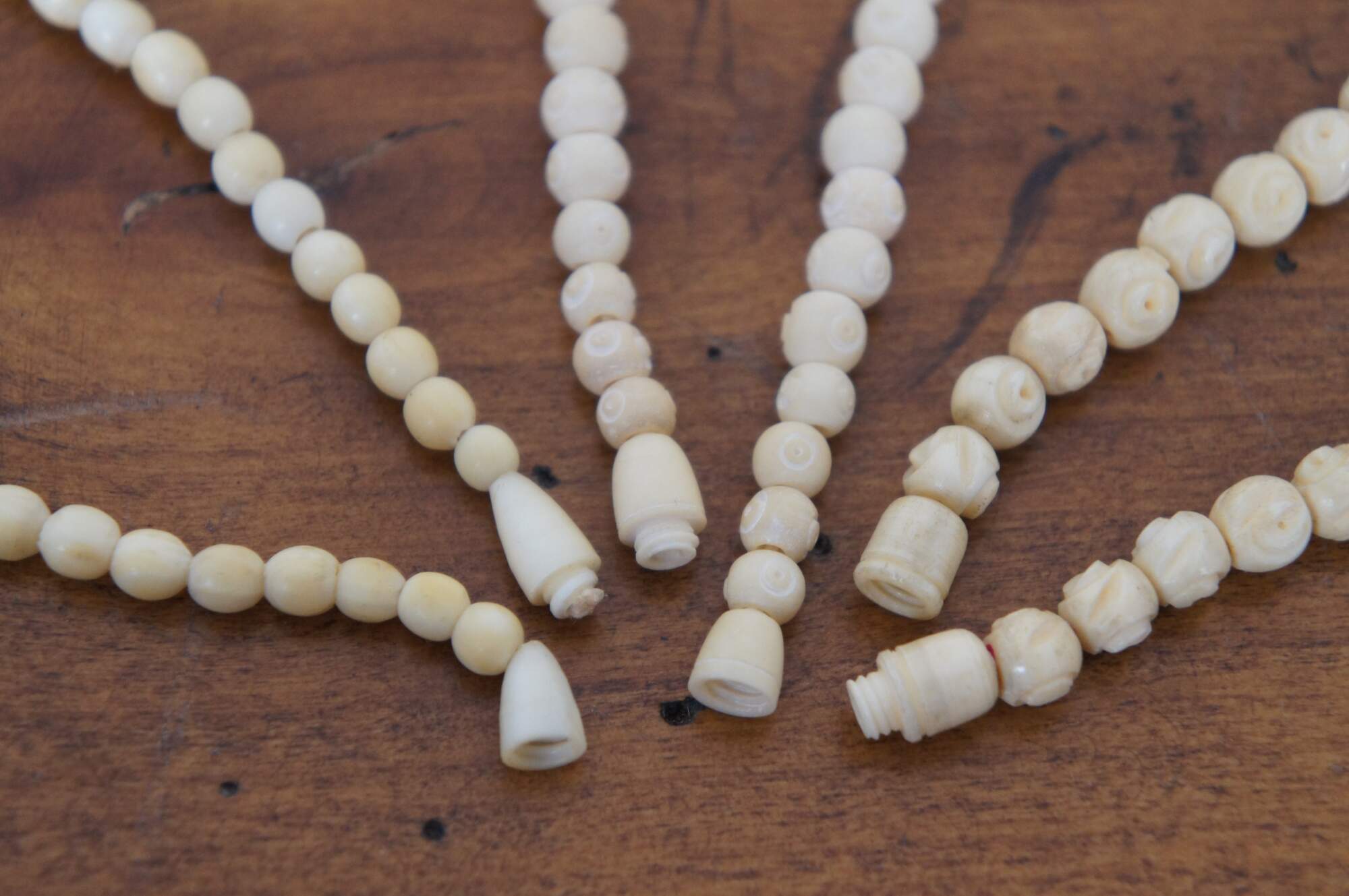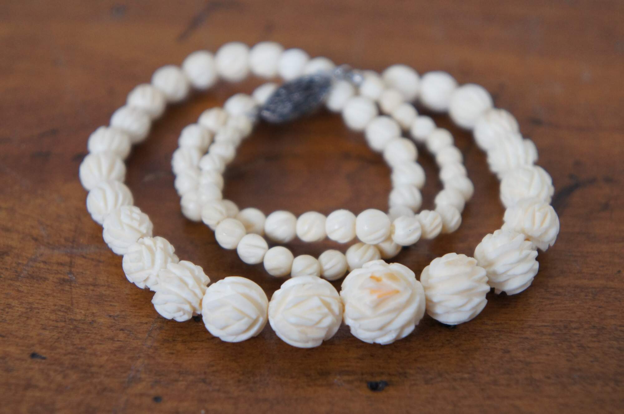 Lot of 6 antique and vintage necklaces crafted of round, floral, graduated carved bone beads and barrel clasps.