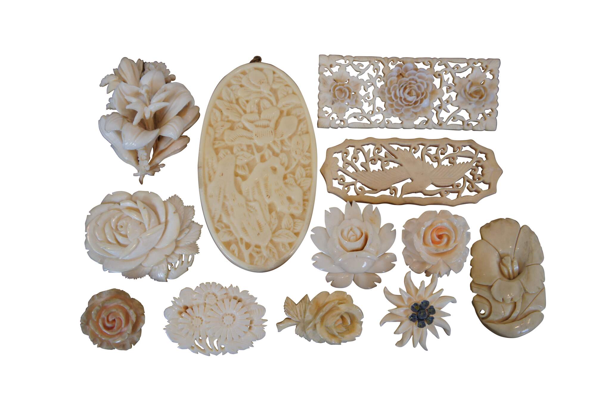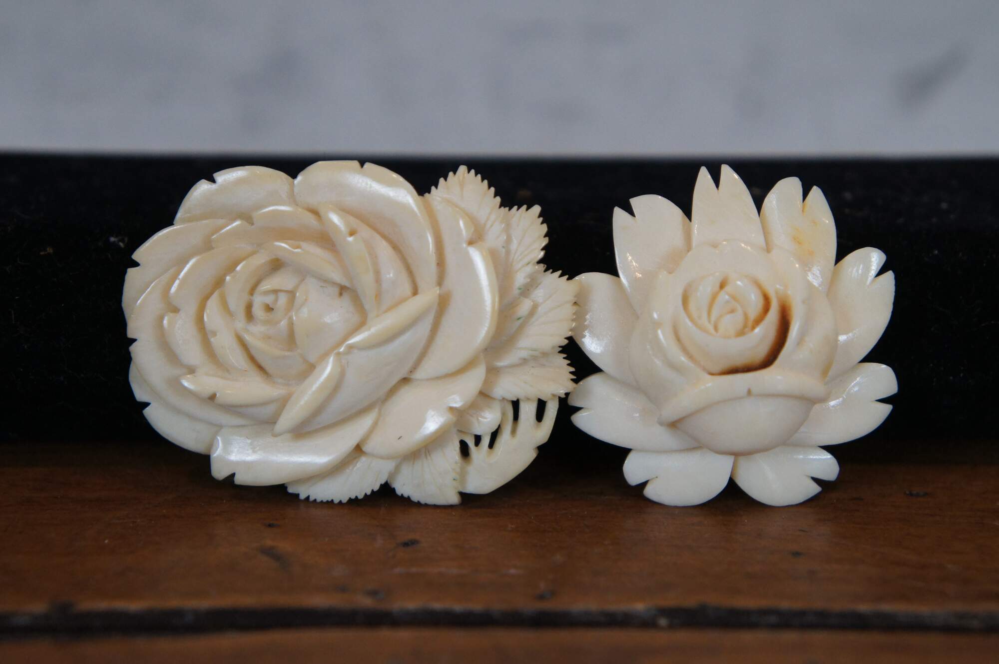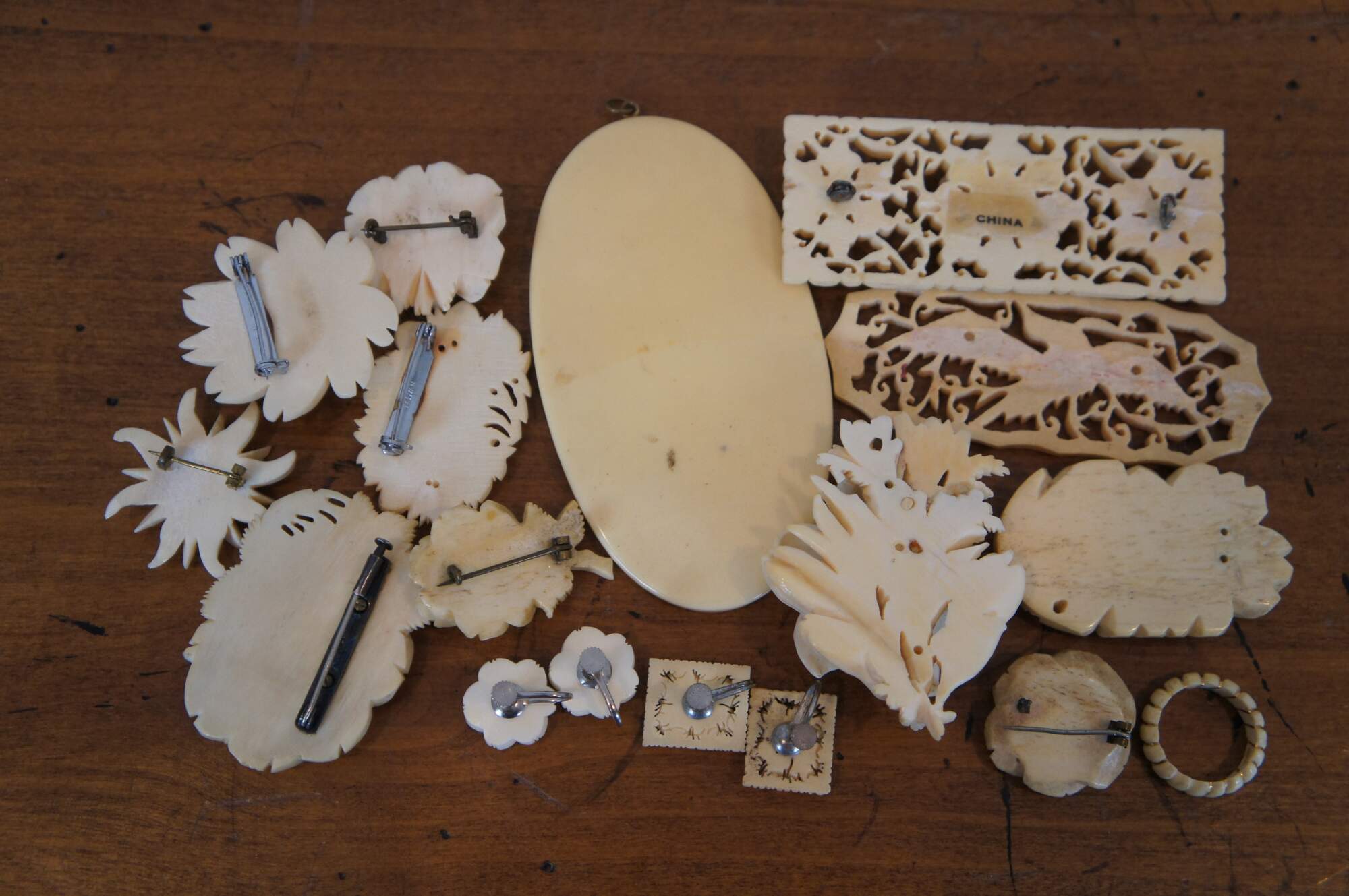 Lot of 17 early to mid 20th century hand carved bone jewelry pieces including two pairs of rose / flower screw back earrings, one rope twist ring, six rose pins / brooches, one morning glory brooch, one edelweiss brooch, one daisy brooch, one lily brooch, one bird brooch, and one large floral pendant that may actually be Bakelite.