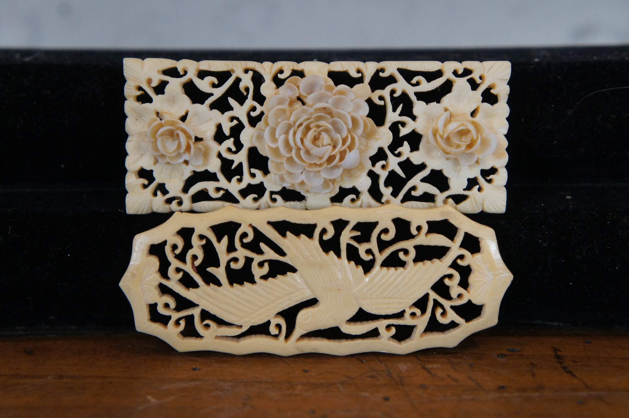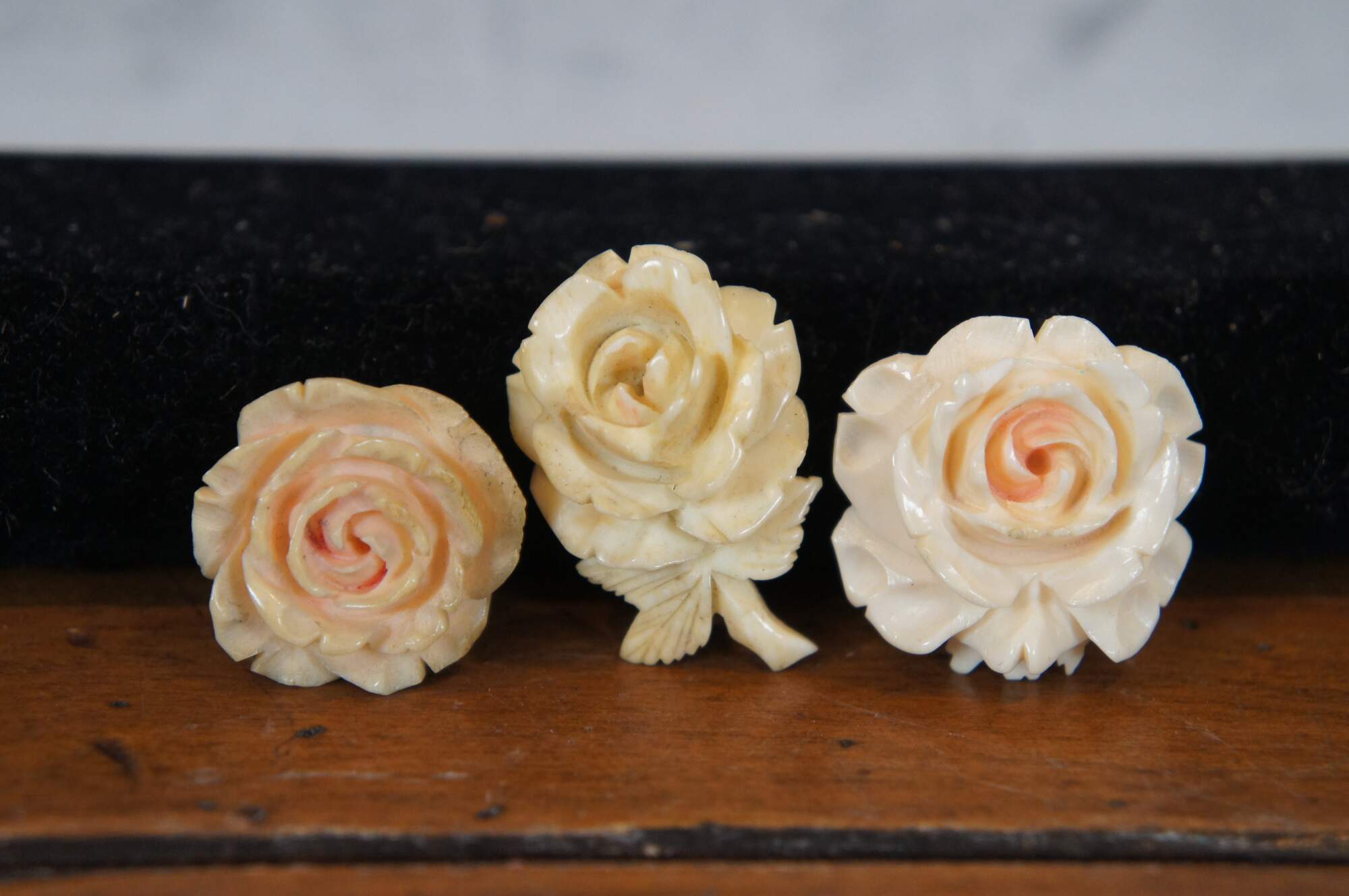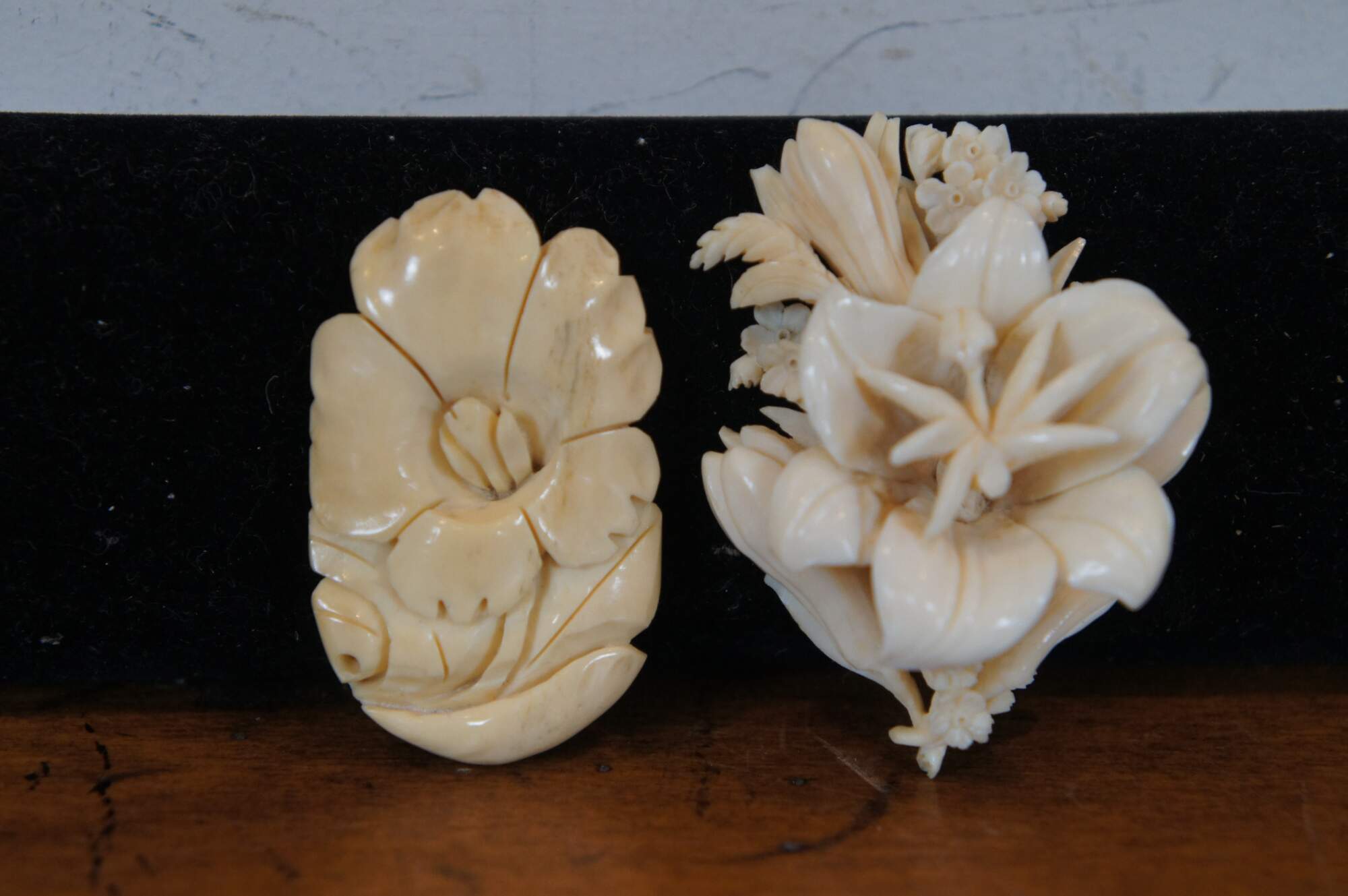 Lot of 17 early to mid 20th century hand carved bone jewelry pieces including two pairs of rose / flower screw back earrings, one rope twist ring, six rose pins / brooches, one morning glory brooch, one edelweiss brooch, one daisy brooch, one lily brooch, one bird brooch, and one large floral pendant that may actually be Bakelite.