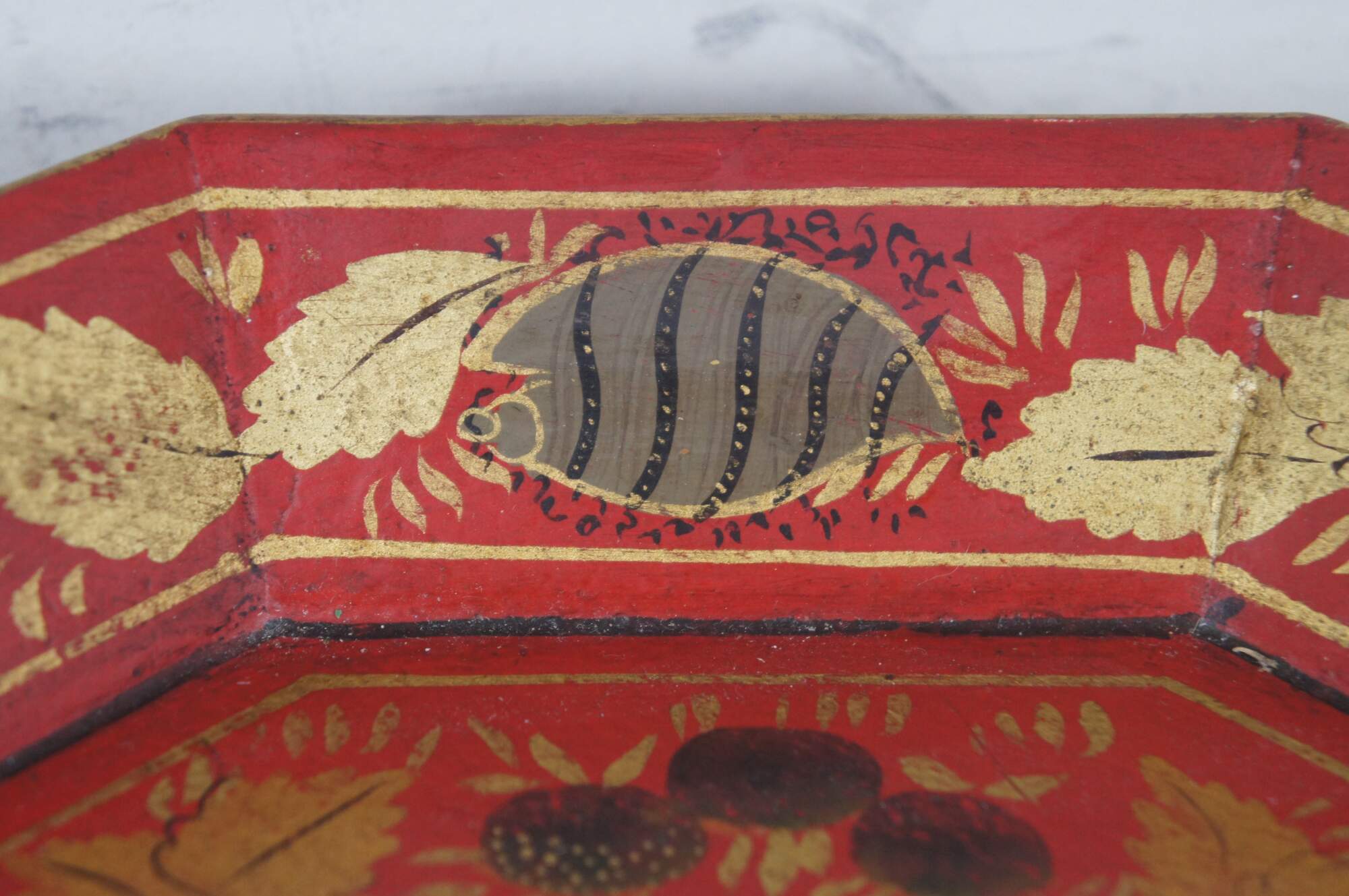 Vintage red toleware octagonal / rectangular butler serving tray, stenciled / hand painted with gold and black leaves and berries. Felt pads have been added to base to protect surfaces.