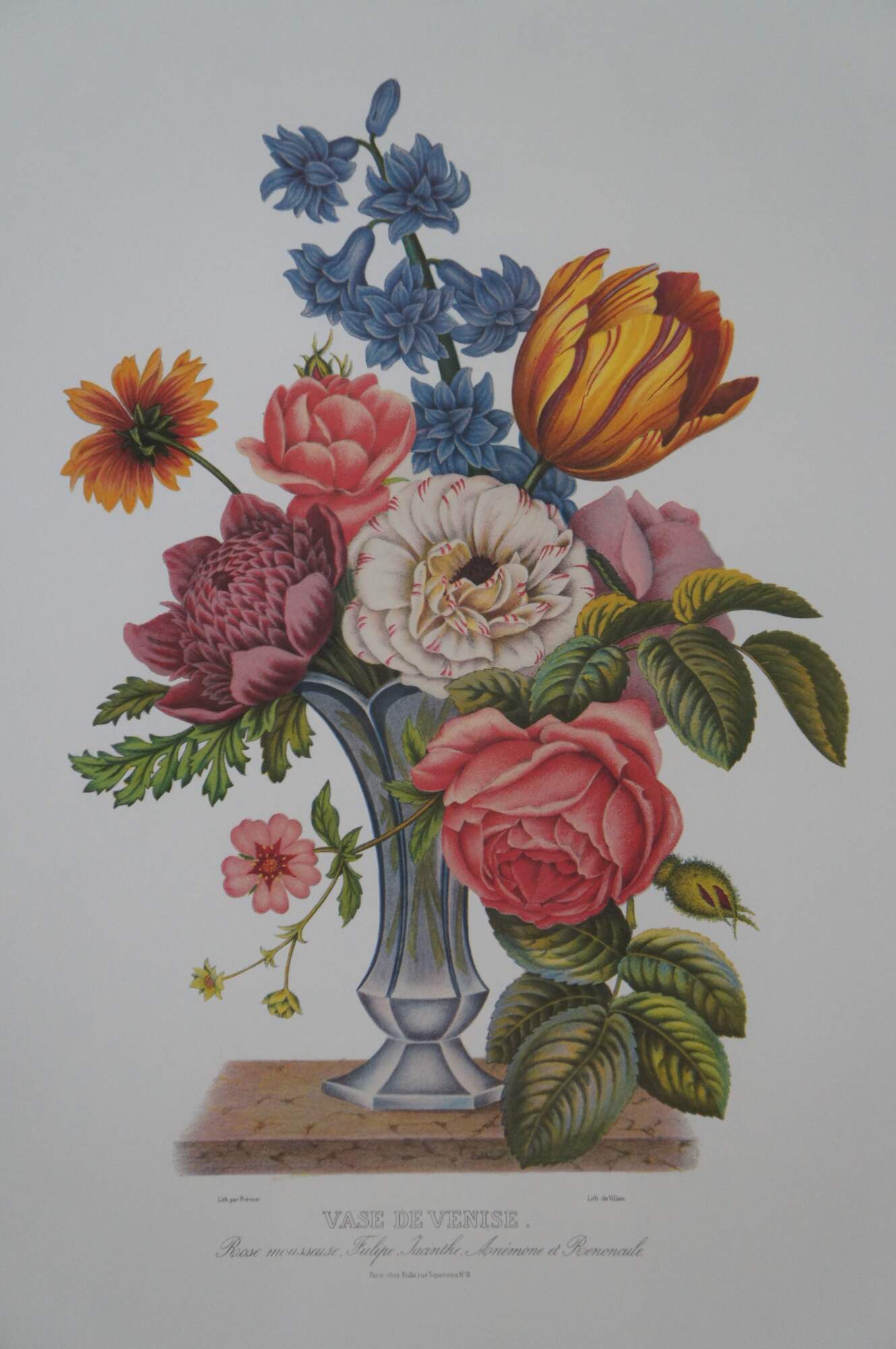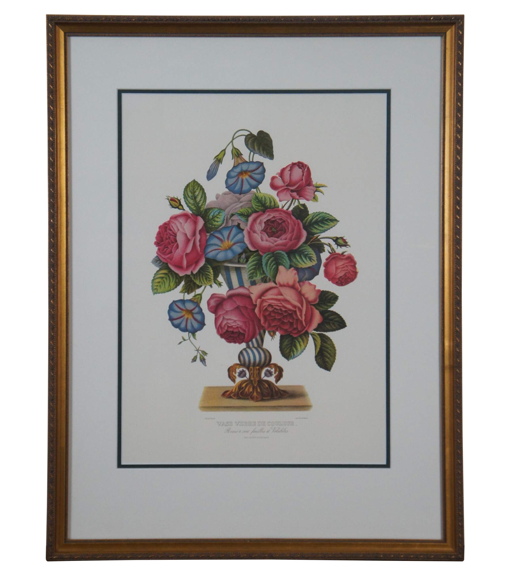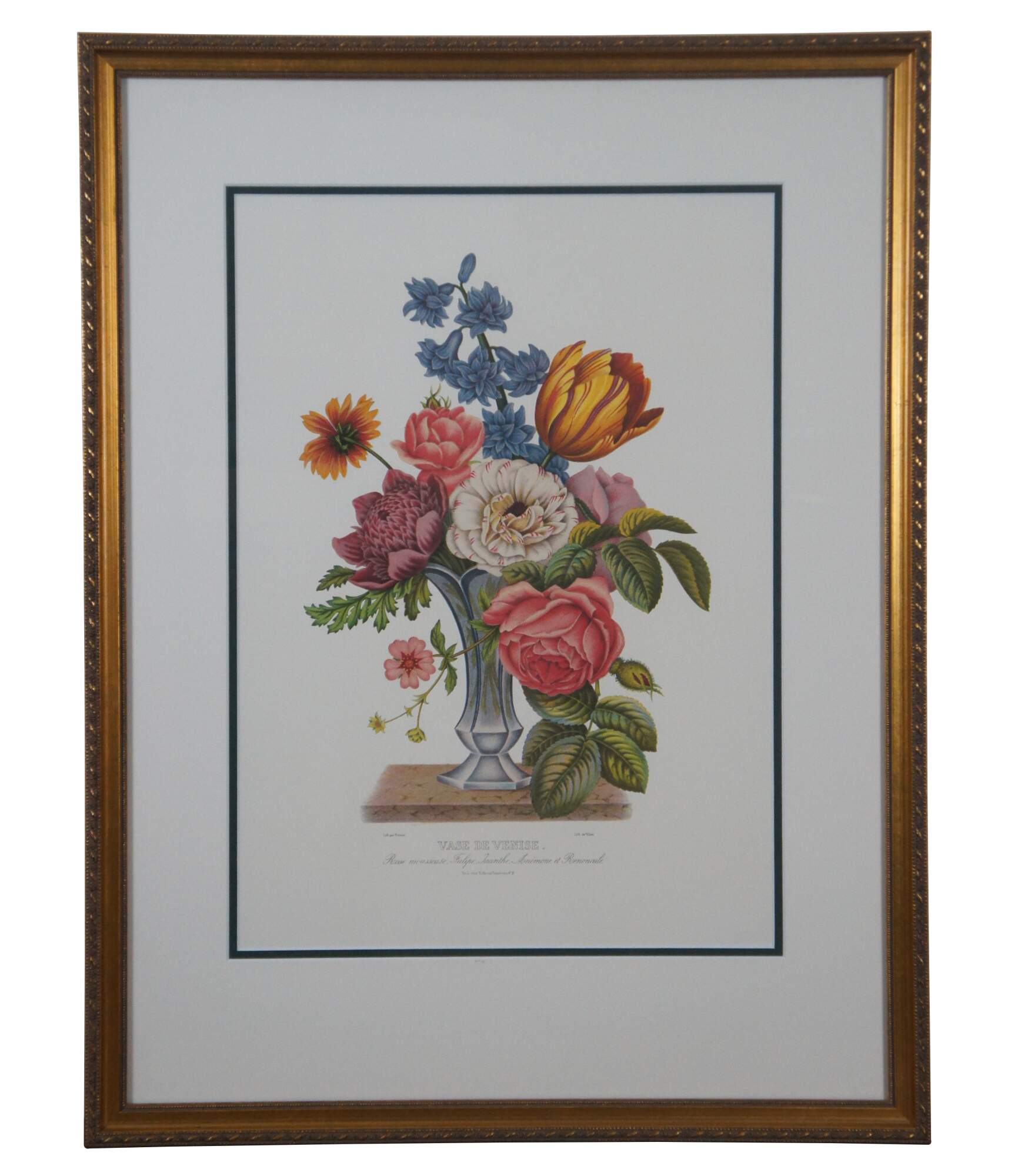 Pair of vintage reproduction prints of lithographs by Jean Louis Prevost, Vase de Venise and Vase Verre de Couleur. Jean Louis Prevost (1760 - 1810) was active/lived in France. Jean Prevost is known for Floral still life, botanical painting.