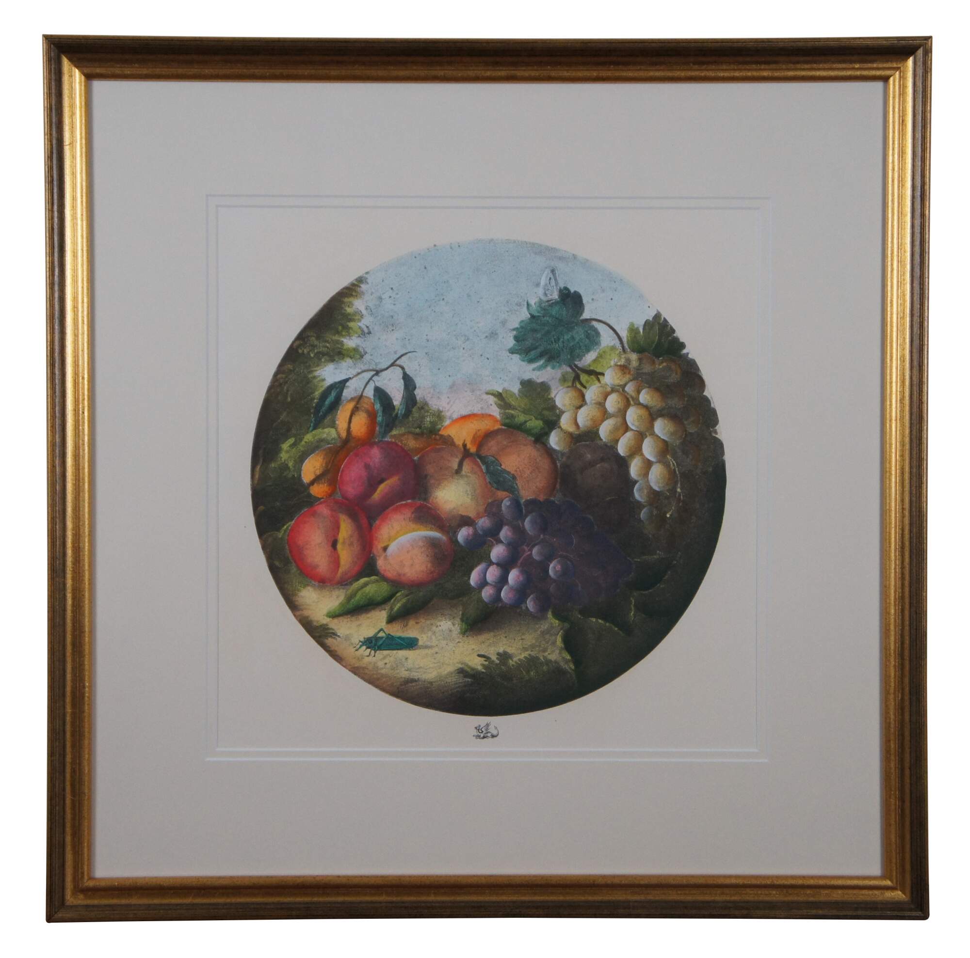 Pair of vintage lithograph prints showing still life of fruit (grapes, peaches, apples, oranges) accented with a grasshopper, a bluebird, and butterflies. Printed as a round image with a makers mark of a dragon reclined beneath.