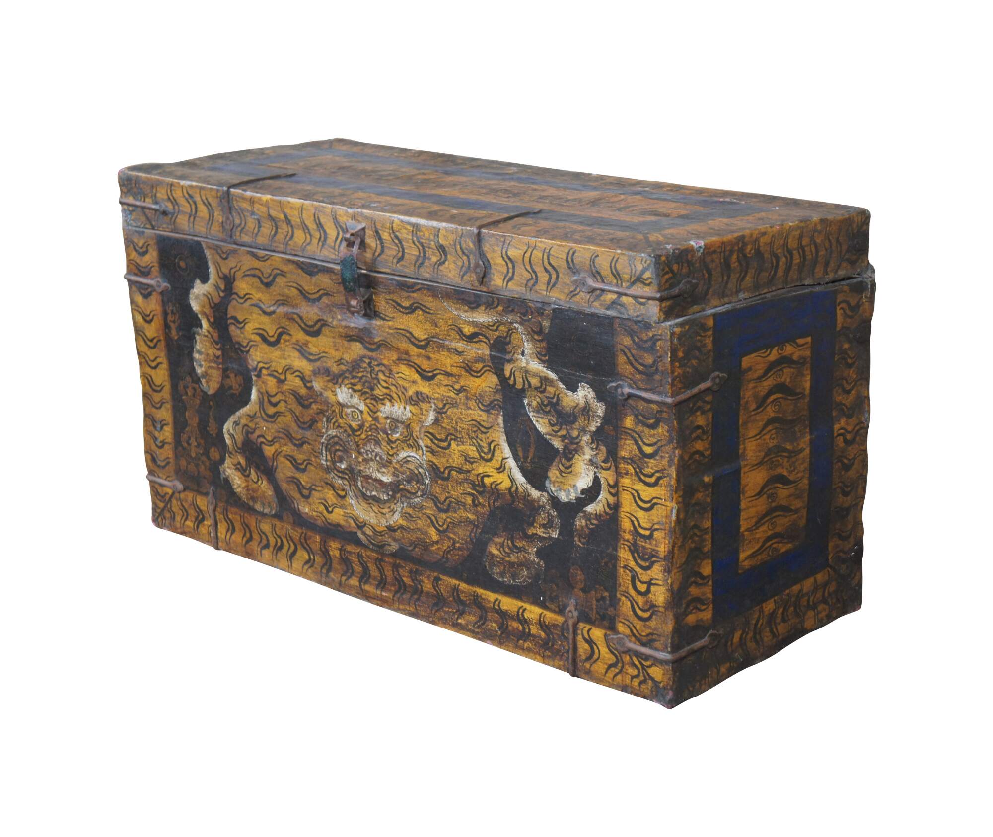 An impressive Tibetan storage from the first quarter of the 20th century. A wooden frame richly finished with lacquered leather hide and banded iron hardware. The front is hand-painted with a tiger at the center and framed in tigere stripes The tops, sides and back have an orange tiger stripe framing with blue framing. Common motifs in Chinese and Tibetan Buddhist art, tigers are symbols of strength, fearlessness, power, and authority.