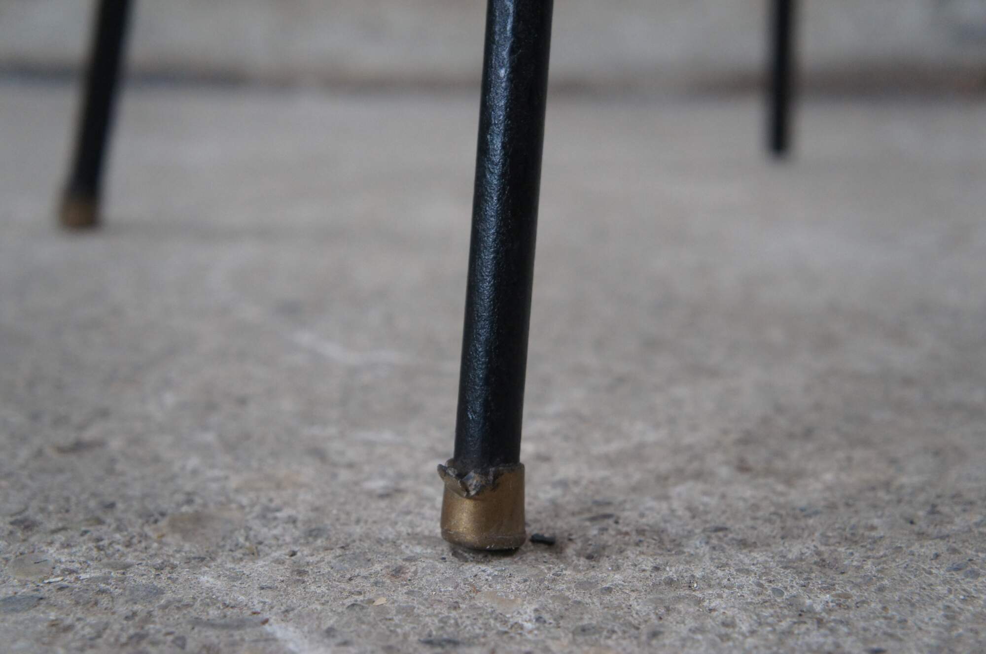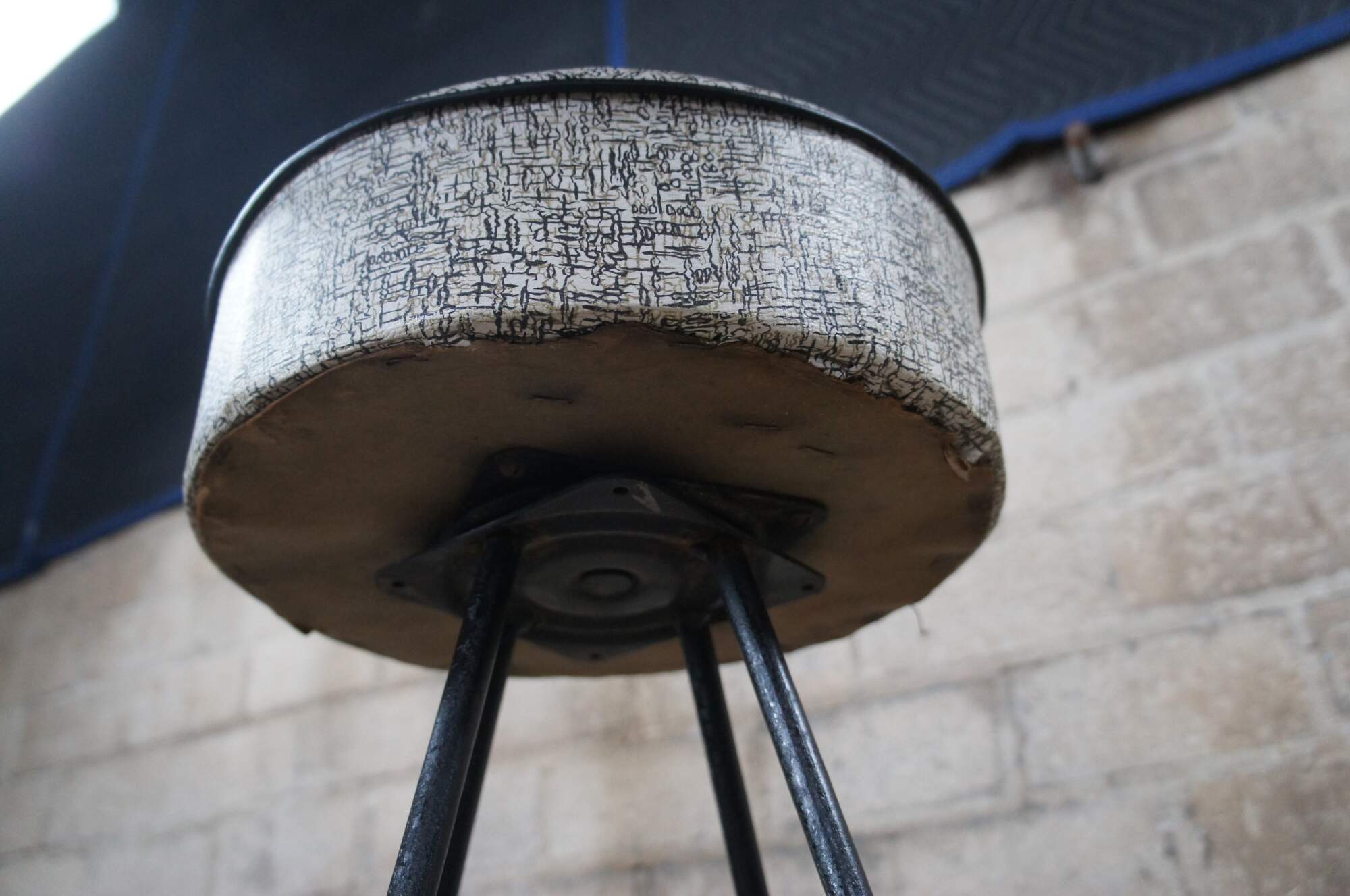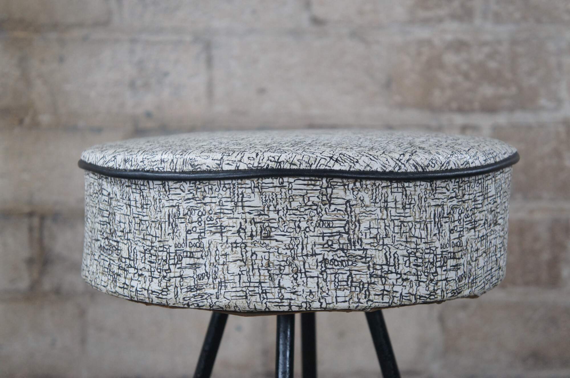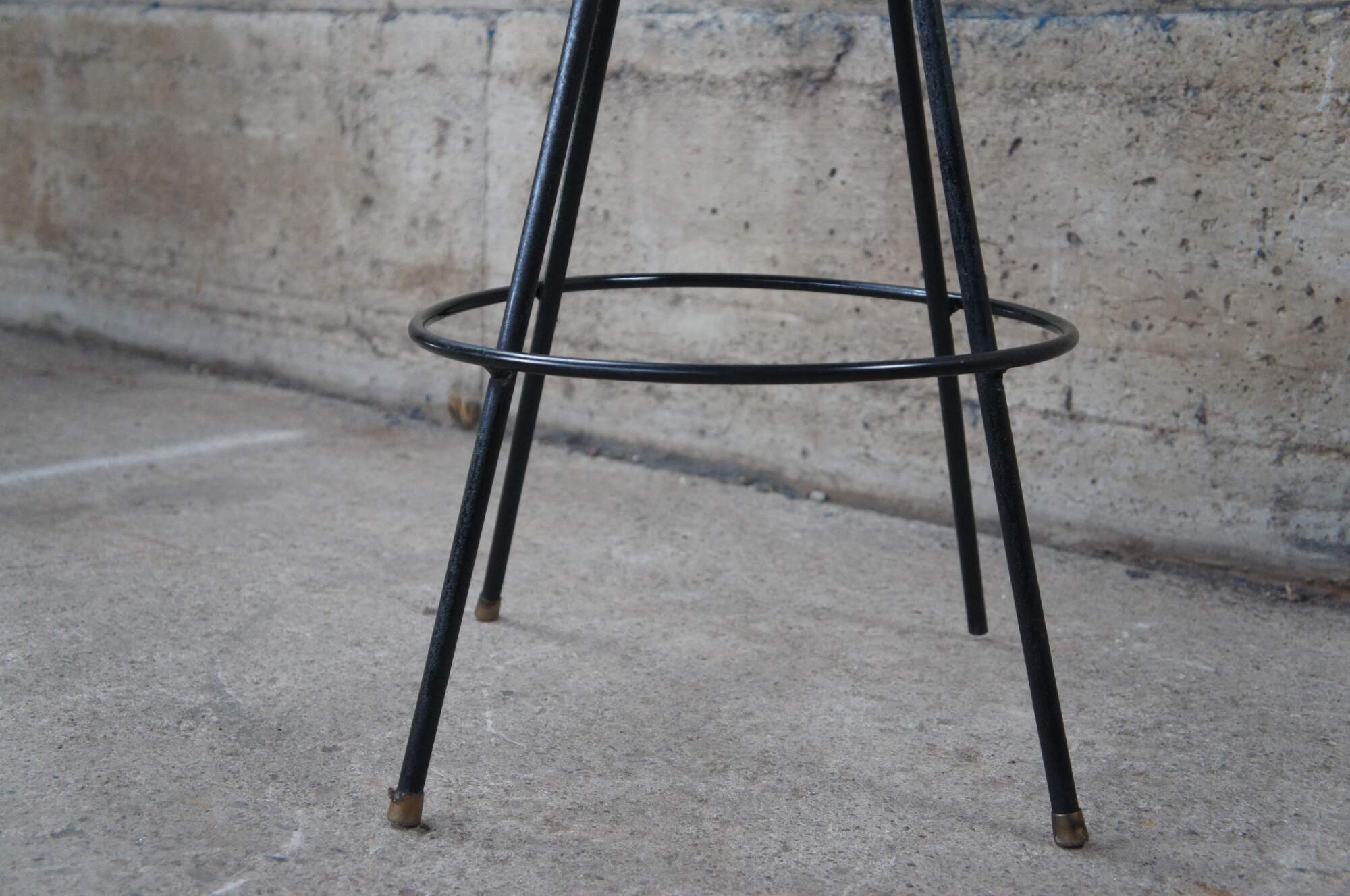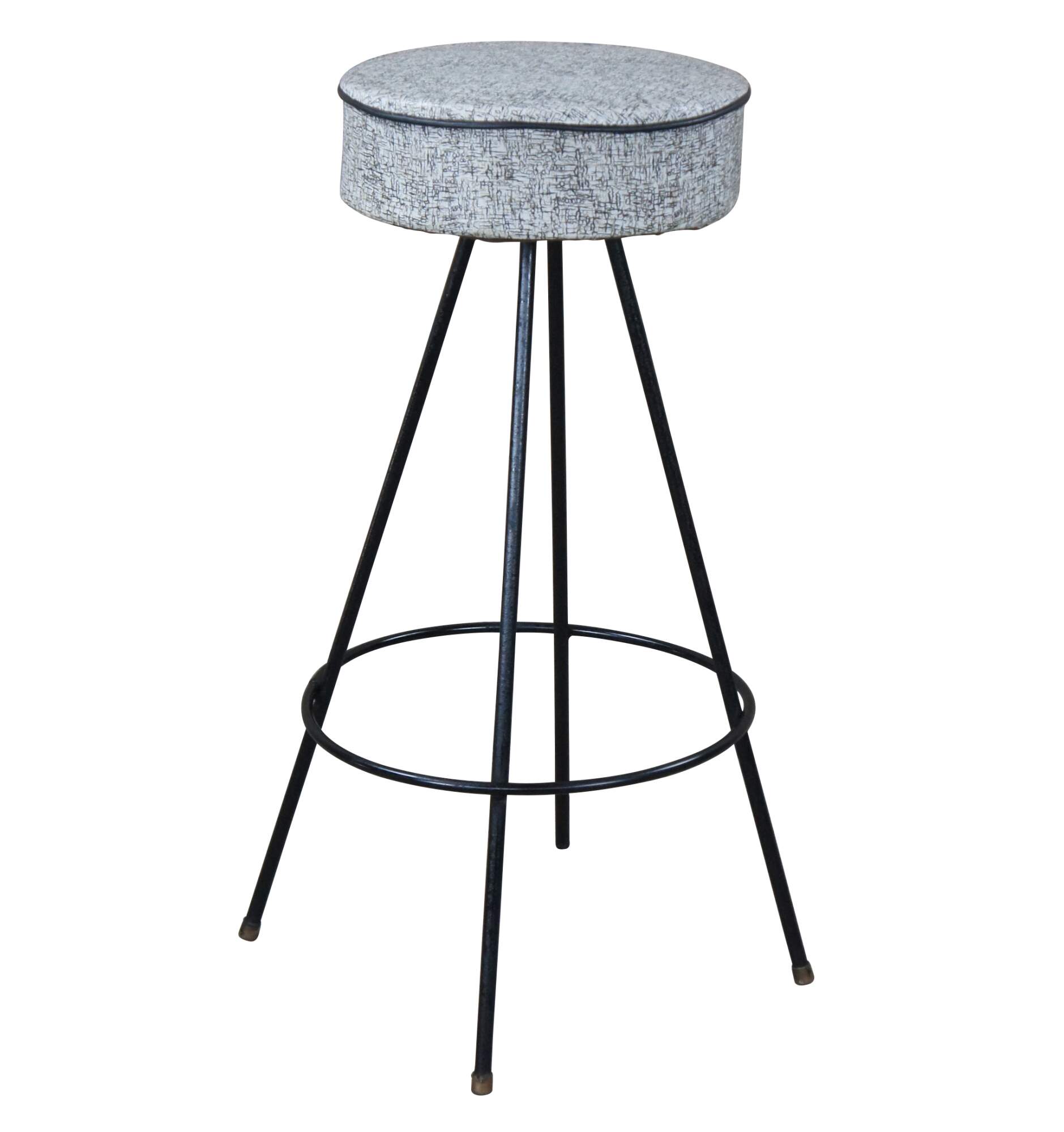 Atomic era bar stools. Made from wrought iron with a vinyl seat. Features a round seat over 4 legs leading to foot rest and capped feet.