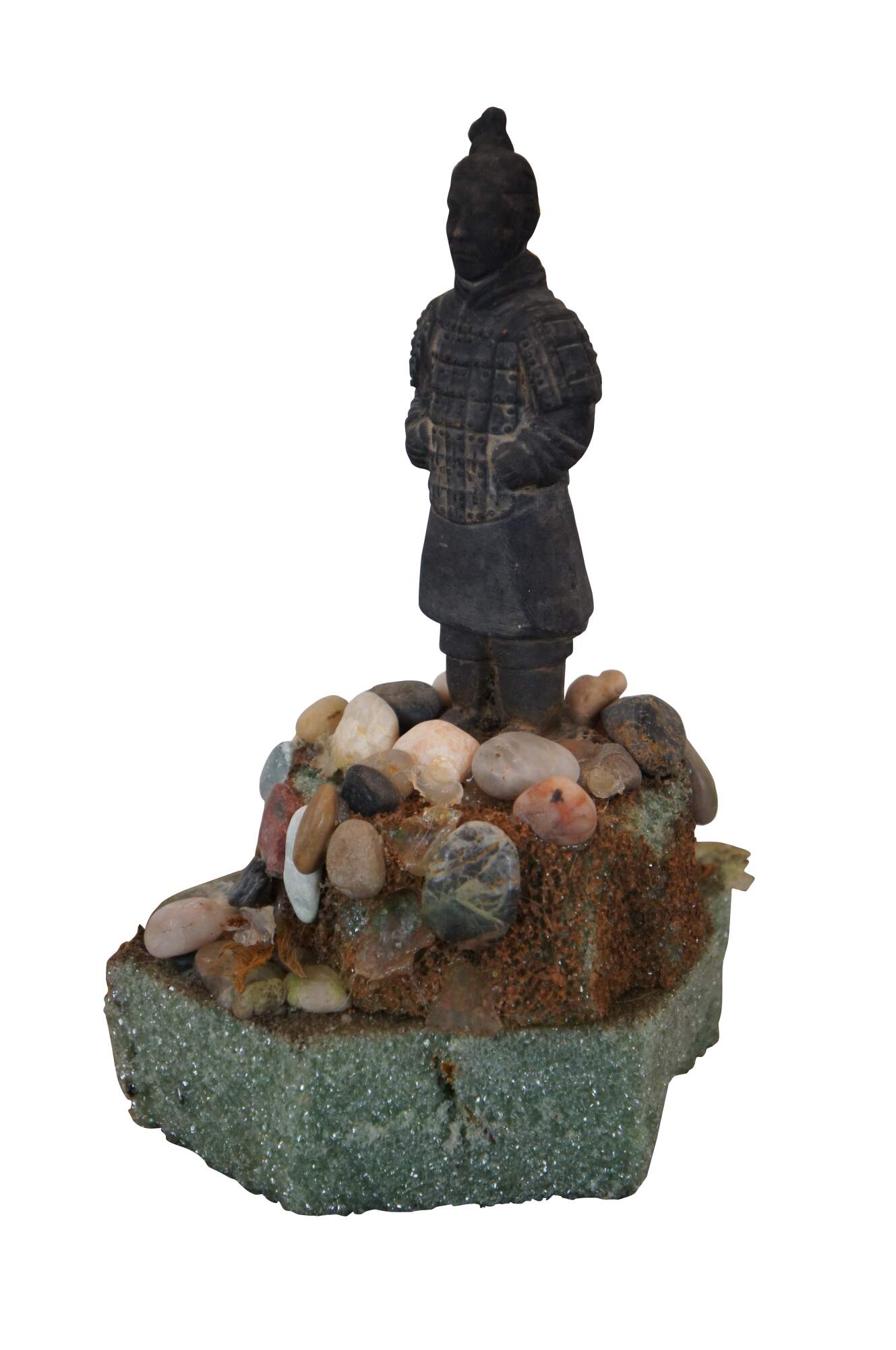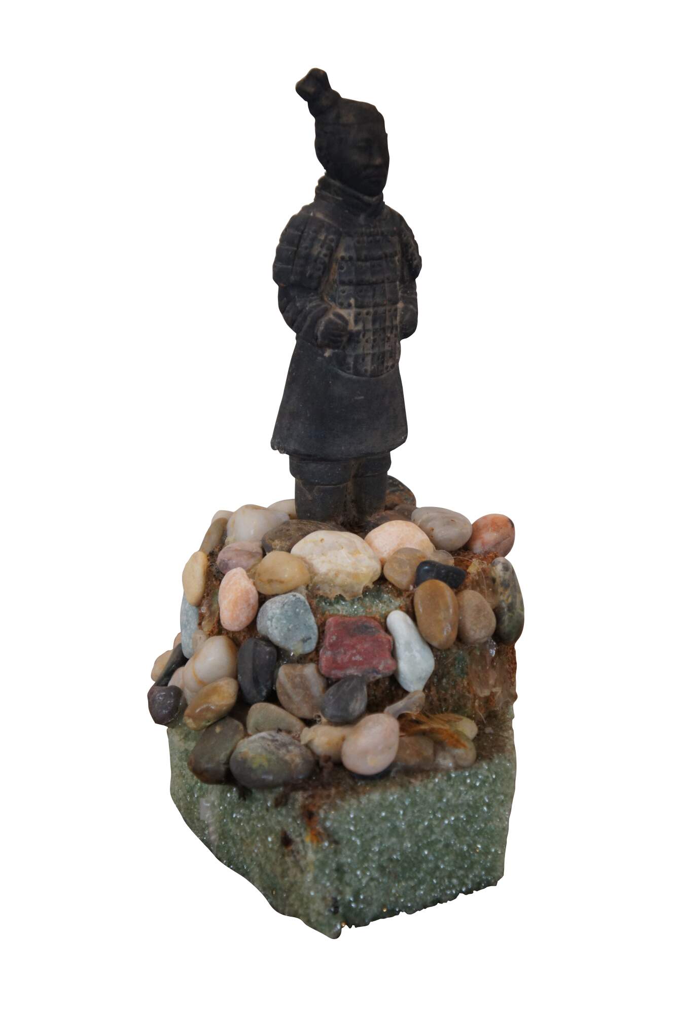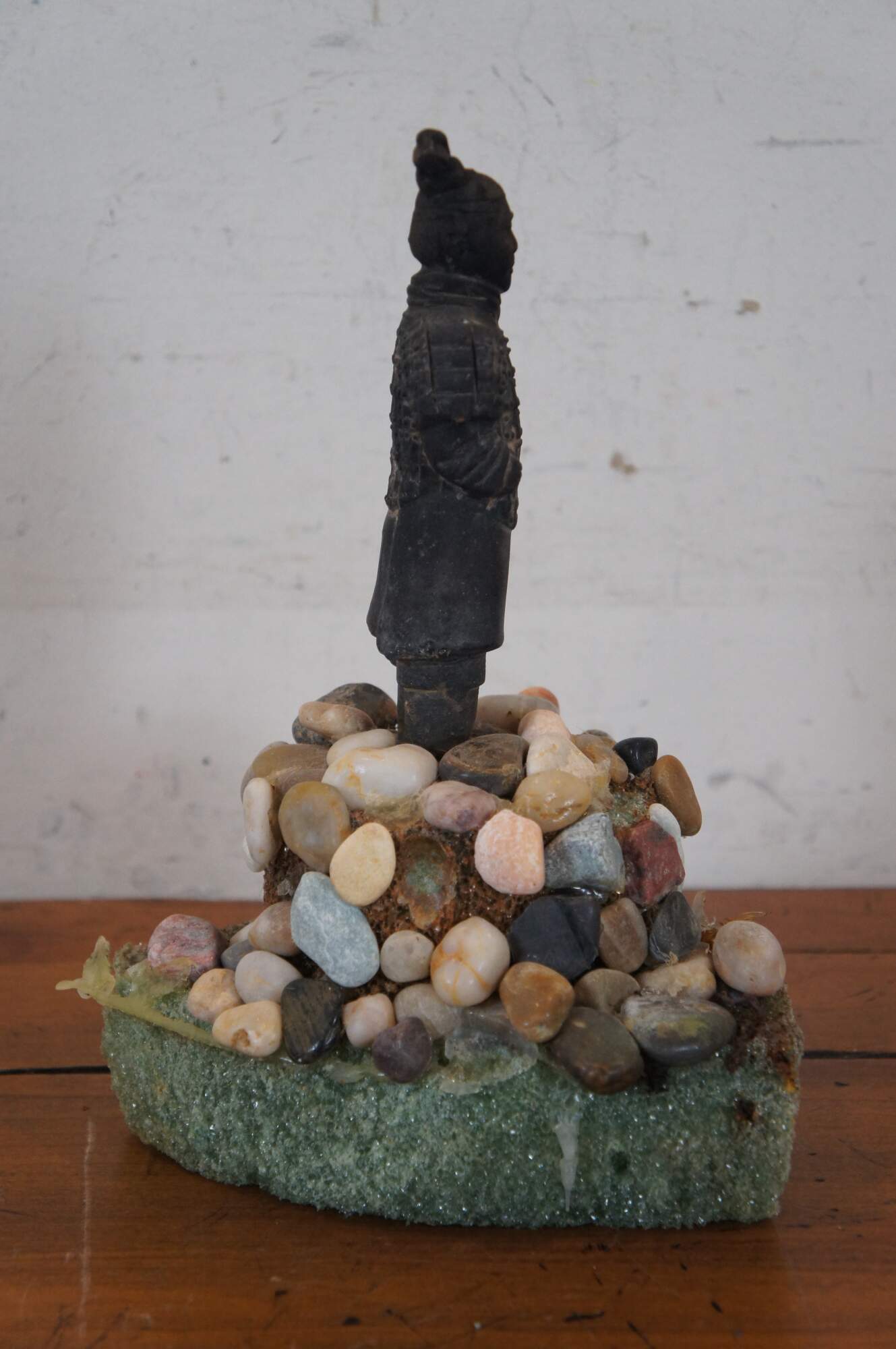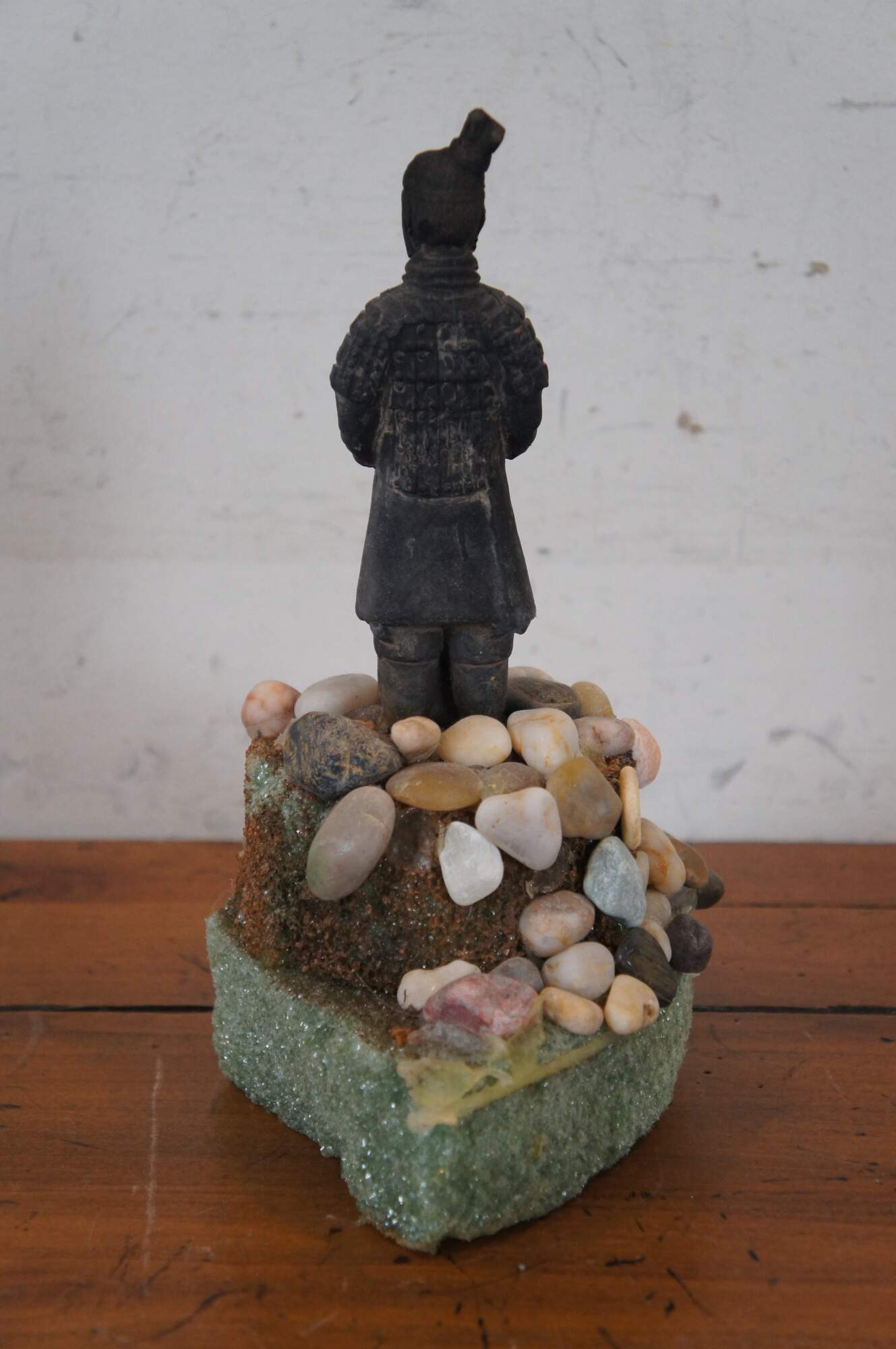 Vintage Chinese terra cotta soldier figurine, standing on / attached to a piece if garden styrofoam covered in small stones / rocks.