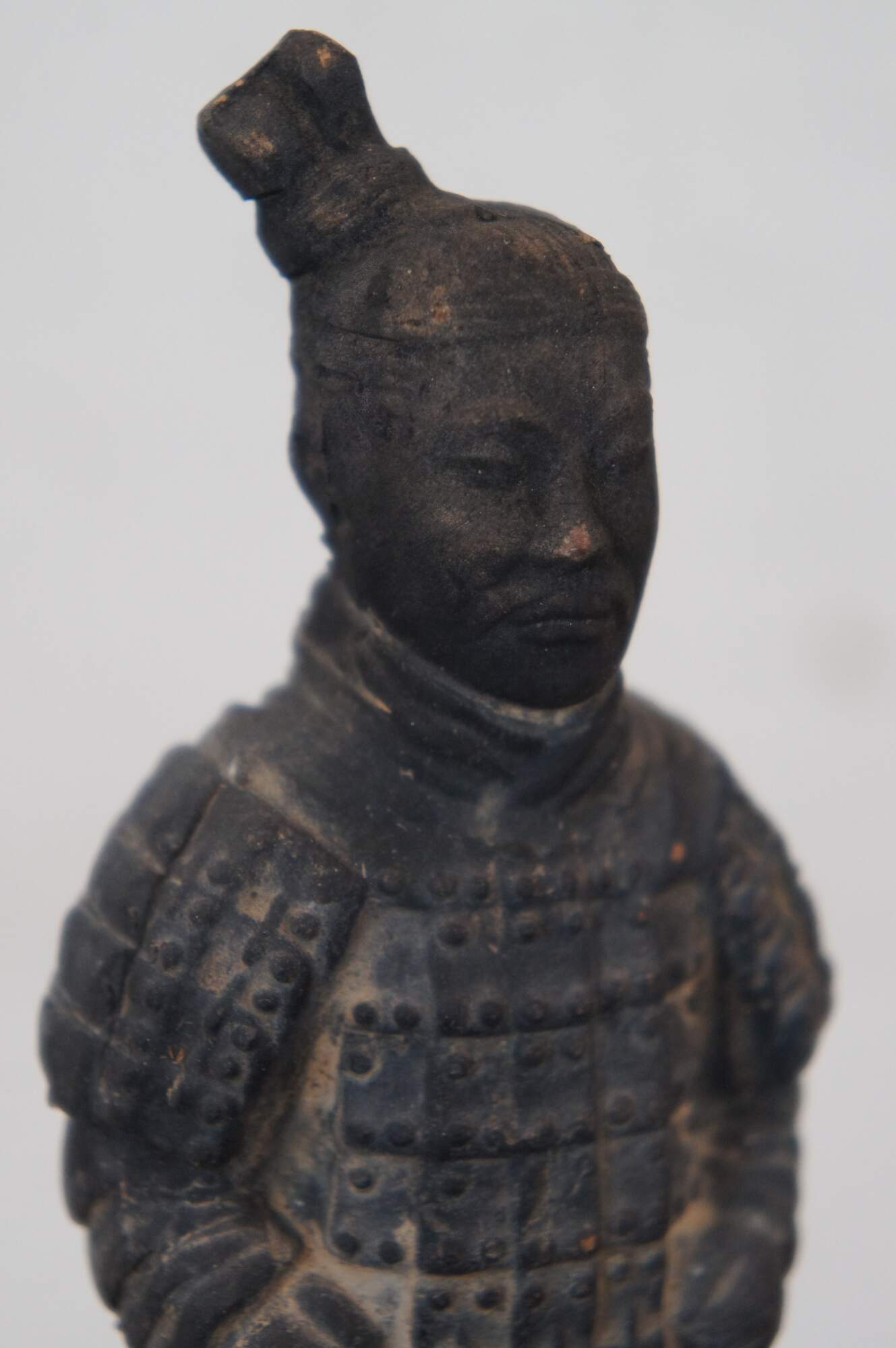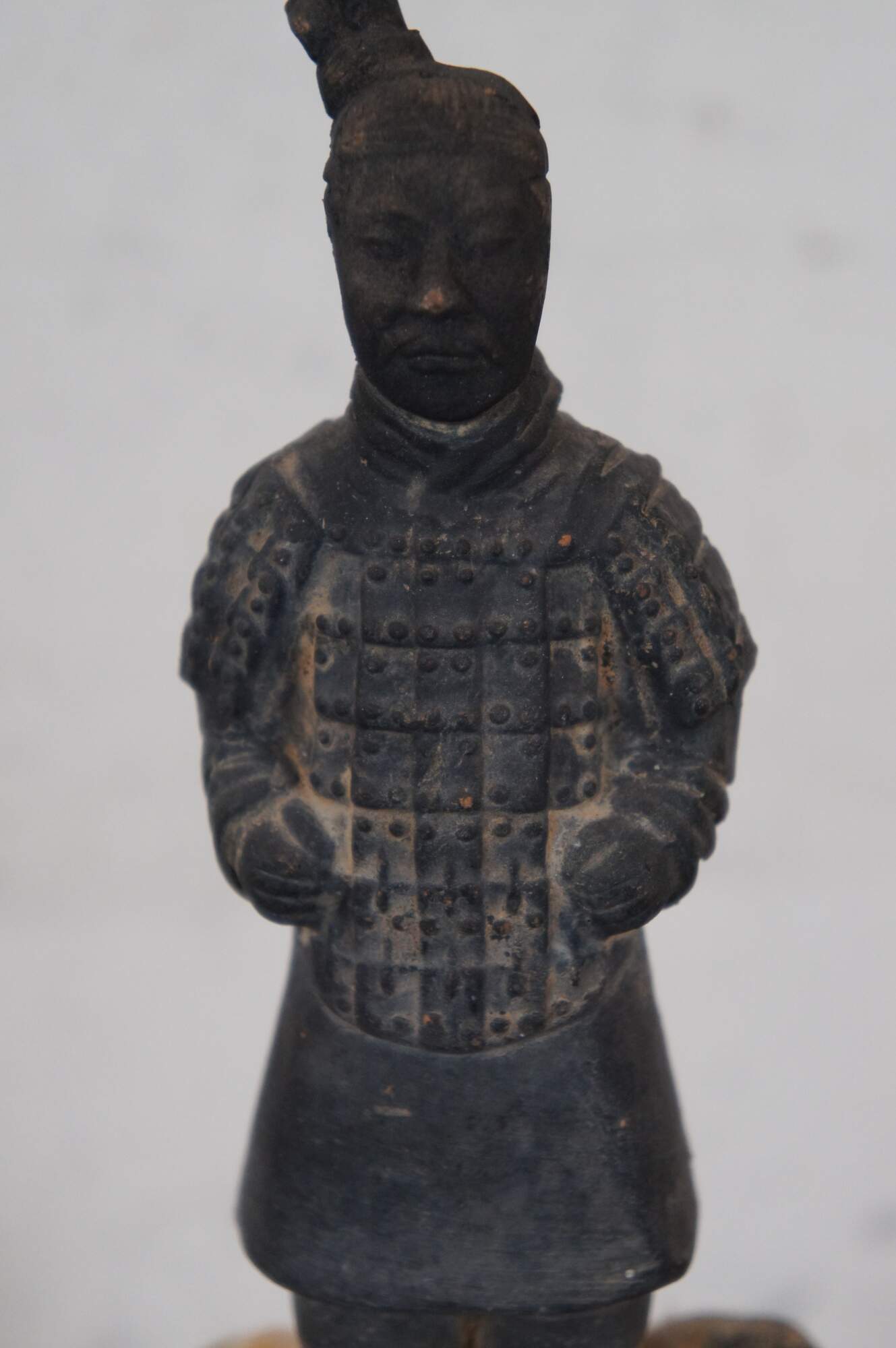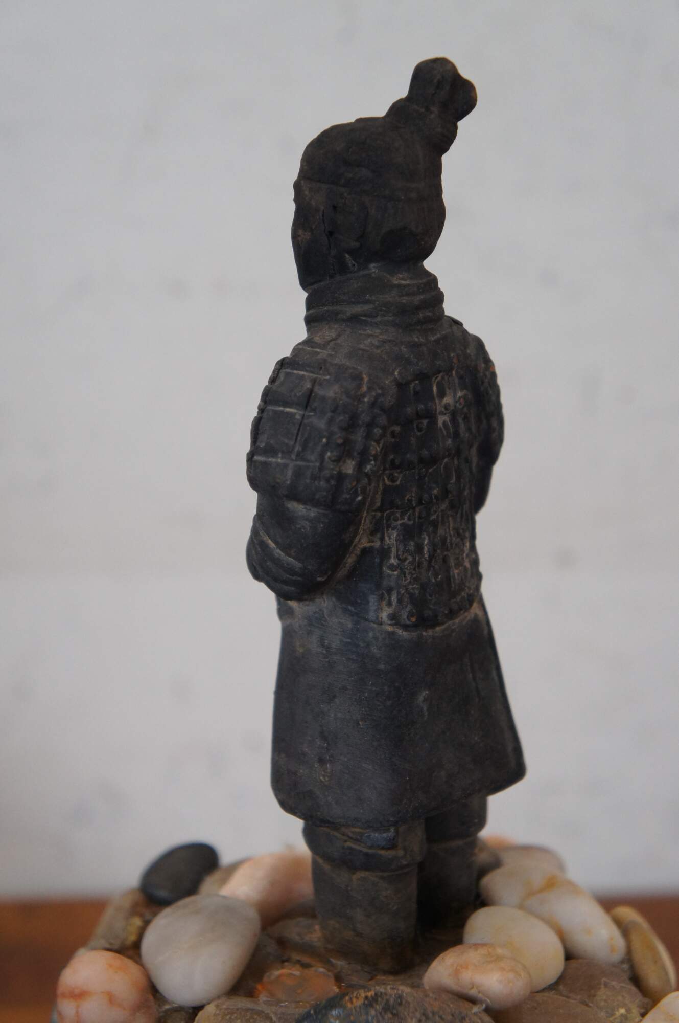 Vintage Chinese terra cotta soldier figurine, standing on / attached to a piece if garden styrofoam covered in small stones / rocks.