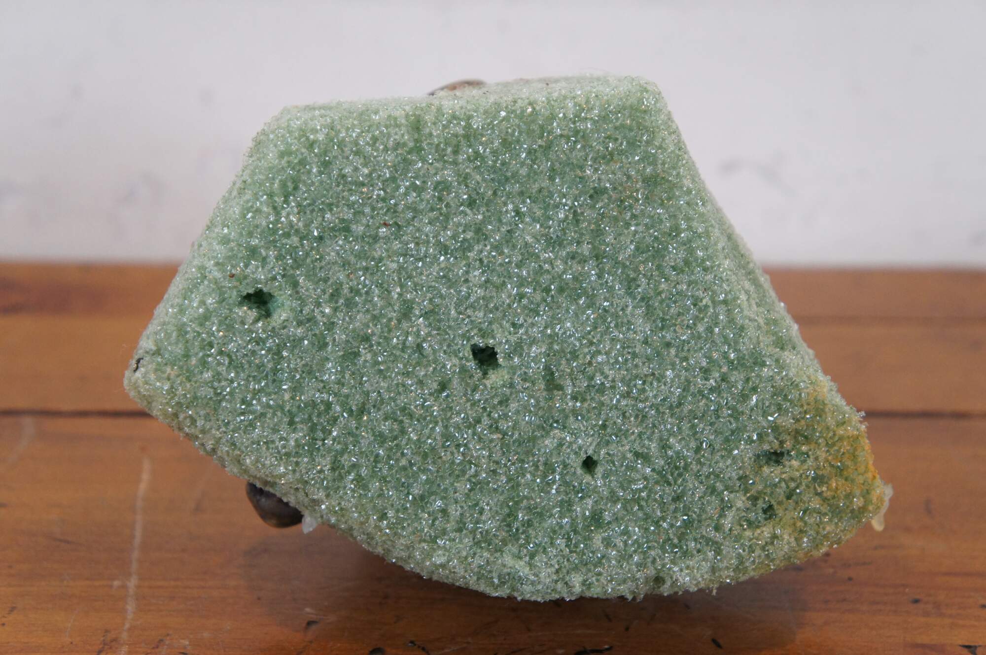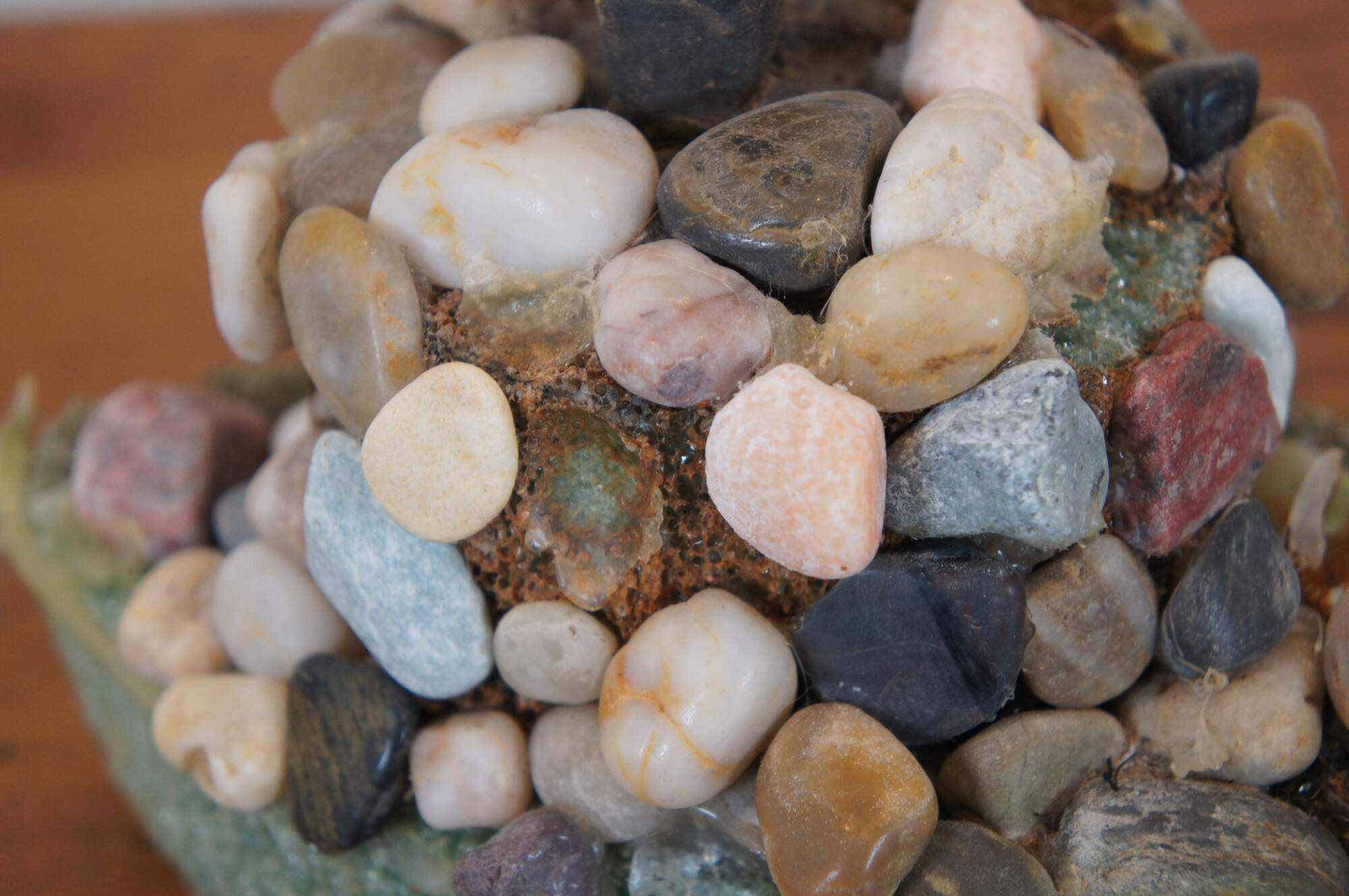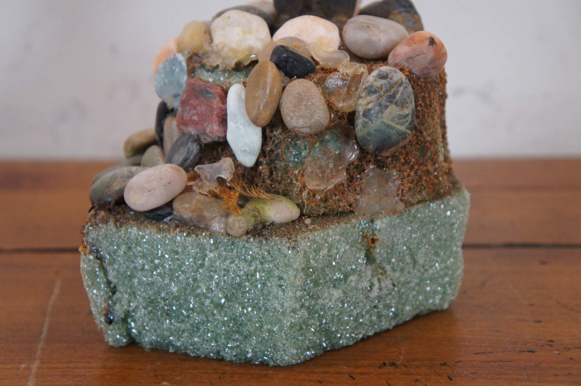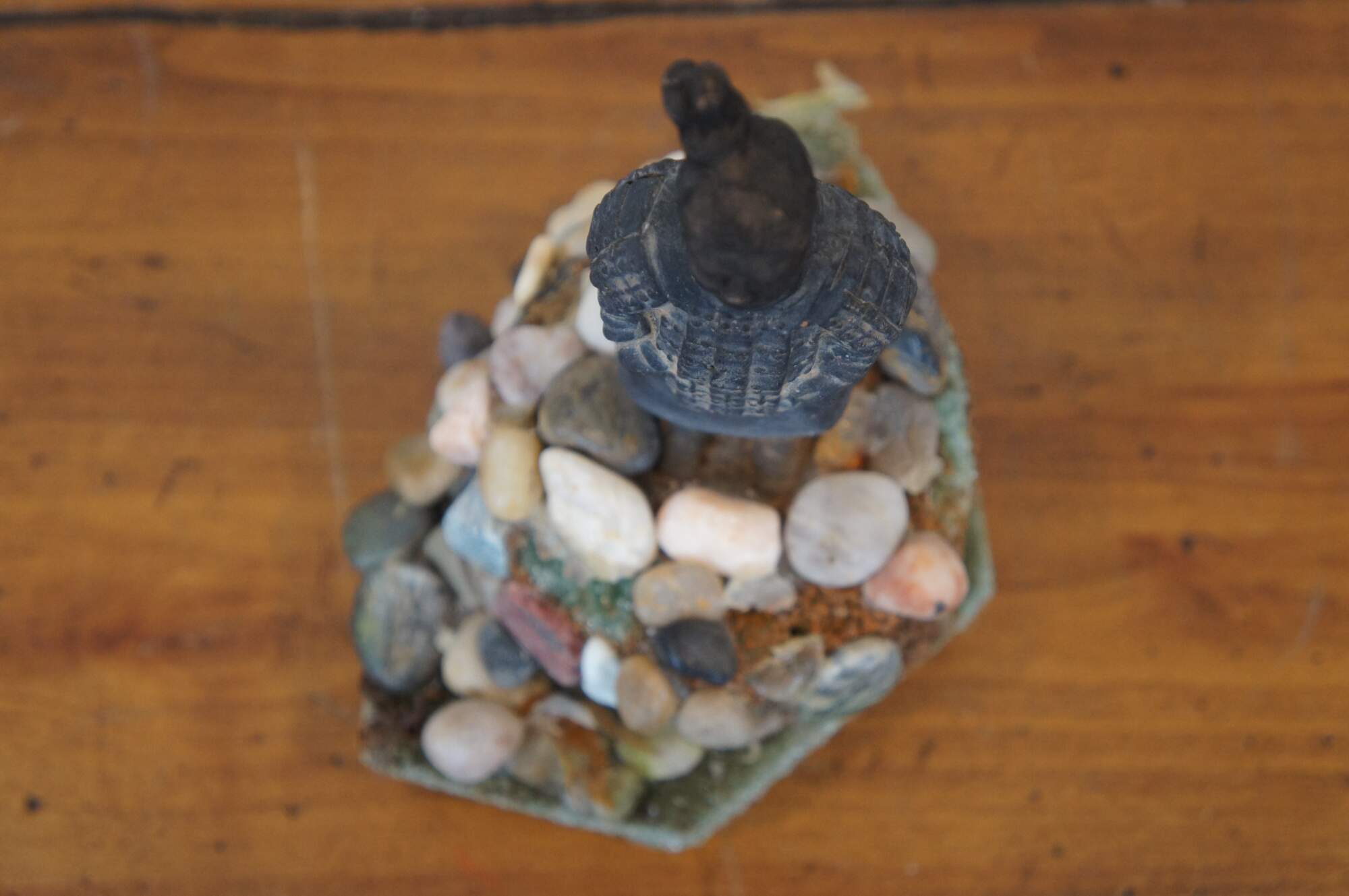 Vintage Chinese terra cotta soldier figurine, standing on / attached to a piece if garden styrofoam covered in small stones / rocks.