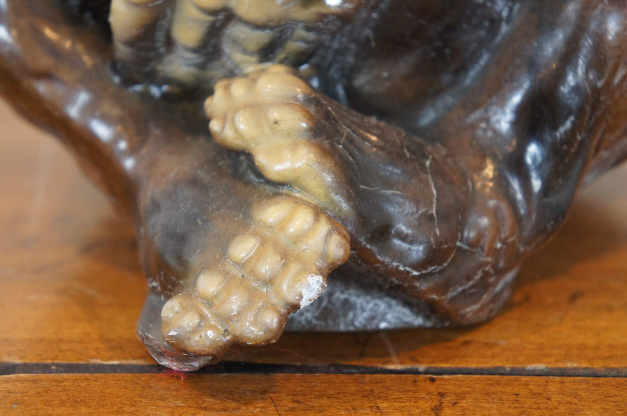 Rare vintage figurine / statue of a seated brown primate / ape / chimpanzee by Marwal Industries Inc, crafted of chalkware with a glossy lacquer finish.