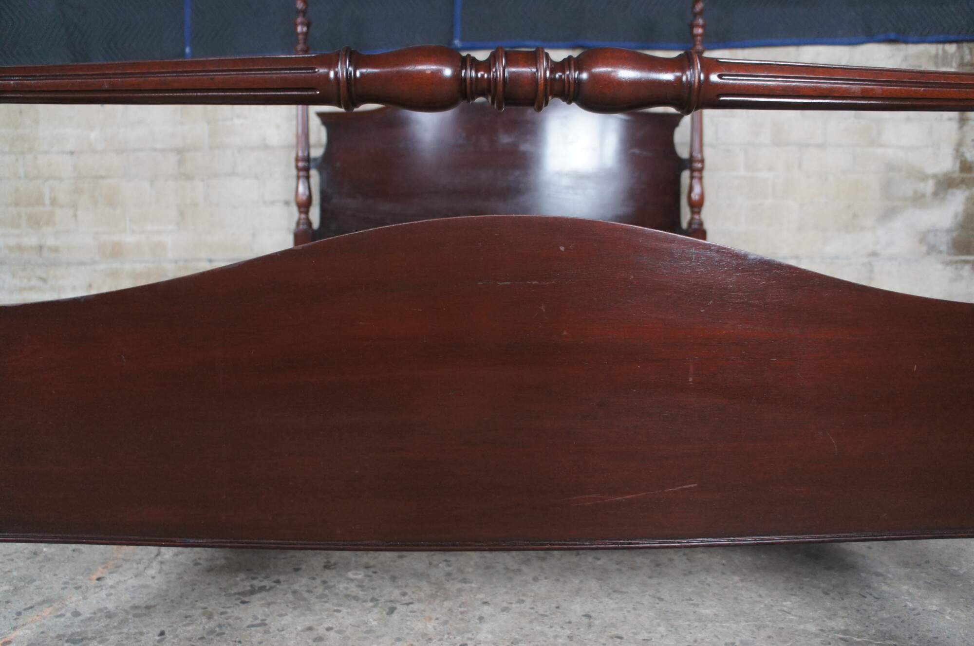 Sheraton style full size bed by West Michigan Furniture Co., circa 1940s. Made from mahogany with an open pediment headboard. features turned and fluted posts with trophy finials. The bed is supported by turnip feet.