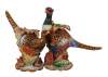 Pair of retired Fitz & Floyd Classics, Handcrafted, Autumn Bounty / Fall Harvest candlesticks / candle hodlers in the shape of male and female pheasants, perched on / surrounded by a variety of flowers, autumn leaves and fruits / vegetable associated with fall, harvest, and Thanksgiving.