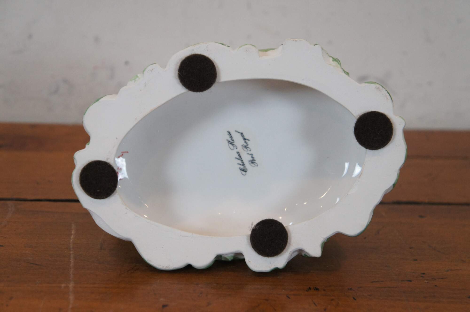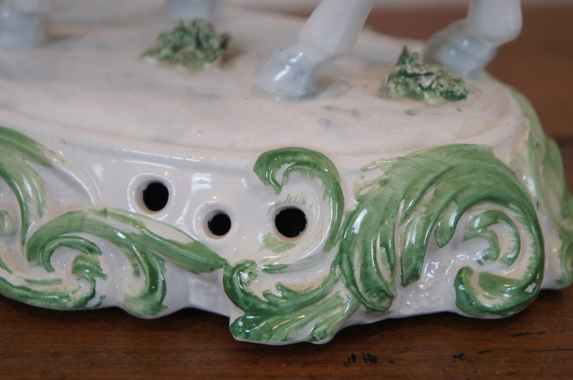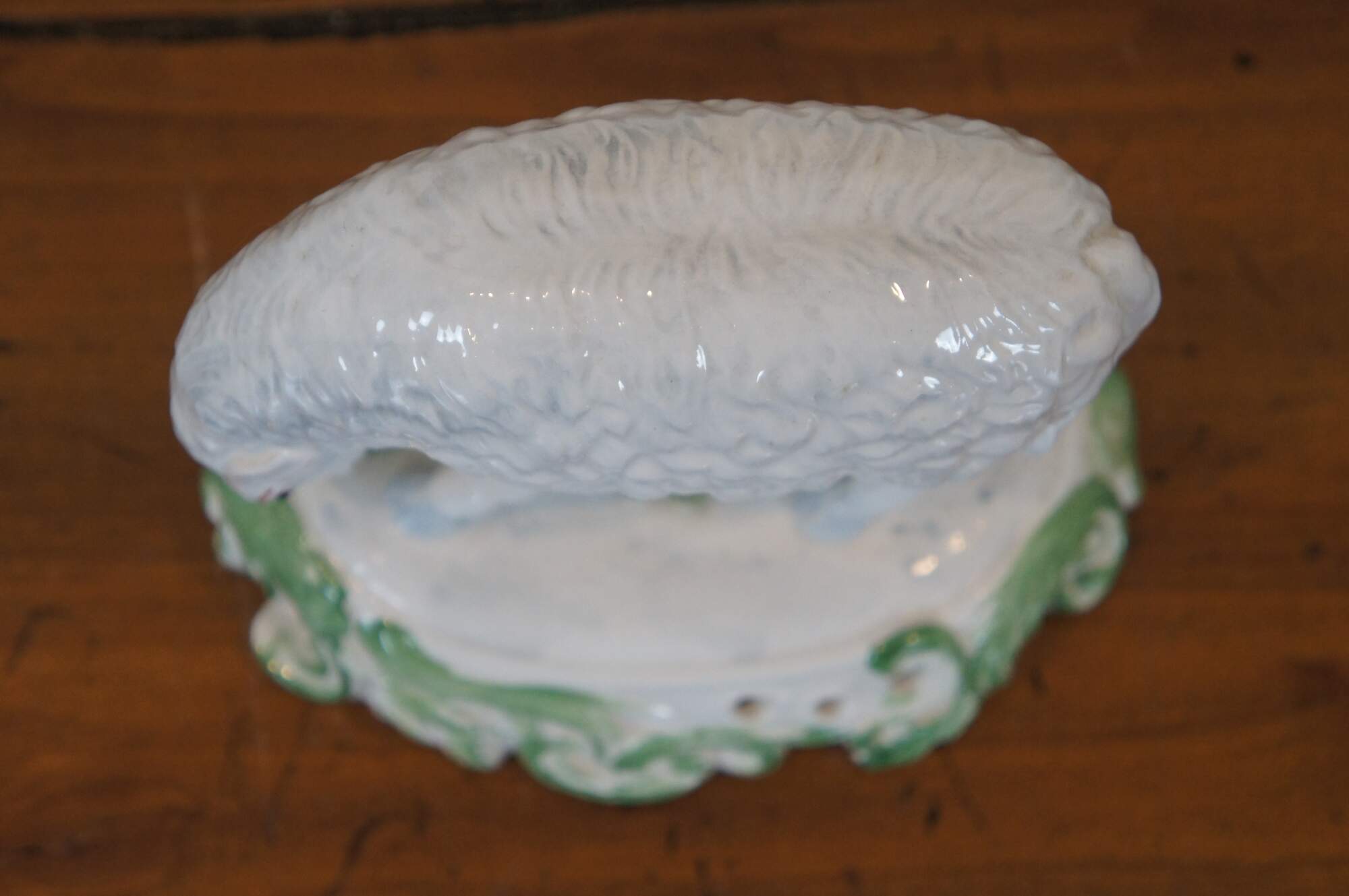Vintage Chelsea House Port Royal hand painted porcelain figurine in the shape of a sheep / lamb grazing in a field. White with green foliate details. In the style of 19th century Staffordshire figurines. Made in Italy.