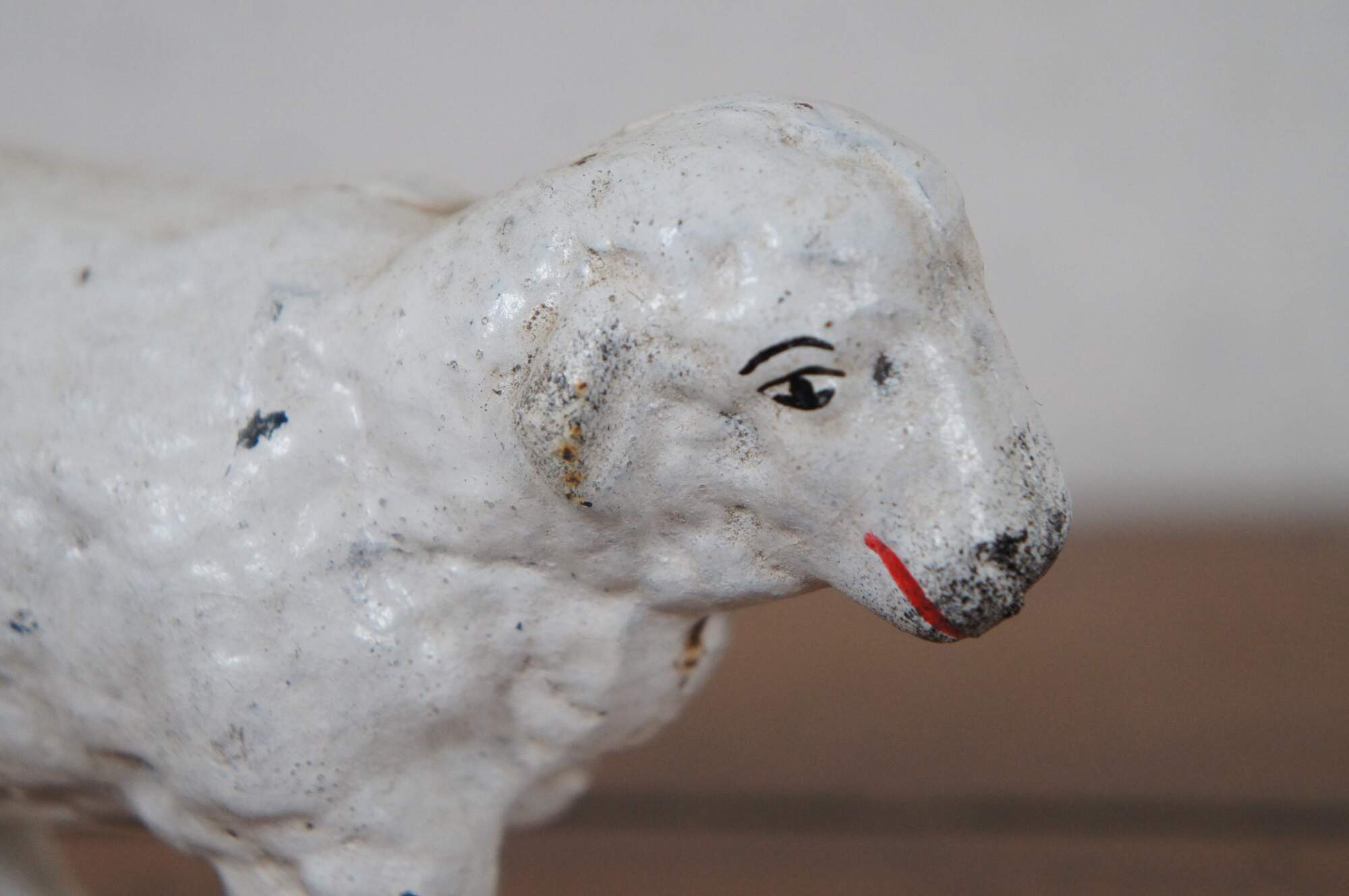 Lot of four antique cast iron still / coin banks in the shape of sheep / ewes. Three are painted white and one black, complete with facial features. Two part forms secured with a single flat head screw. Seams and screws painted over.