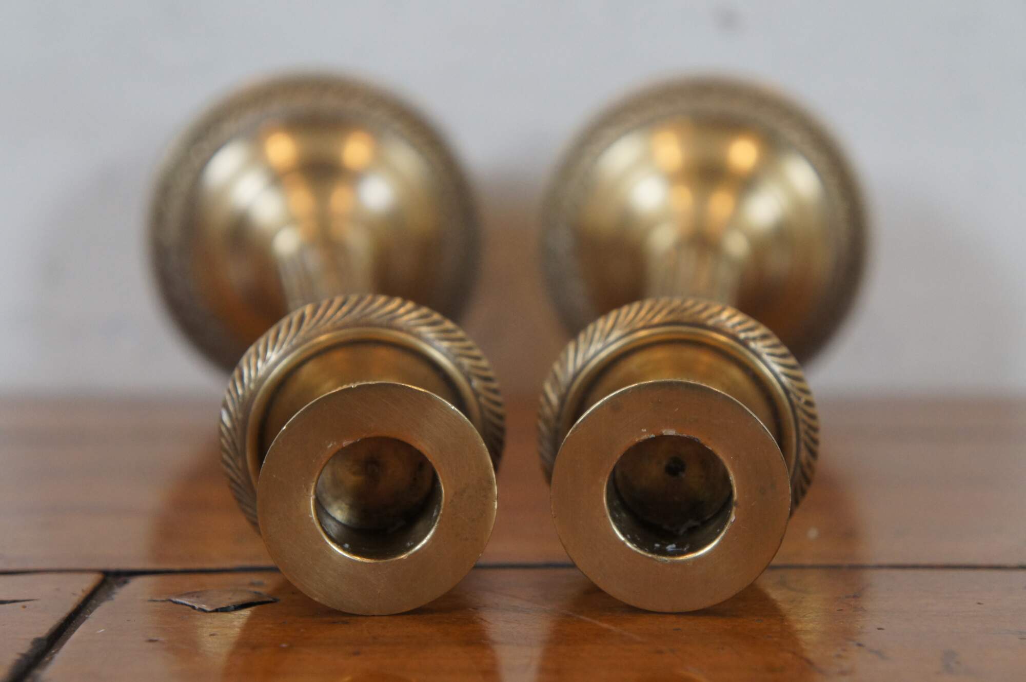 Pair of large vintage brass candlesticks / taper candle holders. In the shape of a neoclassically inspired fluted corinthian column with beaded bands and a round base trimmed with a rope twist of alternating bands and stars.