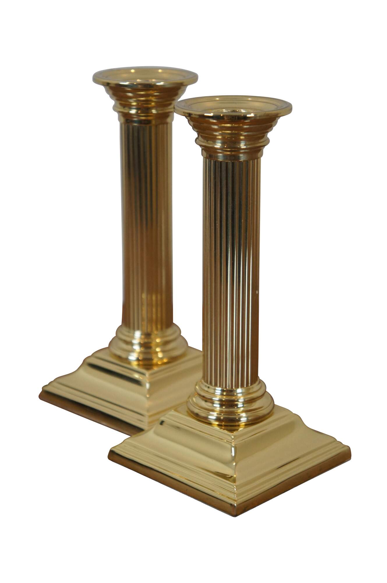 Pair of vintage bright brass candlesticks / taper candle holders in the shape of Neoclassical fluted columns with a tiered square base. Made for the Smithsonian Institution by Baldwin Brass.