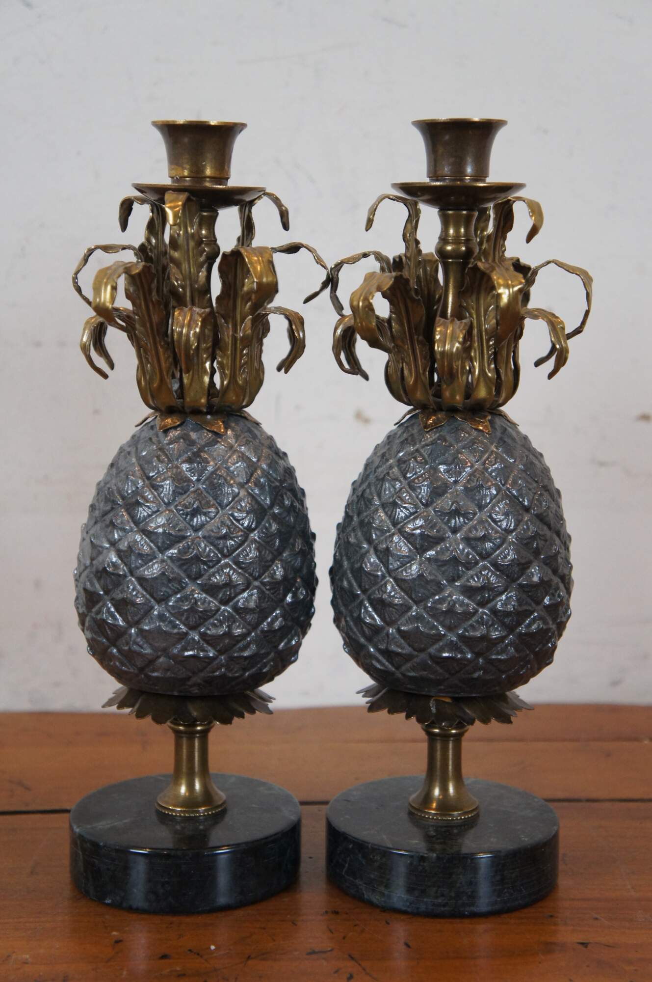 Pair of vintage candlesticks / taper candle holders by Petite Choses, purchased at Wakefield-Scearce Galleries of Shelbyvillle, Kentucky. Round black marble bases supporting pewter and brass pineapples, topped with traditionally styled candle cups.