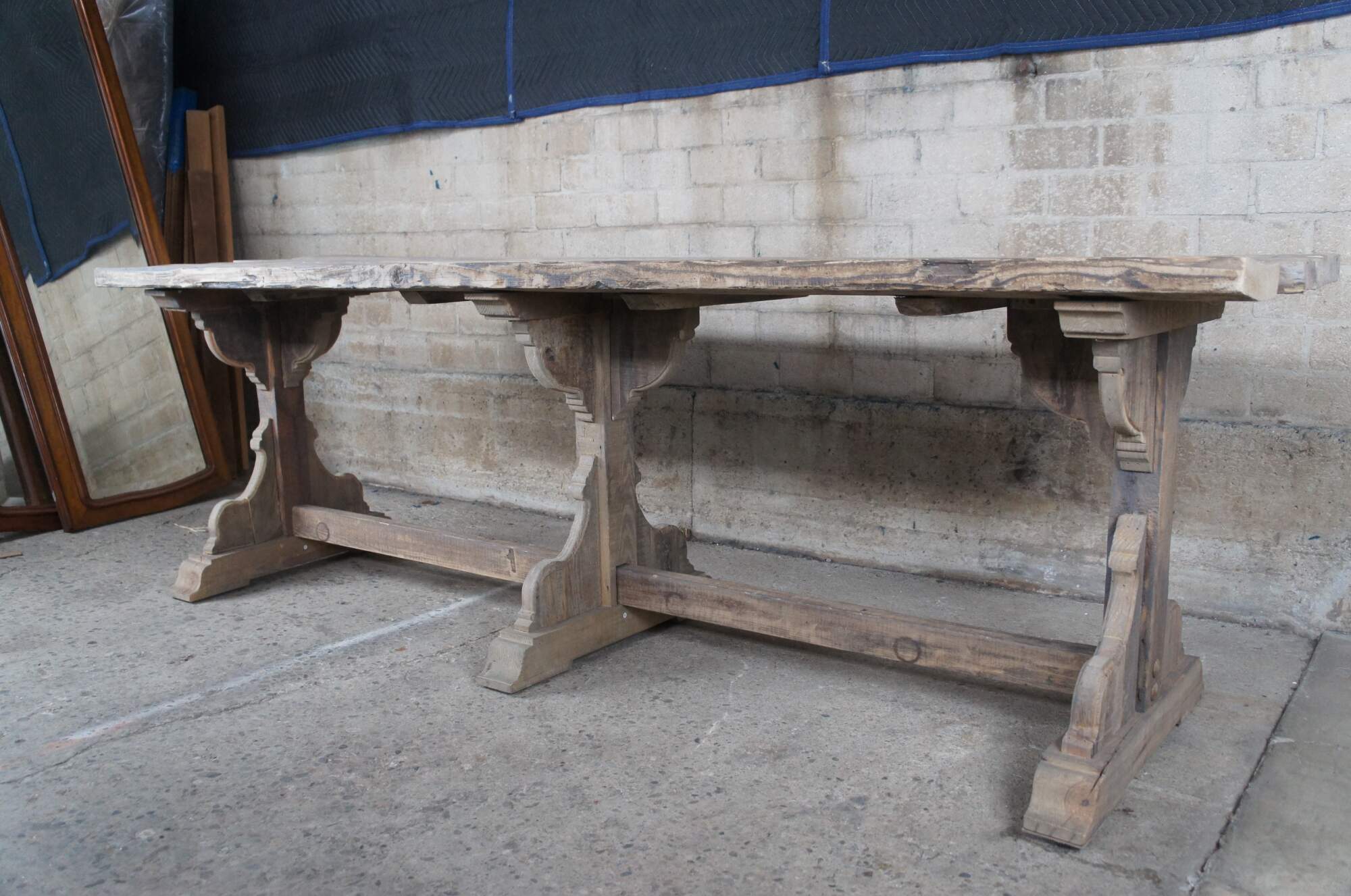 An impressive European refectory / dining table. Constructed from antique pine. Features a rustic patina with a three board top over trestle base.