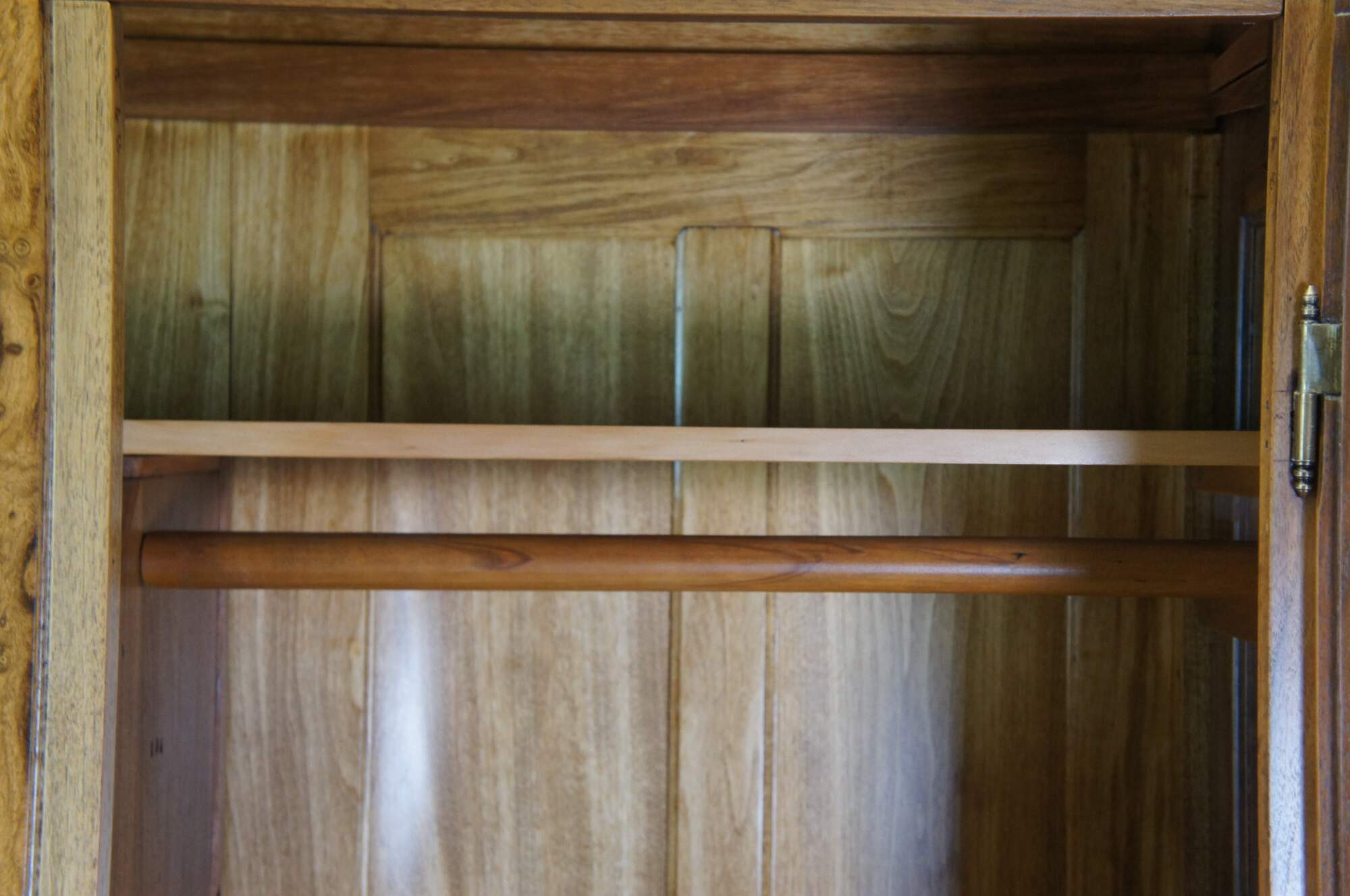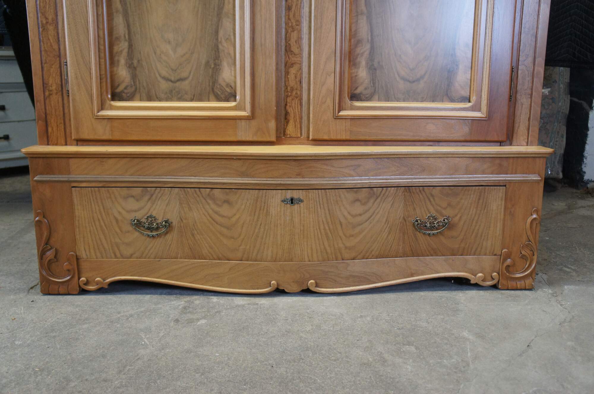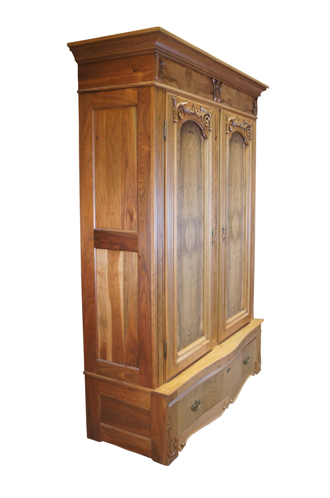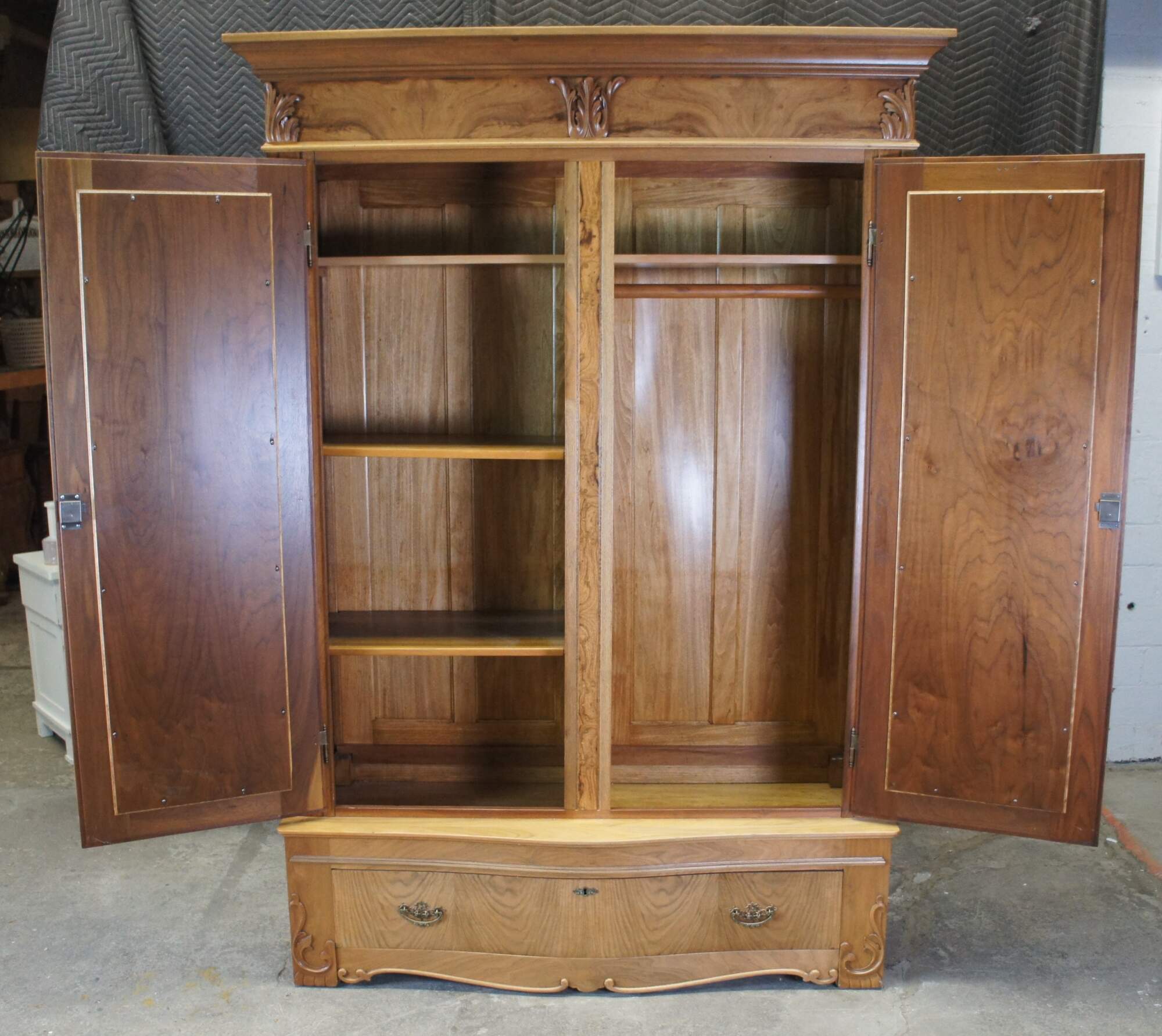 Impressive Late Victorian knockdown armoire. Made from walnut with a matchbook veneer burled front over an oxbow base with large dovetailed drawer. The interior opens to three shelves along the left and a hanging bar for garmants to the right. Features carved acanthus and scrolled accents, ornate brass hardware and panelled siding.