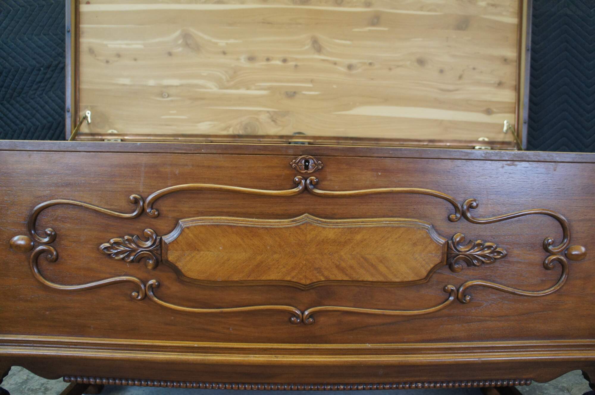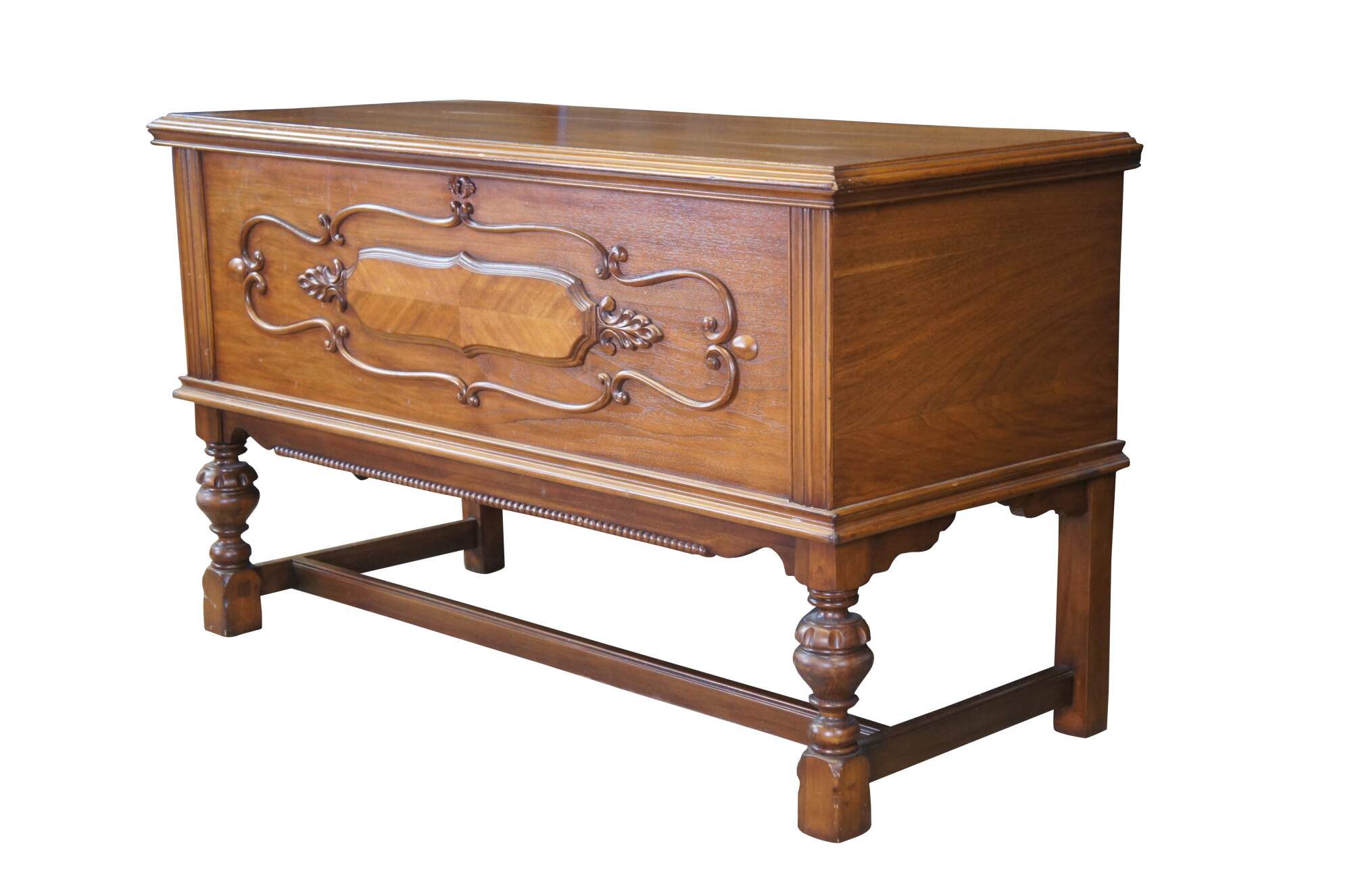 An impressive early Lane Trunk, circa 1929. Made from walnut with a cedar lined interior. The trunk features an ornate front with matchbook veneer design, acanthus embelishments and an ornately contoured molding. The trunk is raised over a Jacobean style base with ornate baluster carved front legs connected by an H stretcher to the rear straight legs. The trunk was made on March, 9th 1929.