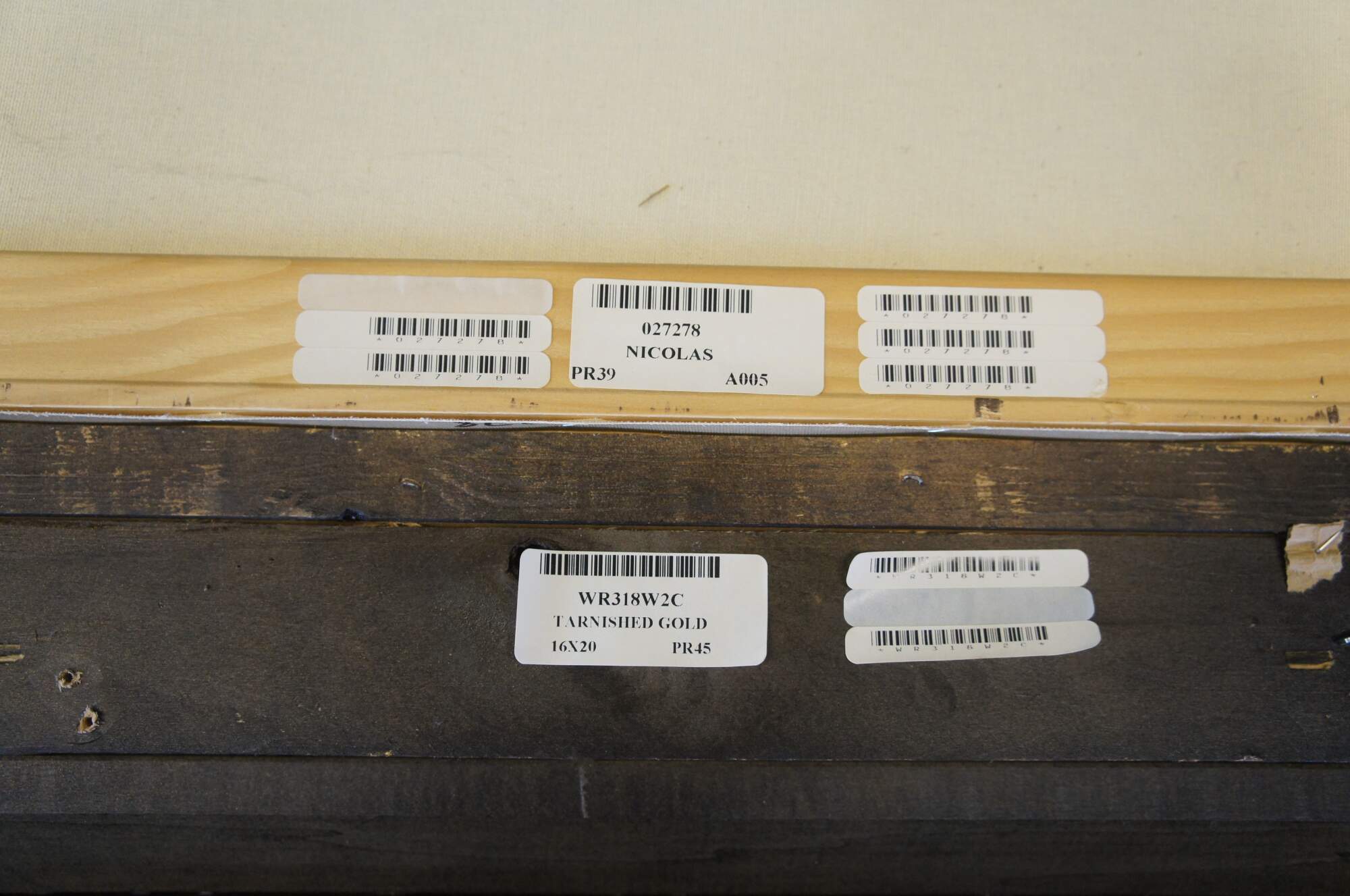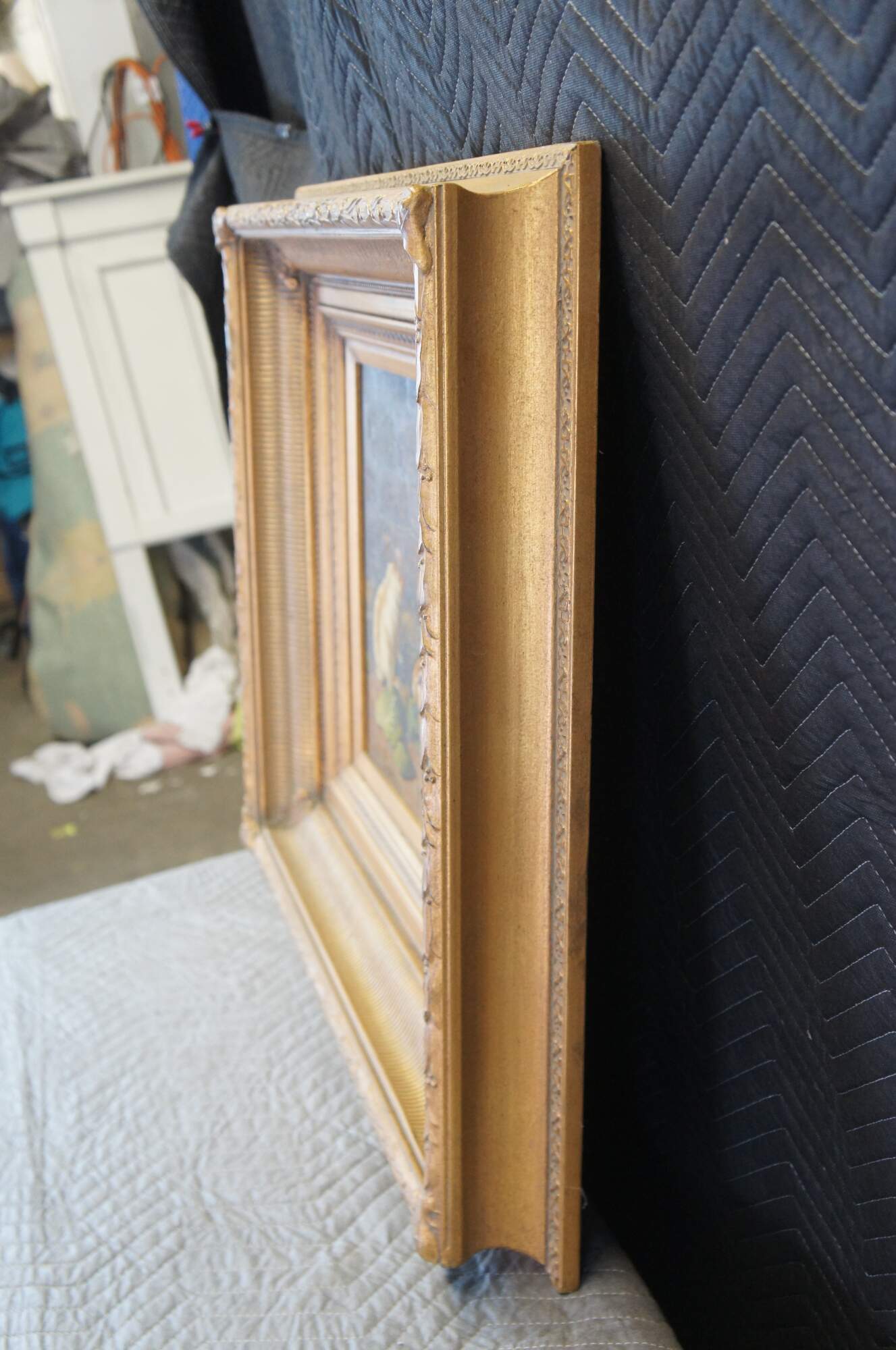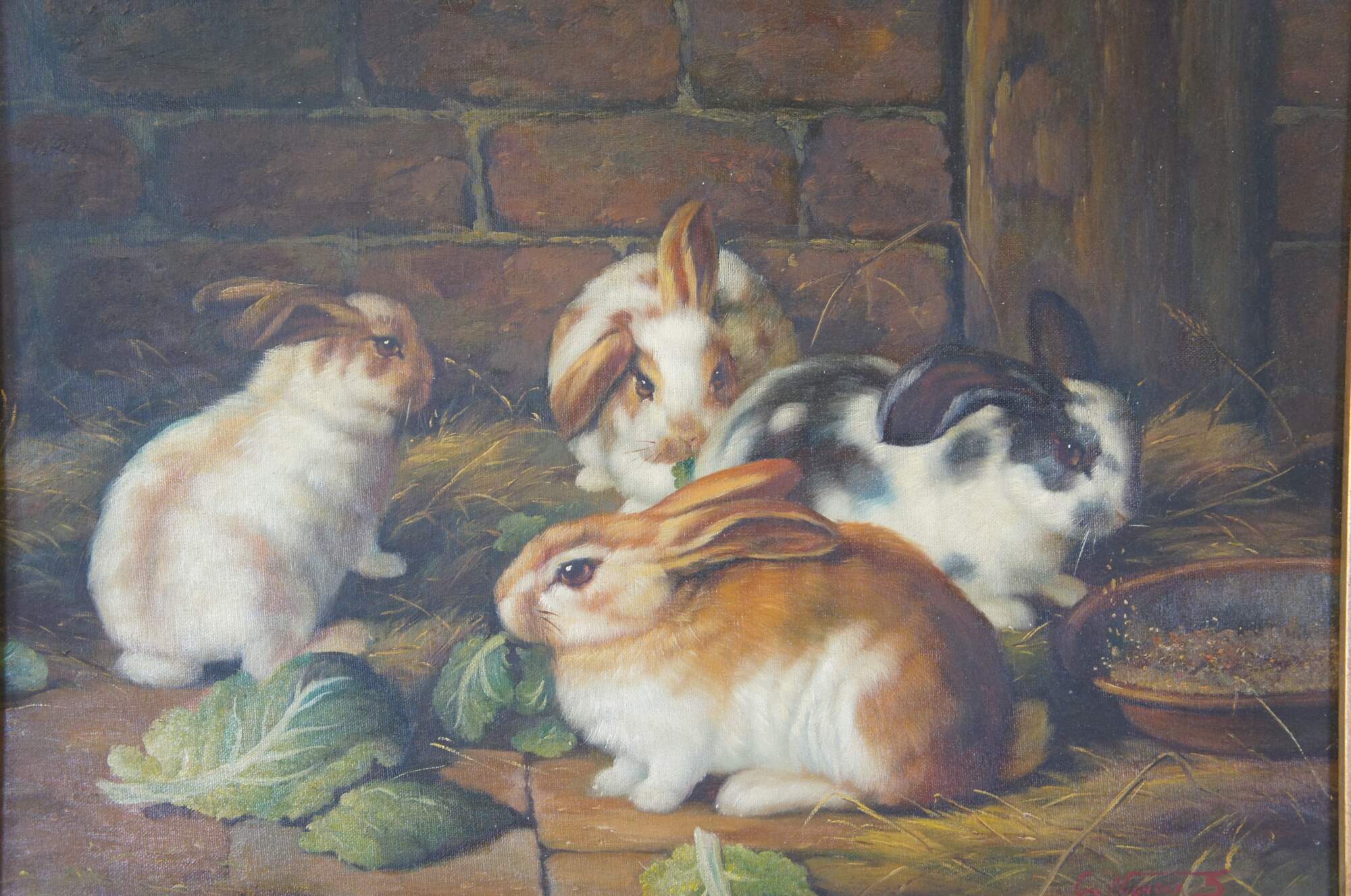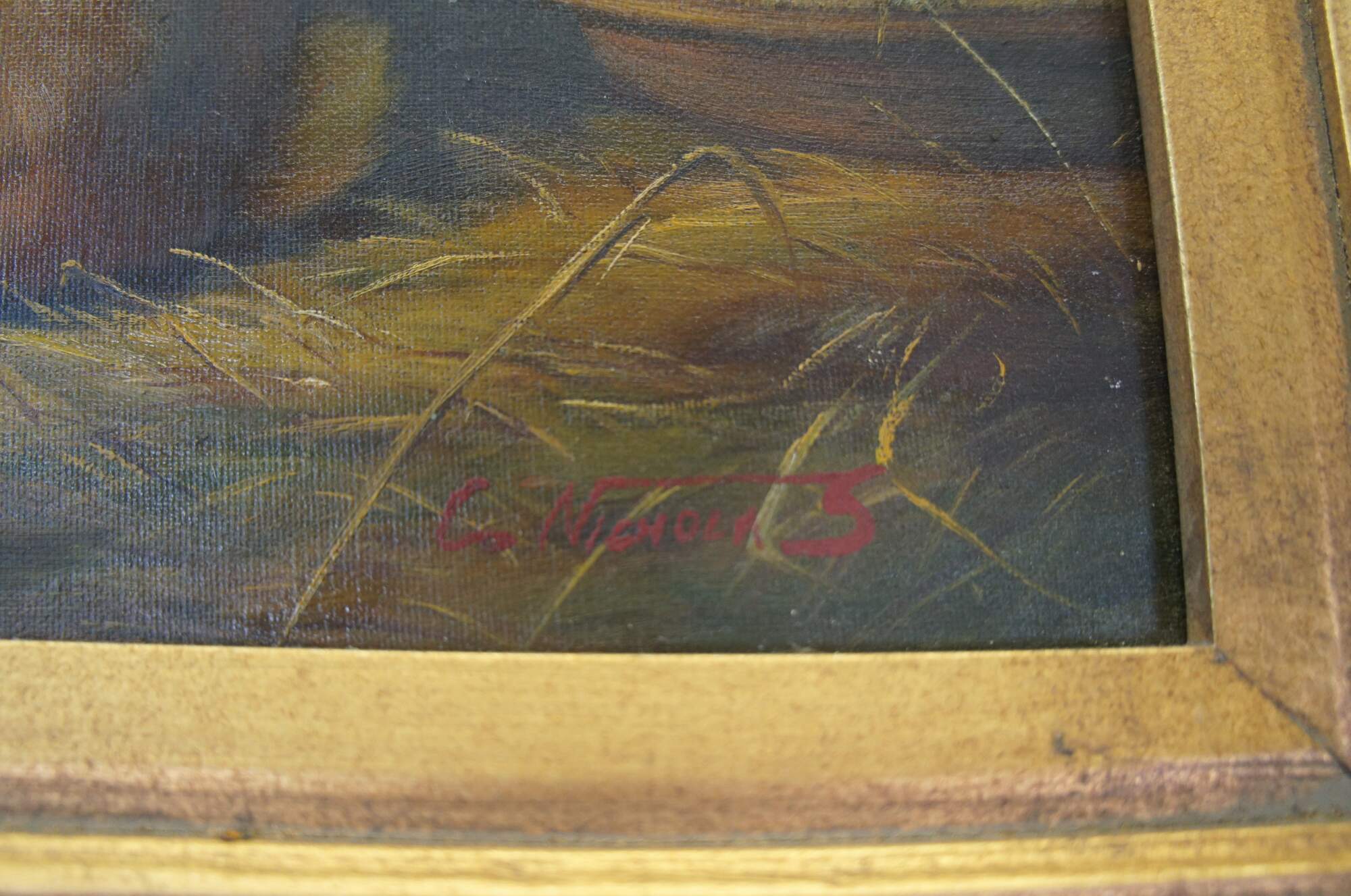 A lovely 20th century painting of Rabbits eating cabbage in a farmhouse setting. The oil painting is signed along the lower right side of the canvas by Nicolas. Features an ornately detailed French frame in tarnished gold.