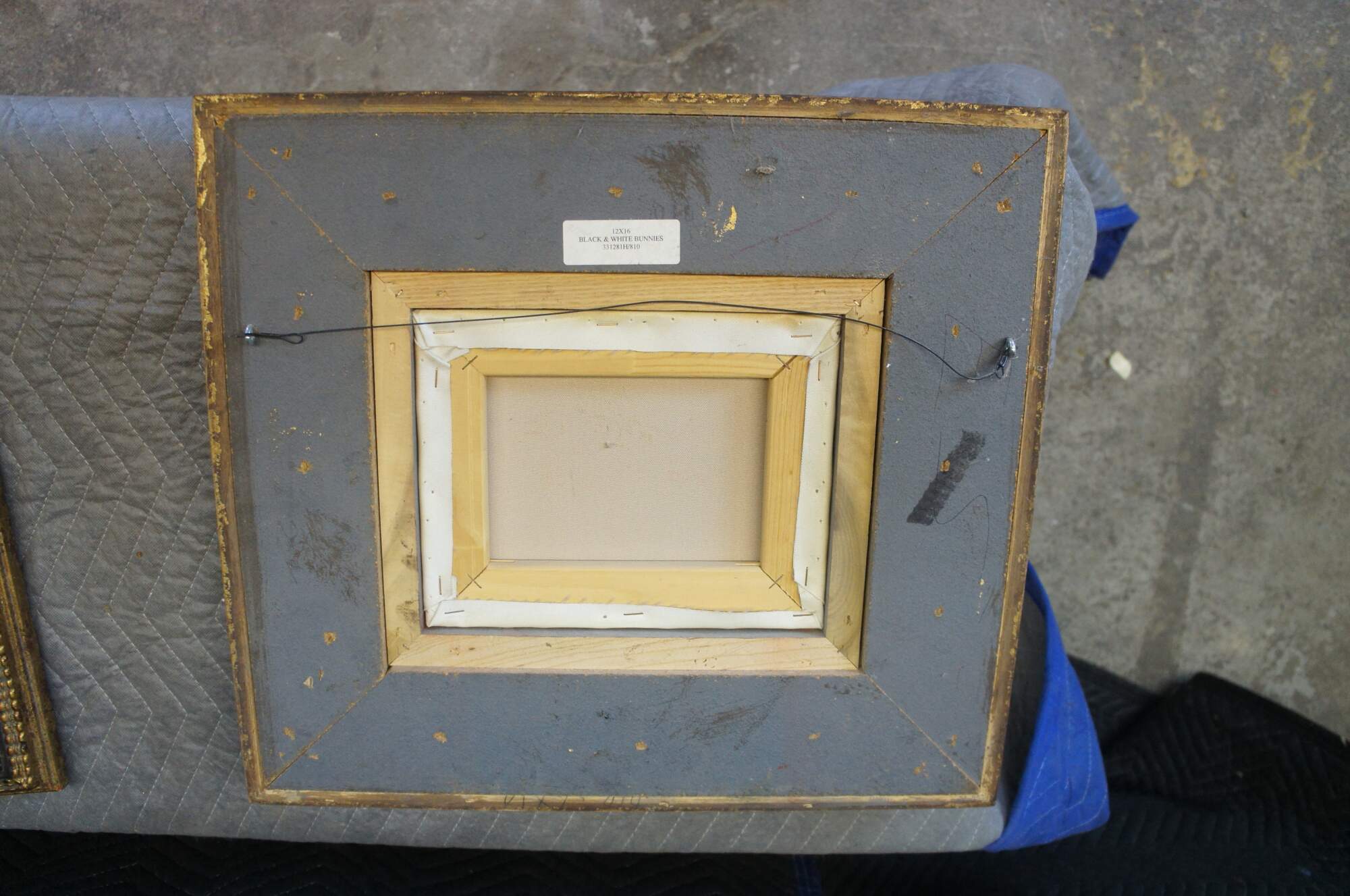 A fun pair of 20th century Rabbit oil paintings on canvas. The bunnies are eating cabbage in a farmhouse setting. Features an ornate black and gold frames.