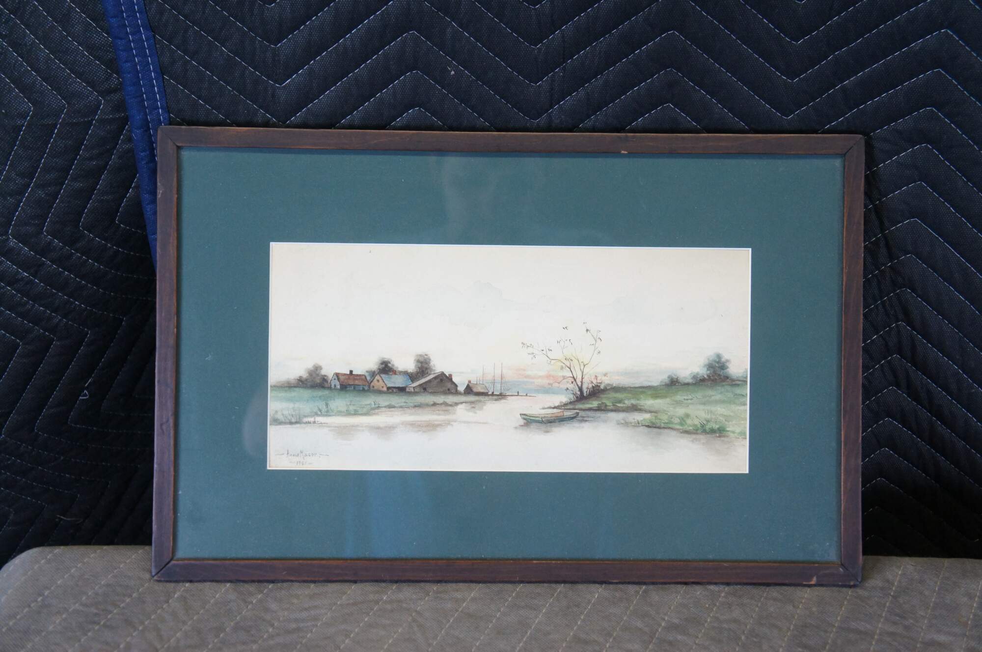 An early 20th century watercolor painting on paper, circa 1901. Signed Anna Mason along the lower left. Featuers a conturyside with farmhouses next to a body of water. In the foreground a boat can be seen poised by a tree. The watercolor is framed and matted.