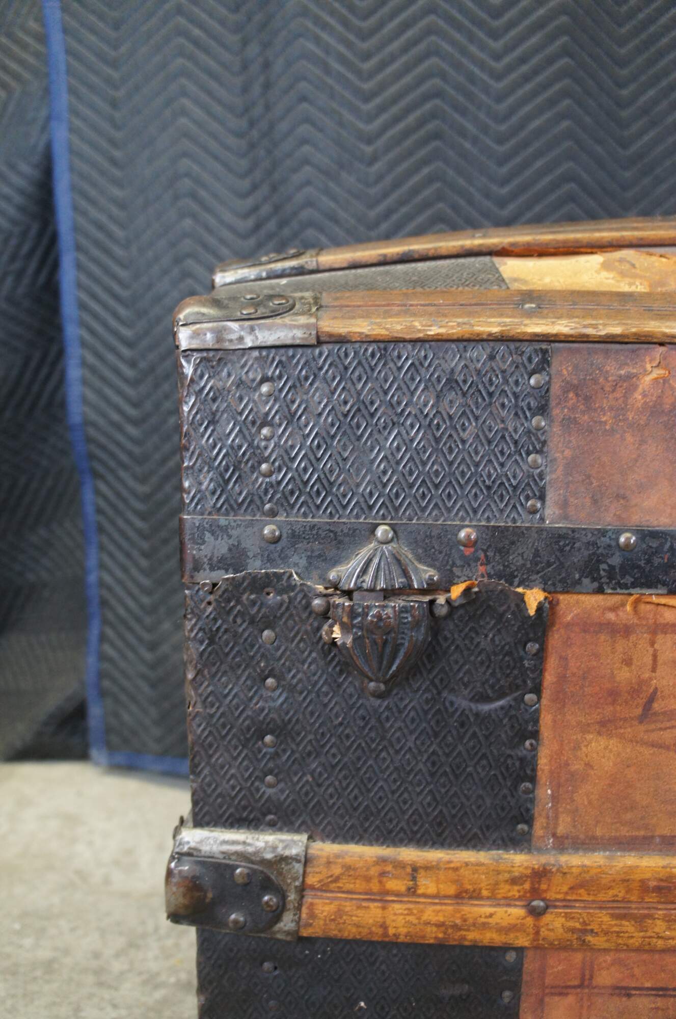 A large and impressive Victorian era dome top steamer trunk, circa 1870s. Features a tooled leather and oak frame with geometric diamoned pattern metal trim. Lock patented in 1876.