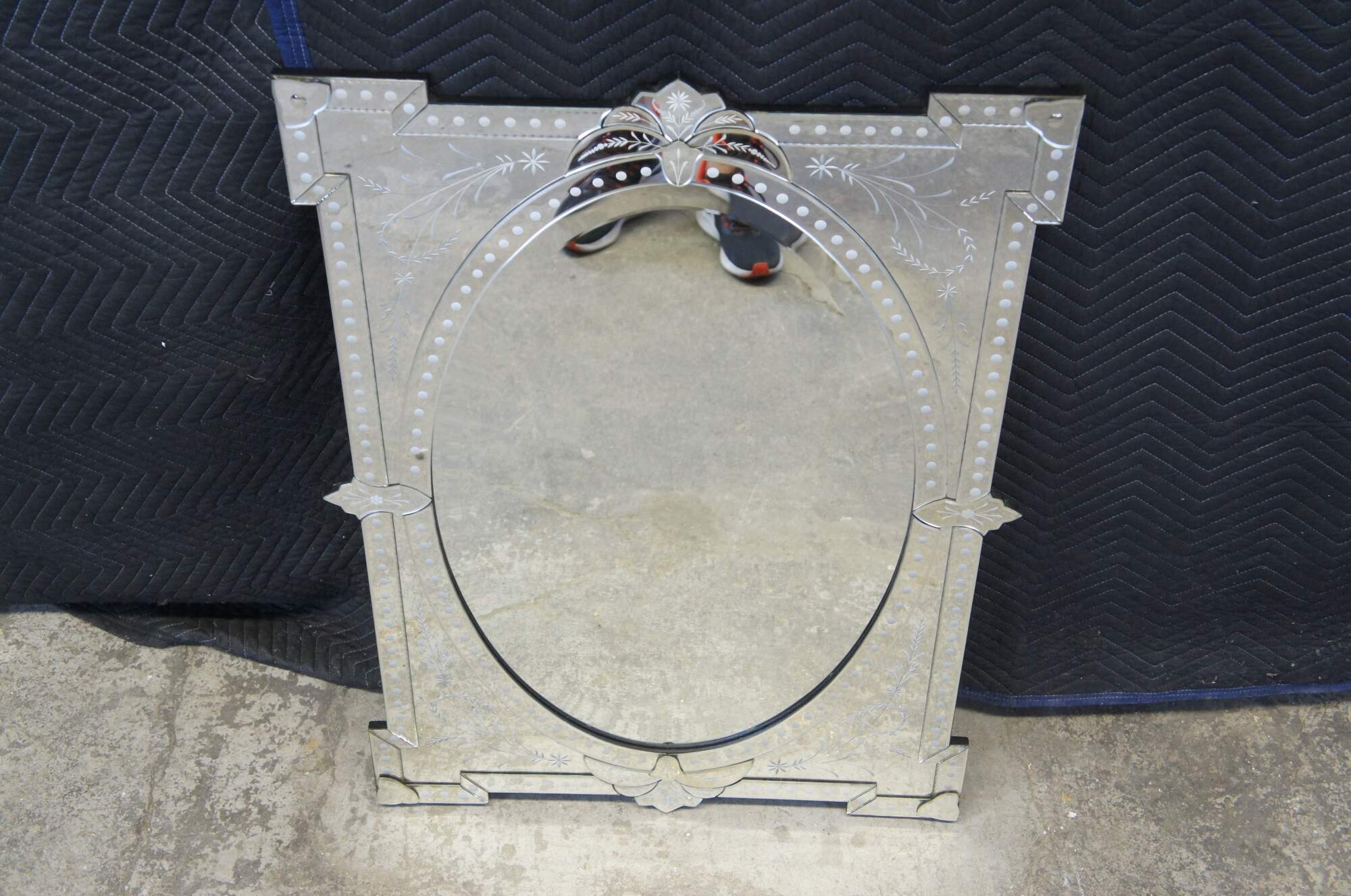 A lovely venetian wall hanging mirror. A rectangular form with oval interior and etched glass. A versatile mirror that can be hung horizontally or vertical.