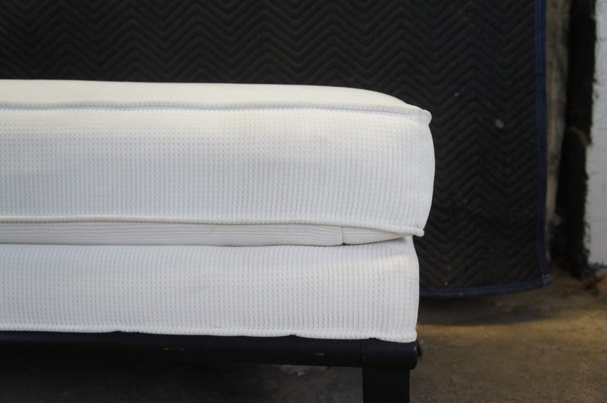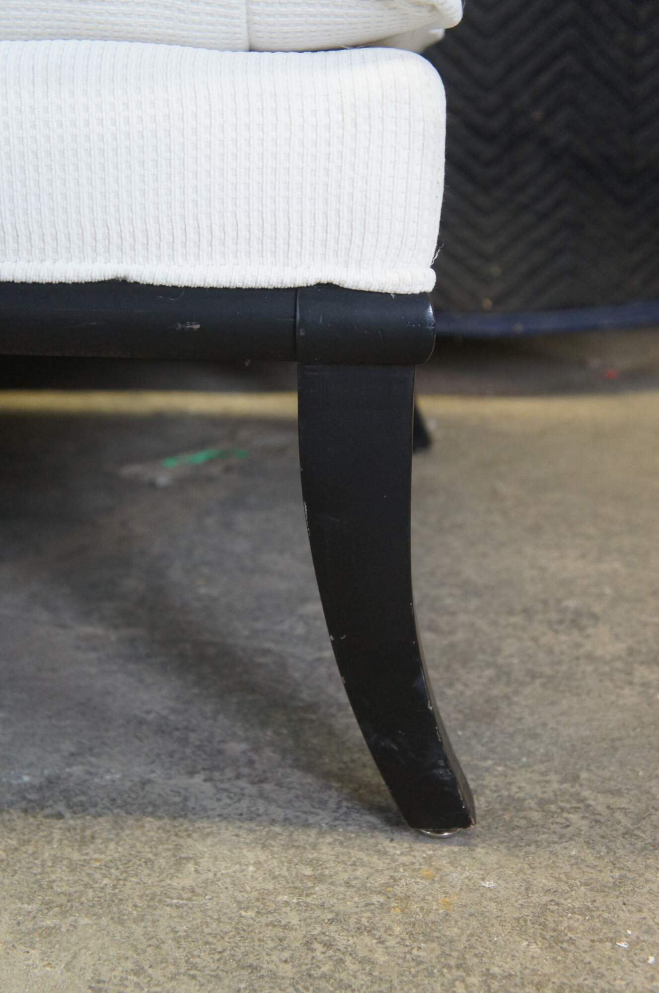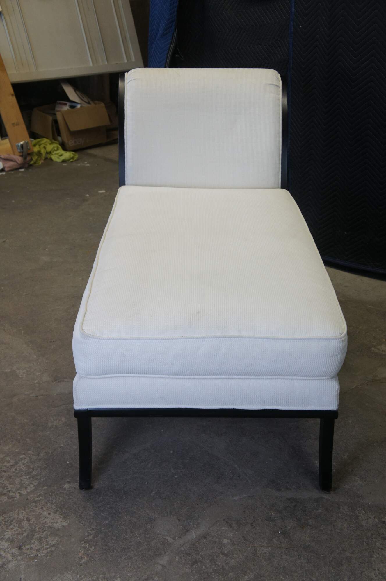 A lovely French inspired chaise lounge by Fairfield, circa 1990s. Features a black frame with a contoured back, white upholstery and saber legs. A comfy addition to any space.