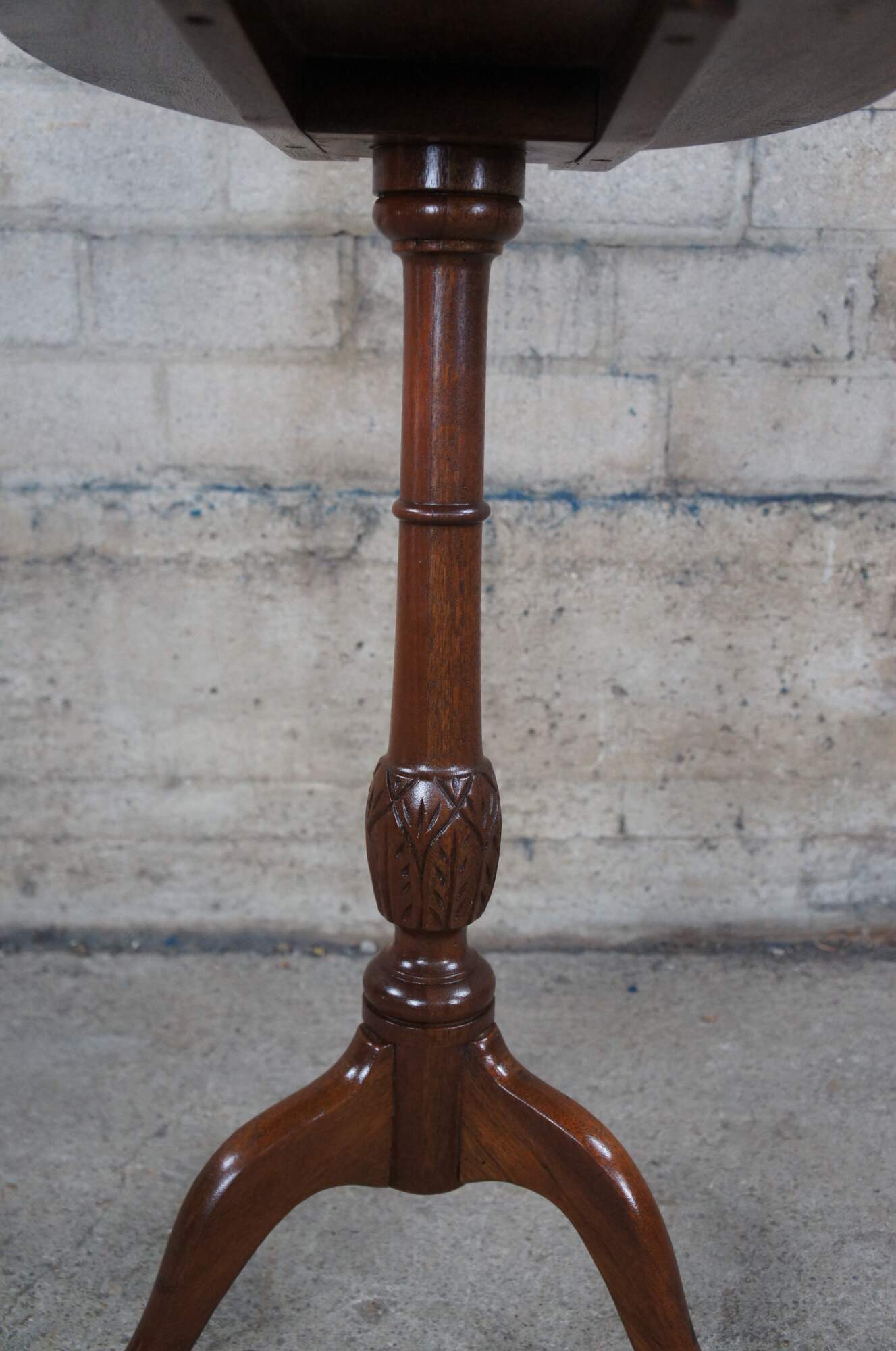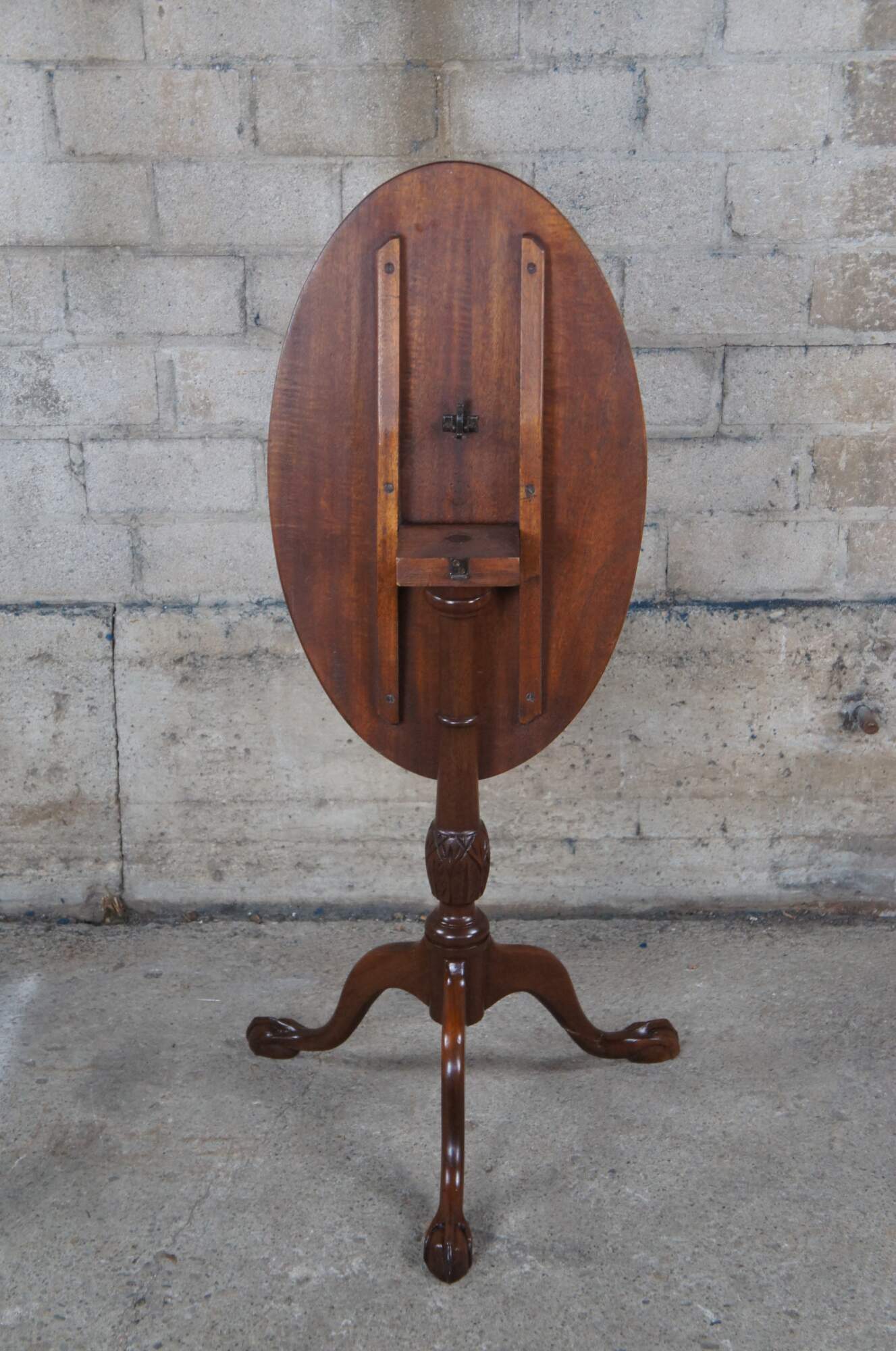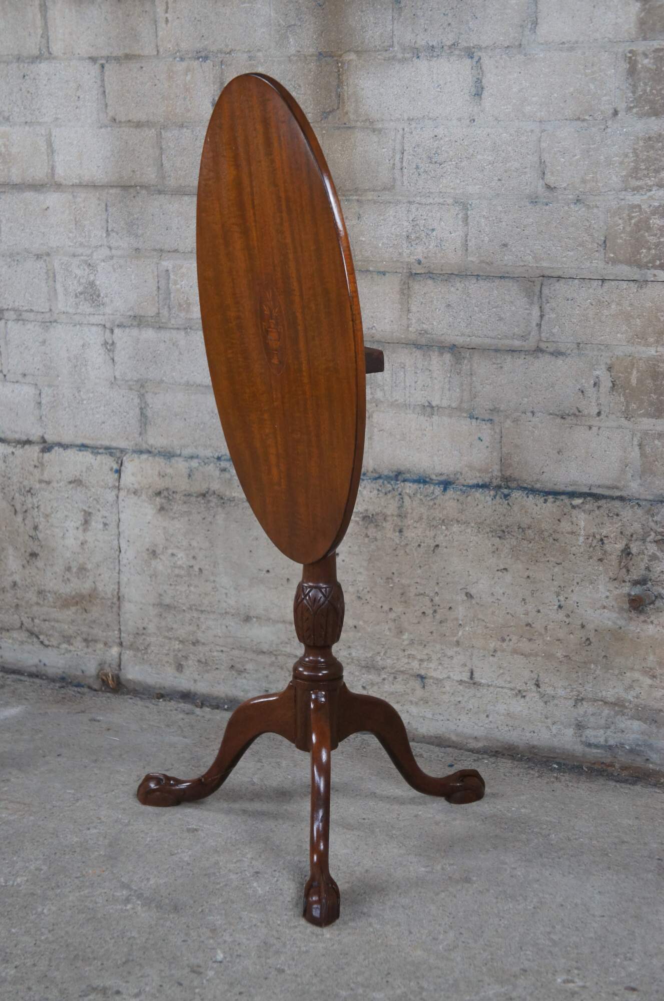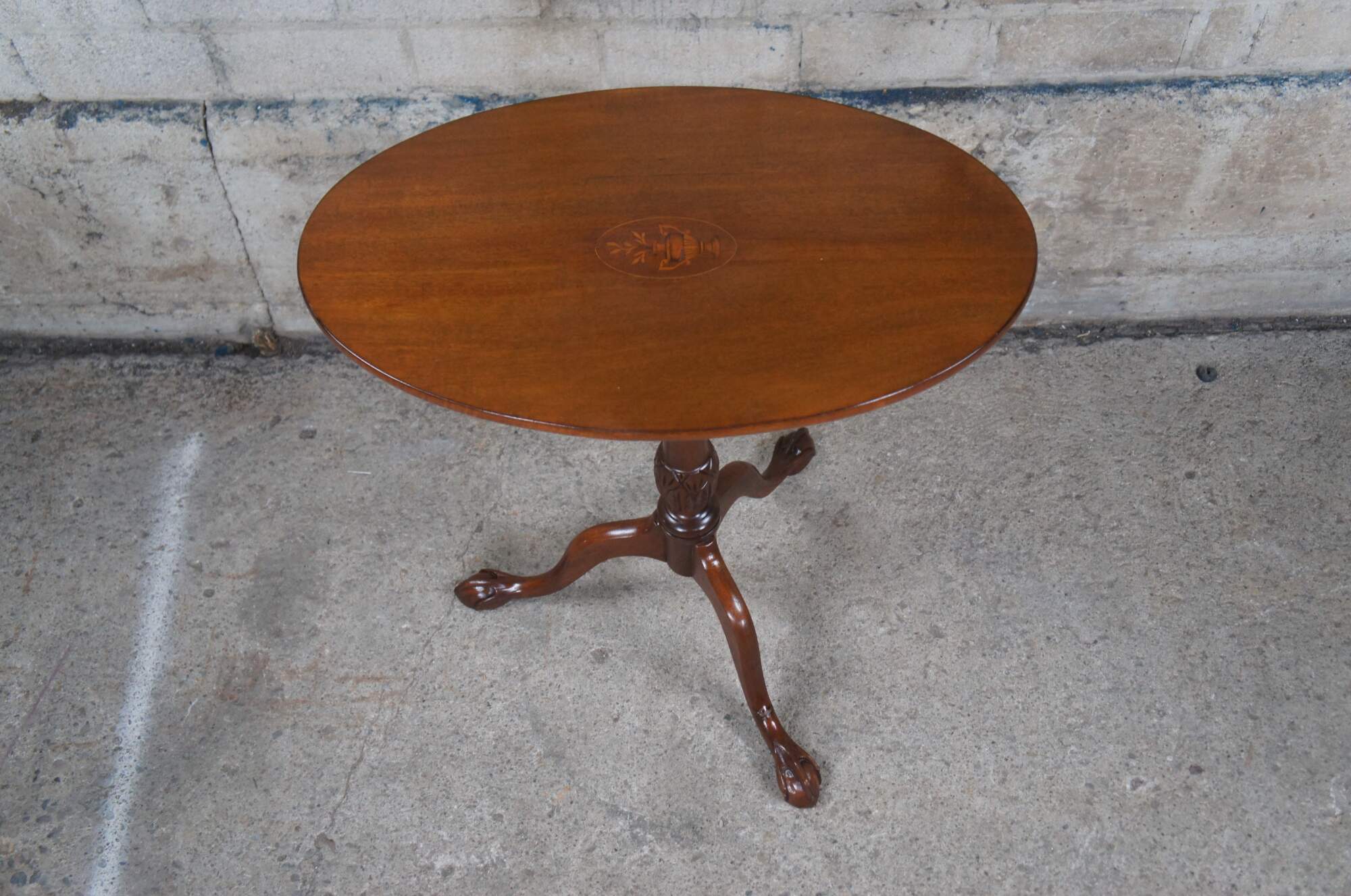An elegant early 20th century Georgian or Hepplewhite style mahogany tilt-top tea table / candle stand. Features an oval mahogany tabletop with inlayed neoclassical urn marquetry. The top is supported by finely carved support, rising over three downswept legs leading to ball and claw-feet. Ideal for use as a tea table, candle stand, wine table, side table or occasional table.