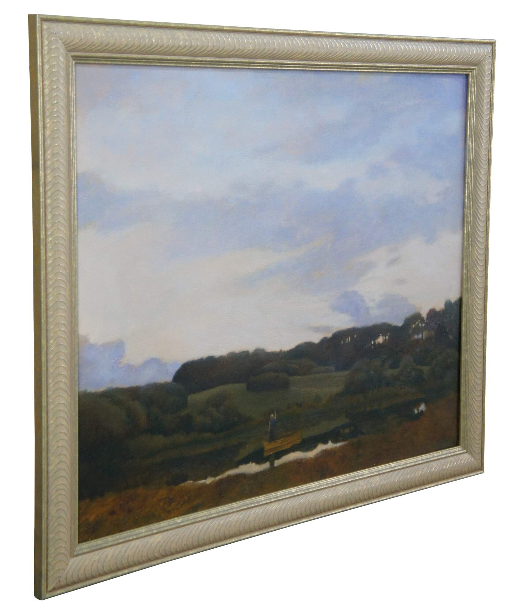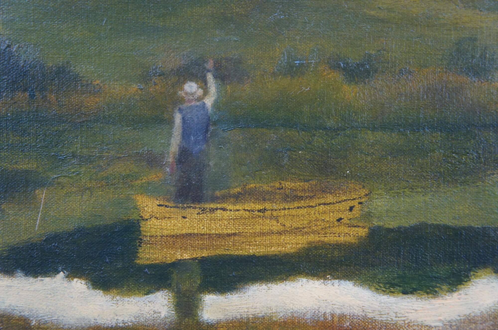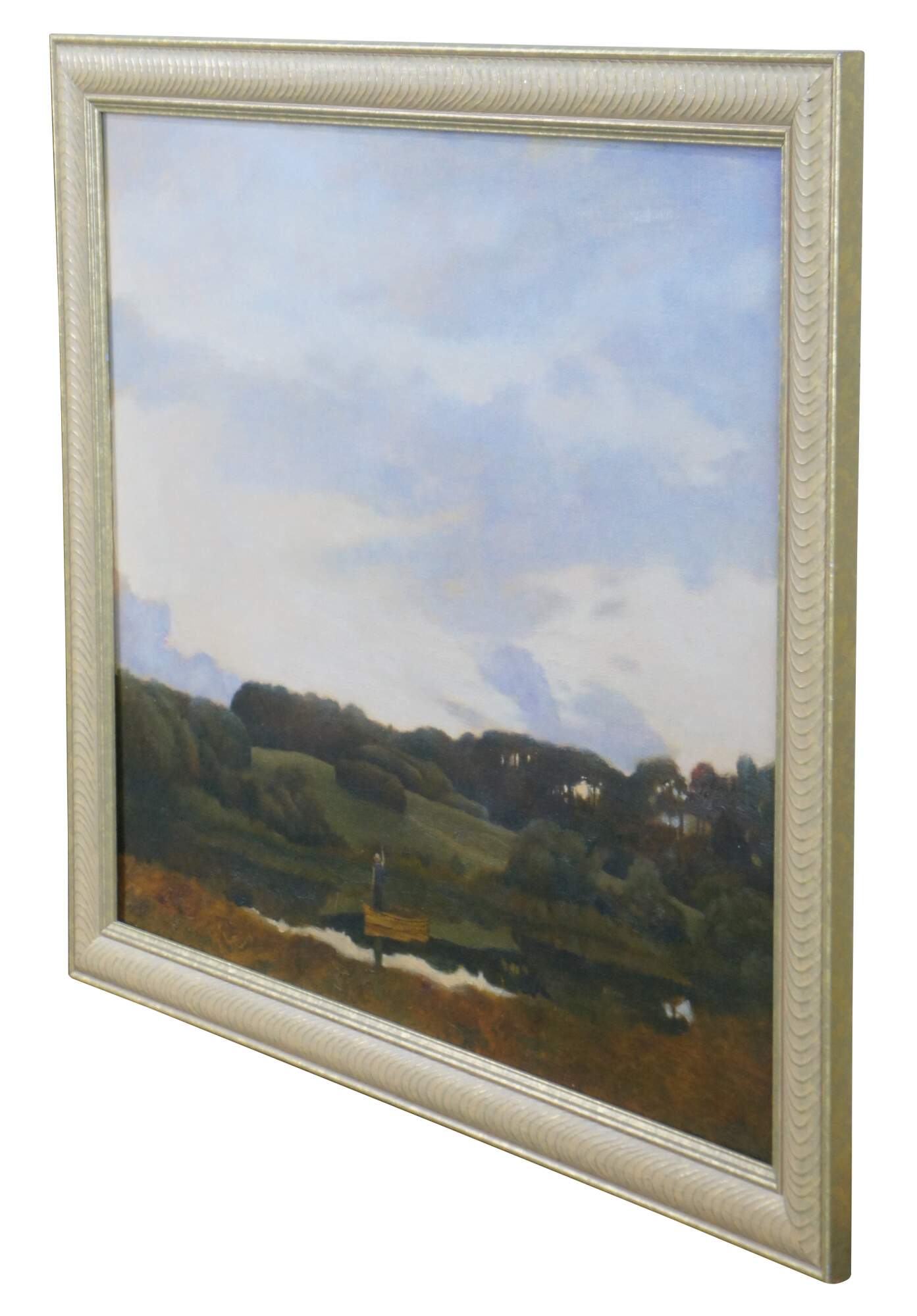 Vintage Ronald Renmark oil painting on canvas featuring an untouched natural landscape of a lake with a man standing and waving on a john boat / canoe, surrounded by a field of trees, hills and blue sky. From an undisclosed location in Virginia.