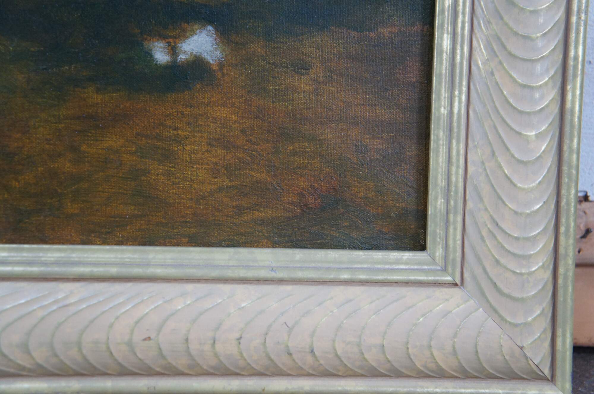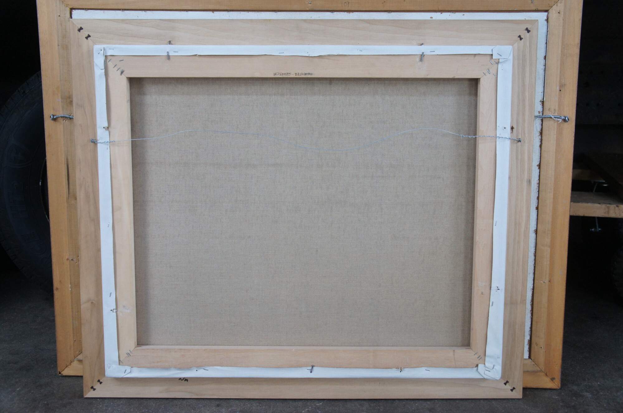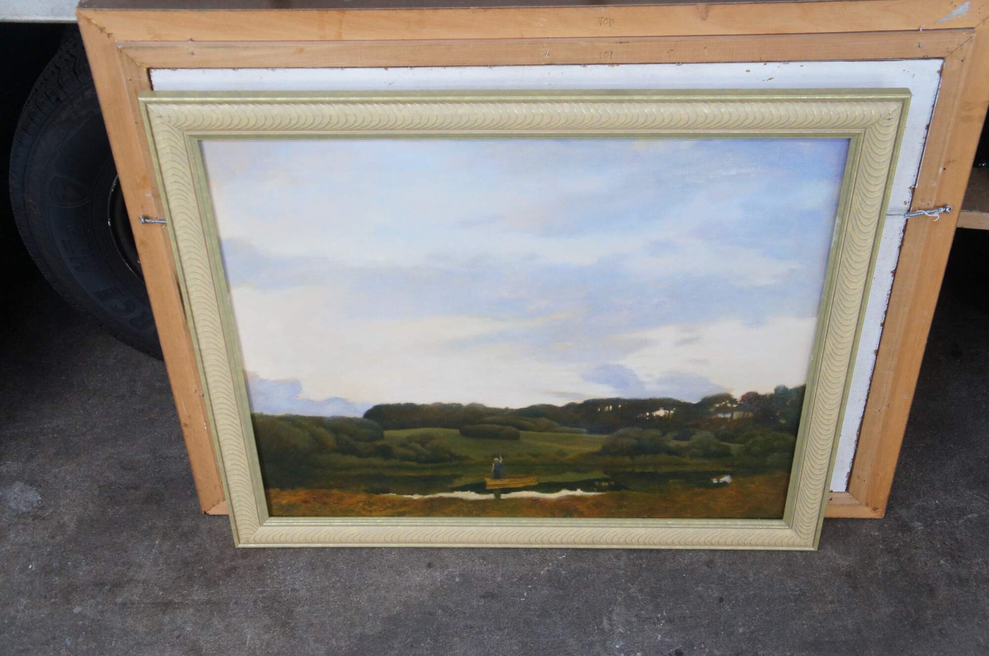Vintage Ronald Renmark oil painting on canvas featuring an untouched natural landscape of a lake with a man standing and waving on a john boat / canoe, surrounded by a field of trees, hills and blue sky. From an undisclosed location in Virginia.