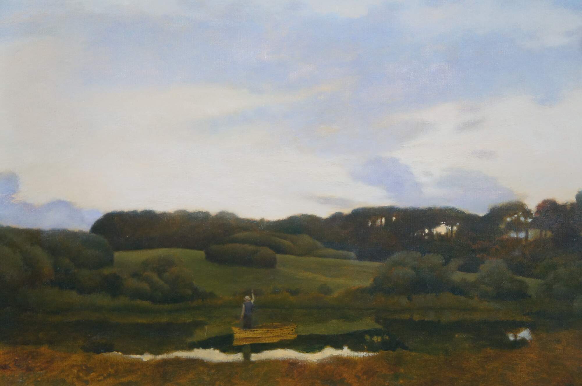 Ronald Eastbourne Renmark (American 20th-21st Century) is a romantic realist painter from Richmond Virginia. Born in 1938 Ronnie, as his friends call him, has studied abroad and been in the worlds of interior design, painting, stage sets and landscape design for his entire life. This painting is a fine example of his mature work and is almost photographically realistic while at the same time completely ethereal in nature not meaning to simply capture a moment but to cause a thoughtful contemplative mood within a busy hectic world.