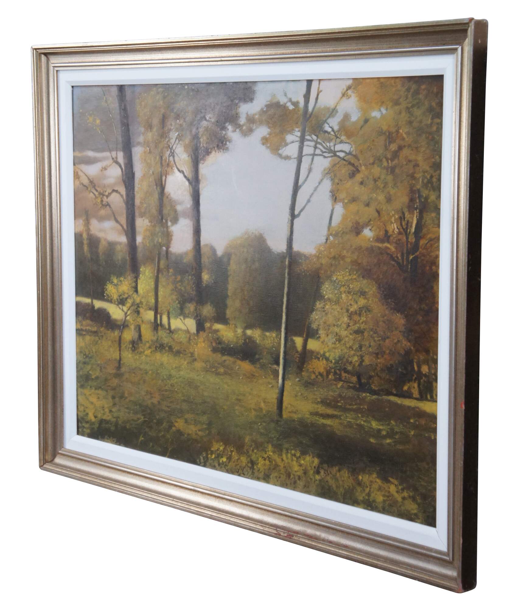 Vintage Ronald Renmark oil painting on canvas featuring an untouched natural landscape of forest and trees tucked away somewhere in Virginia. Made by Ronald for a client of his that he was also decorating for.