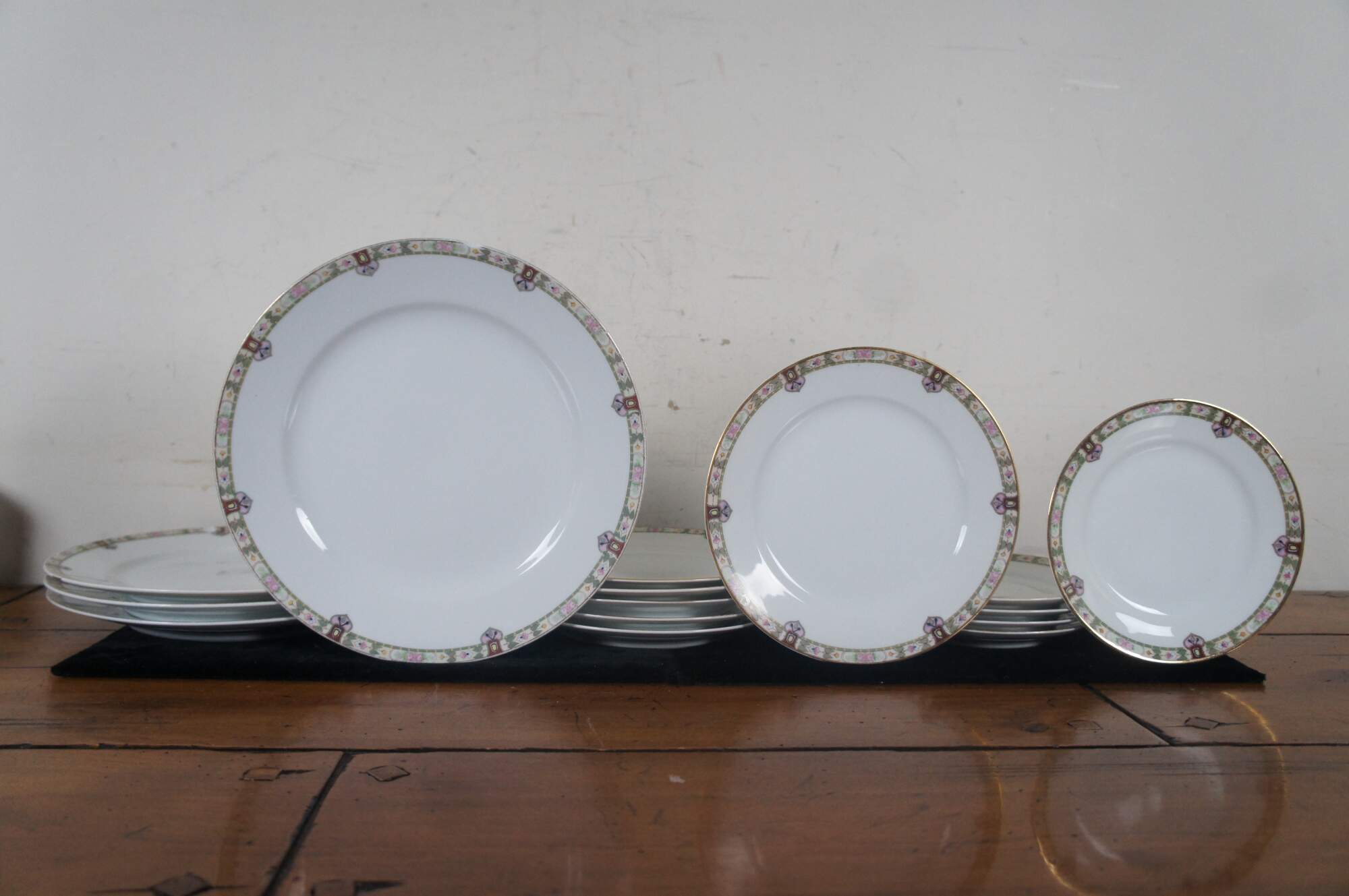 Good Overall - Edge chips 2 dinner plates, 1 salad plate, 1 teacup; fading to designs soup bowls