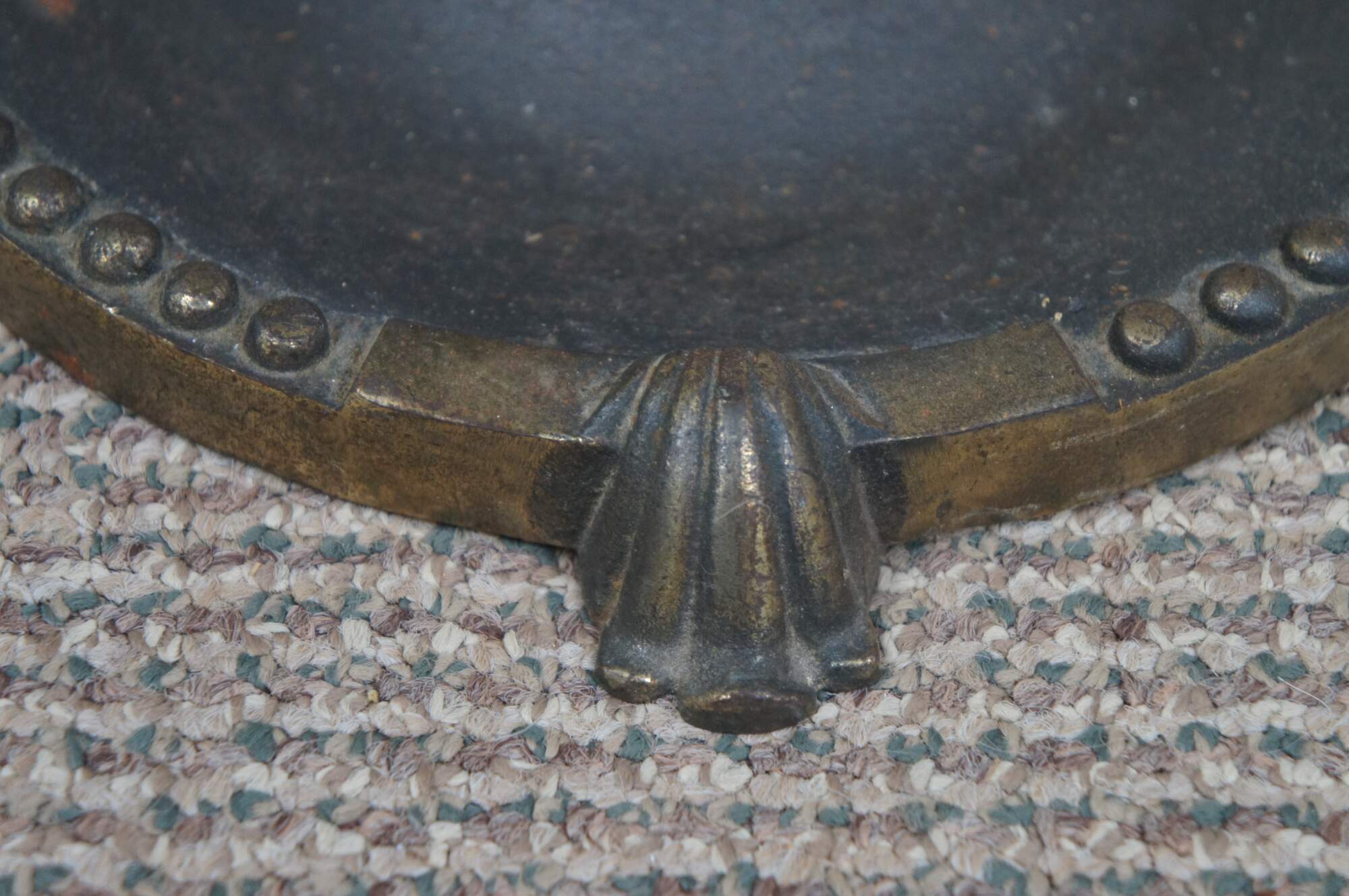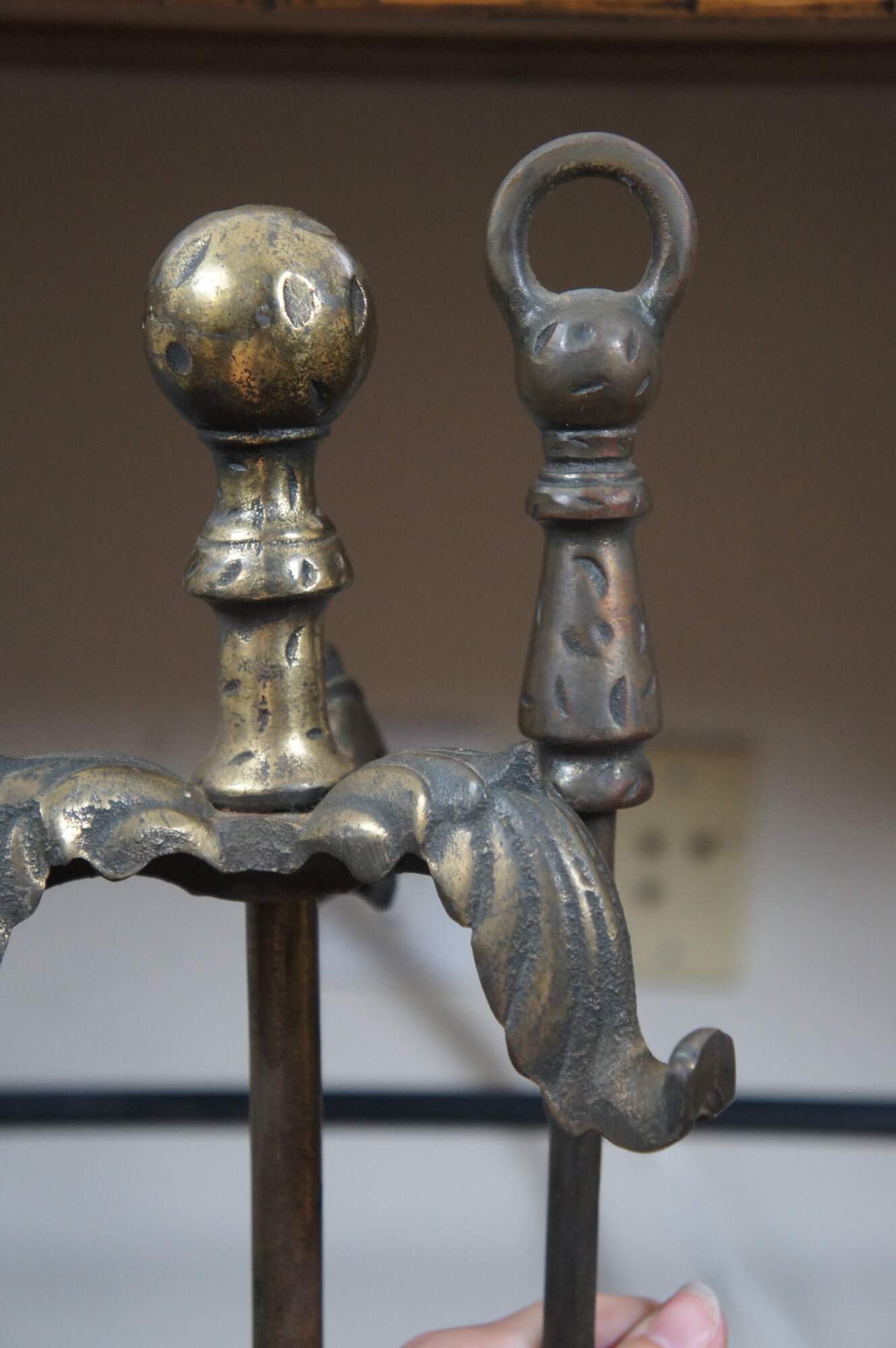 Set of four vintage iron and brass fireplace tools including brush, shovel, and poker hanging from leaf shaped hooks on the round bases stand. Marked 896 (or 968?) on base.