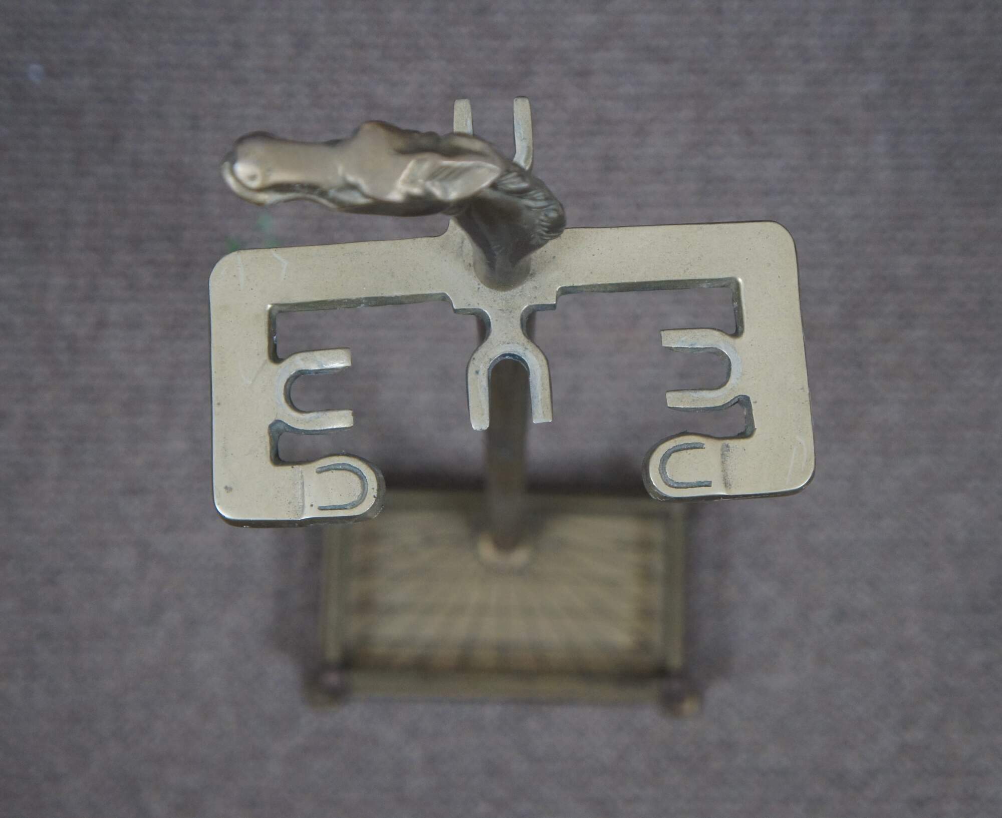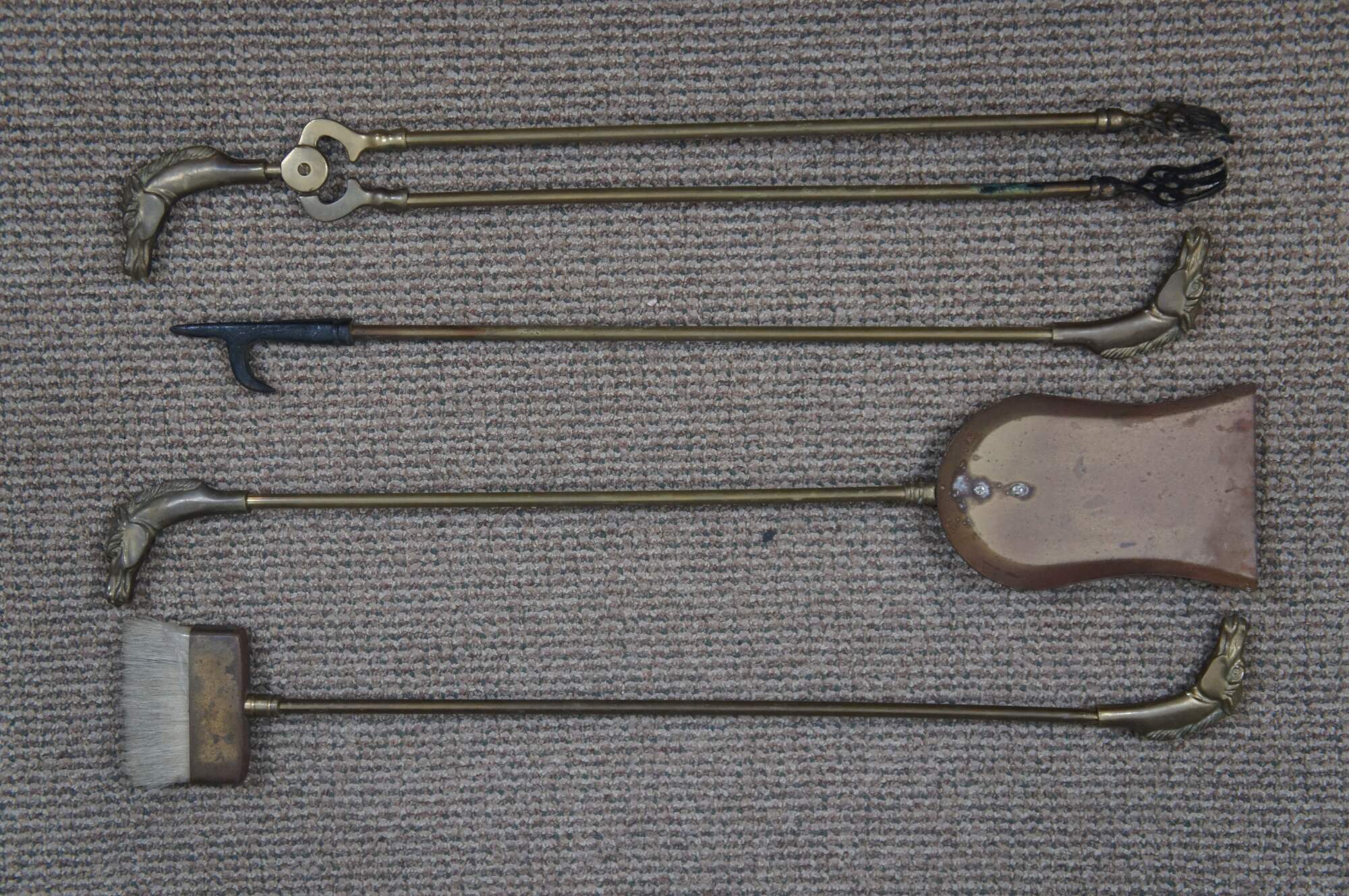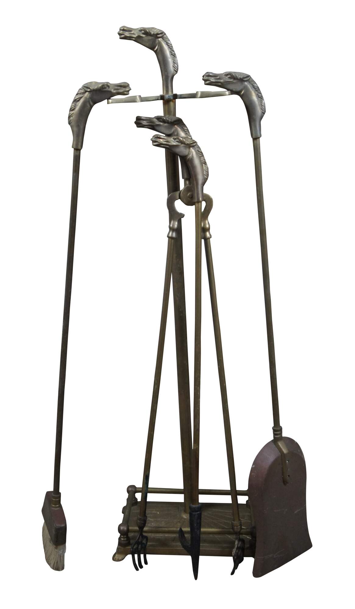 Mid 20th century five piece set of brass fireplace tools with horse head finials, by Decorative Crafts, Inc. Set includes stand with rectangular base and sunburst detail, tongs, shovel, poker, and brush, all topped with a horse’s head. Base also marked with GS in a triangle mark.
