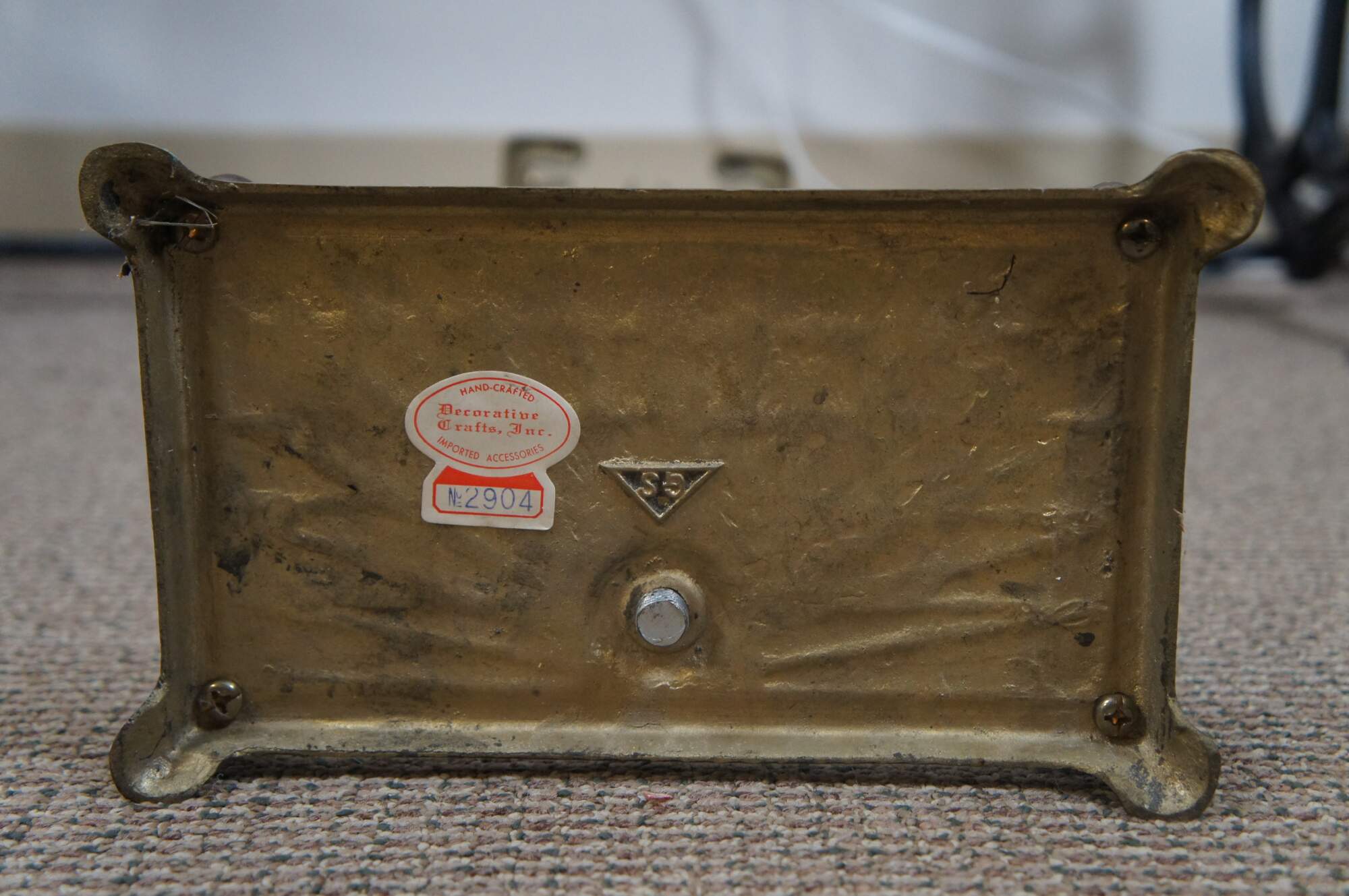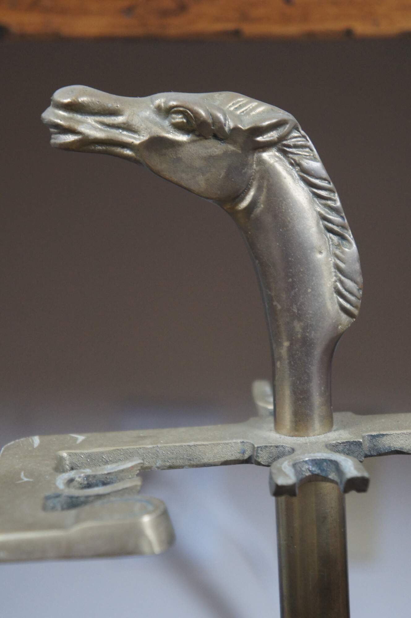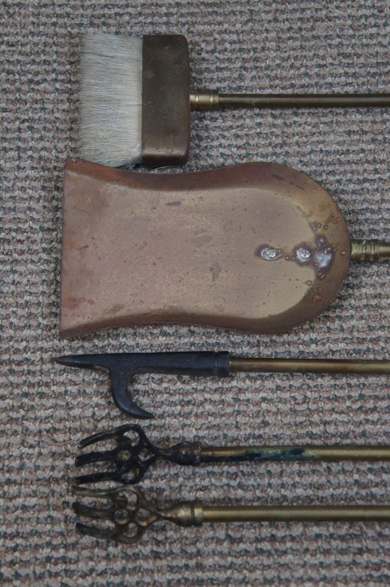 Mid 20th century five piece set of brass fireplace tools with horse head finials, by Decorative Crafts, Inc. Set includes stand with rectangular base and sunburst detail, tongs, shovel, poker, and brush, all topped with a horse’s head. Base also marked with GS in a triangle mark.