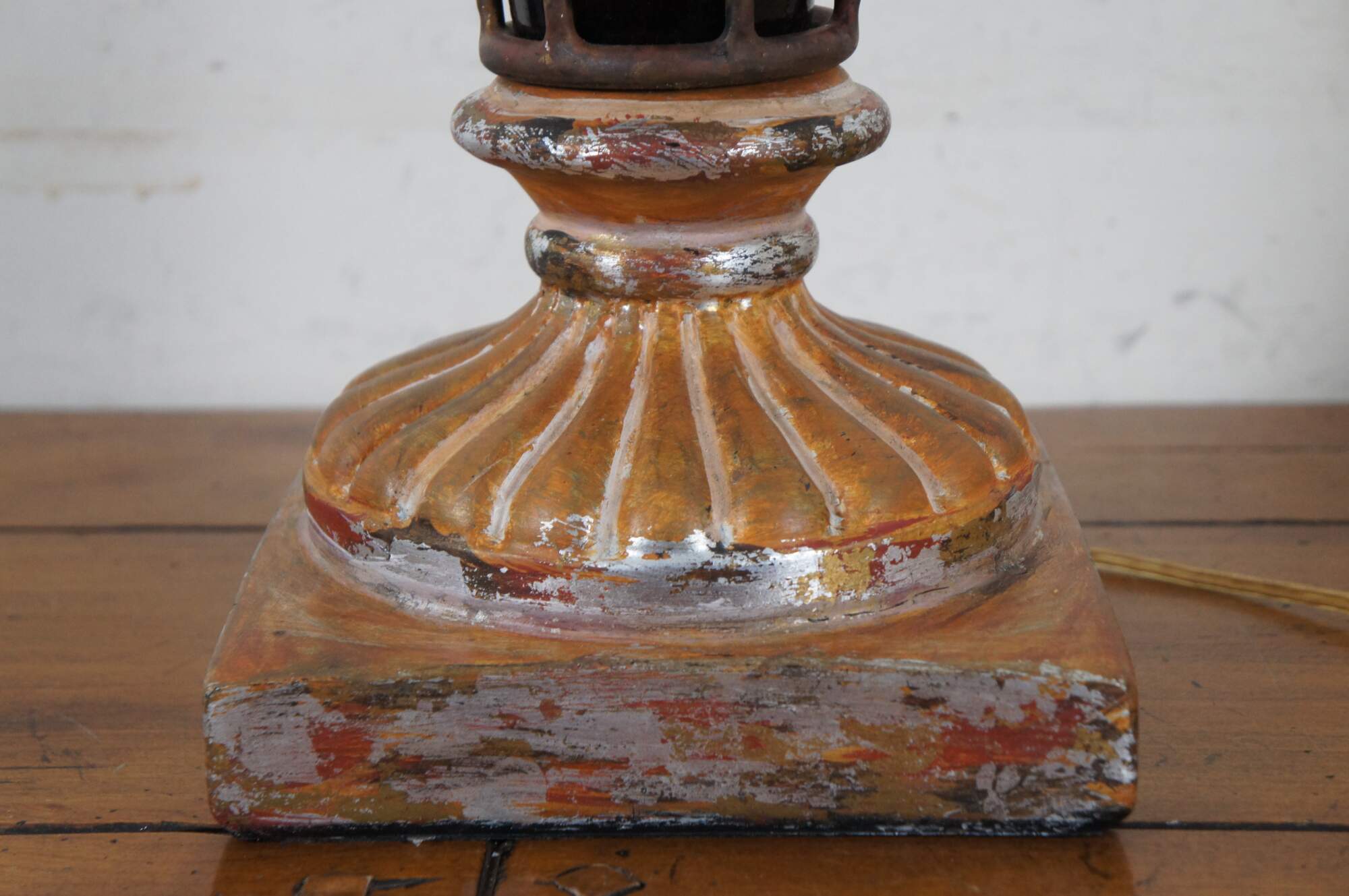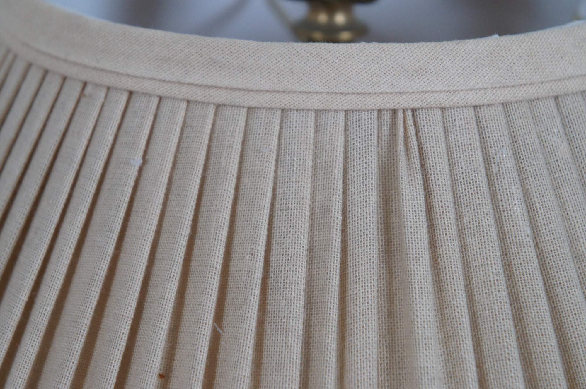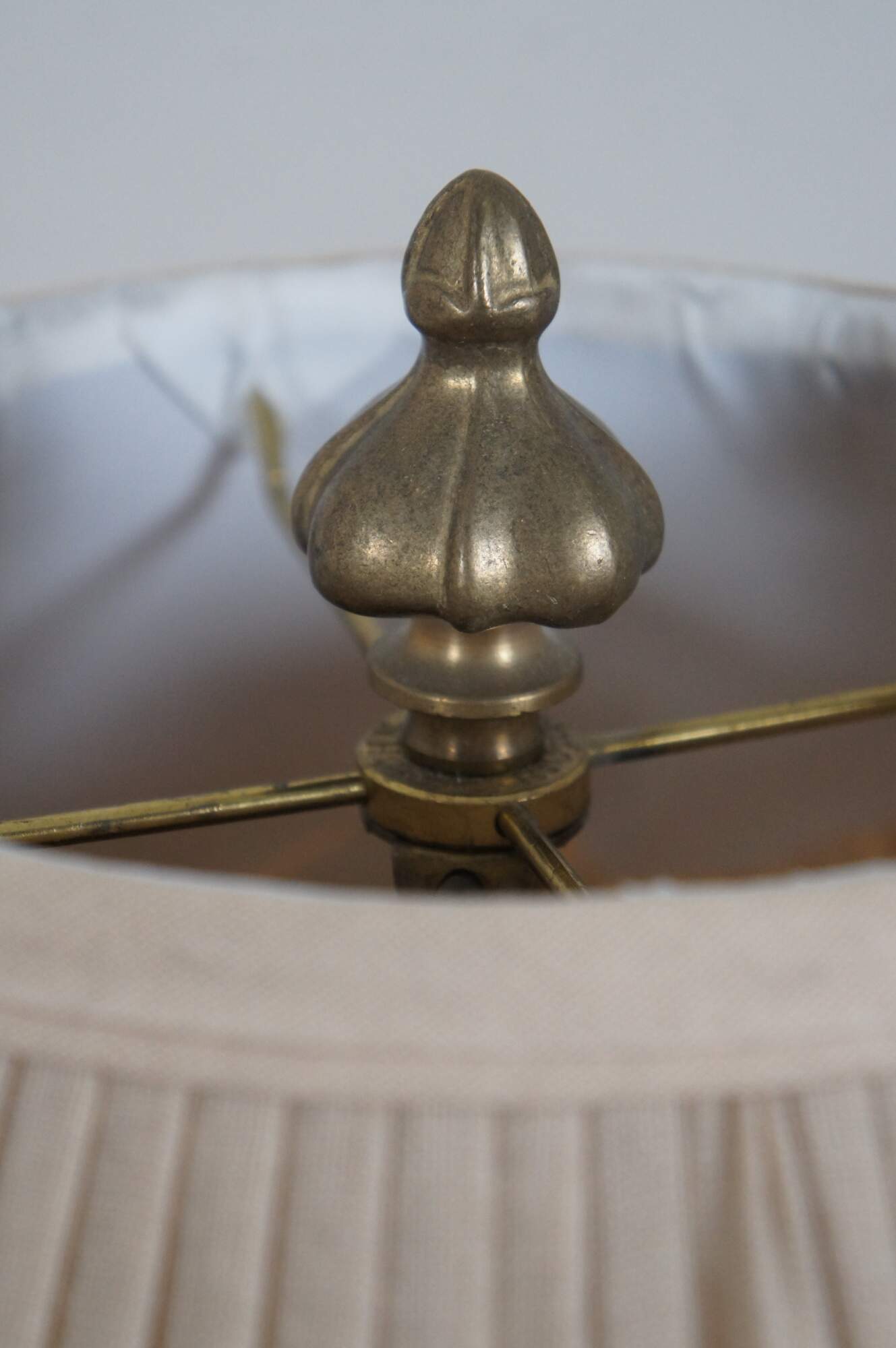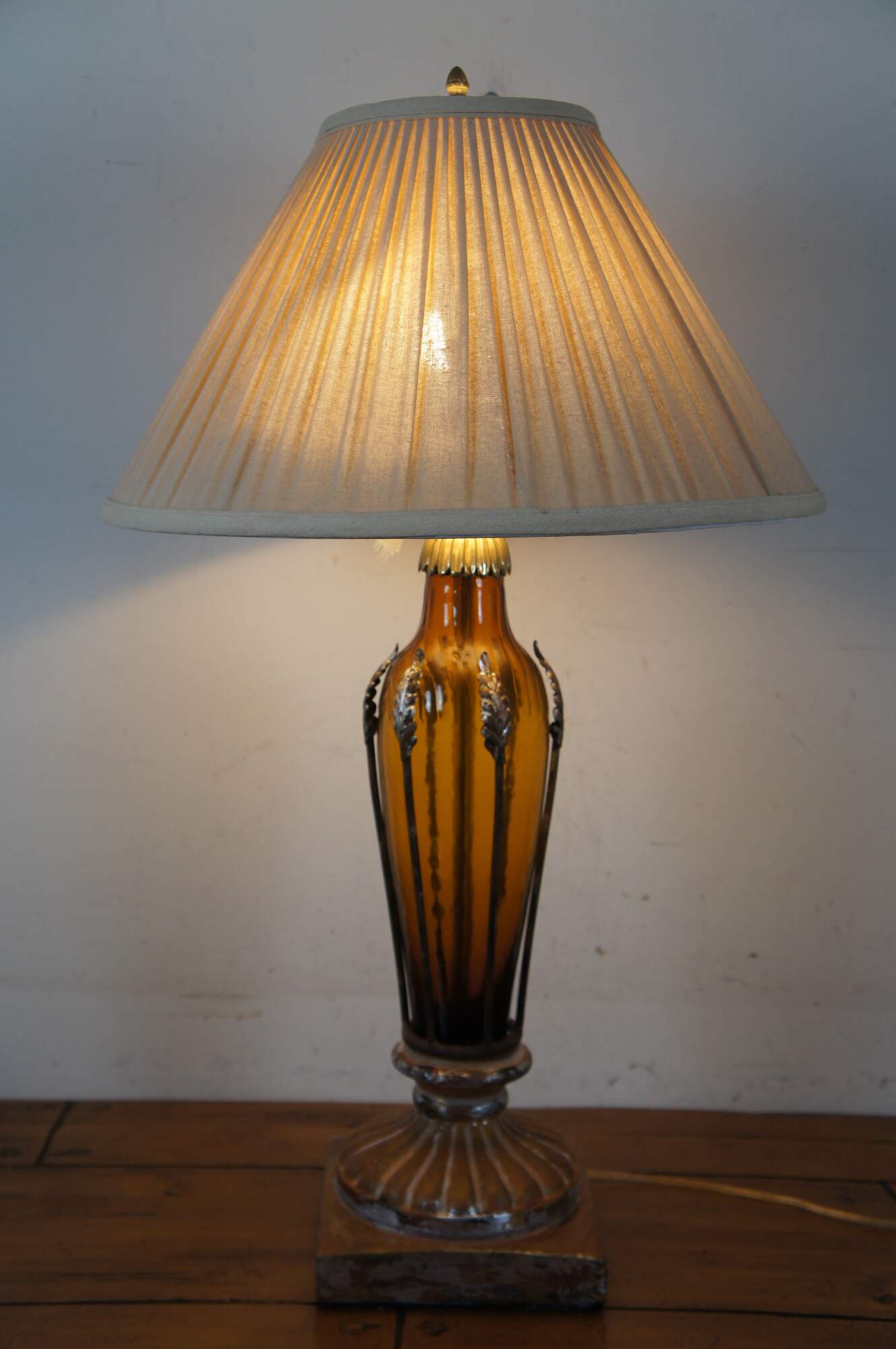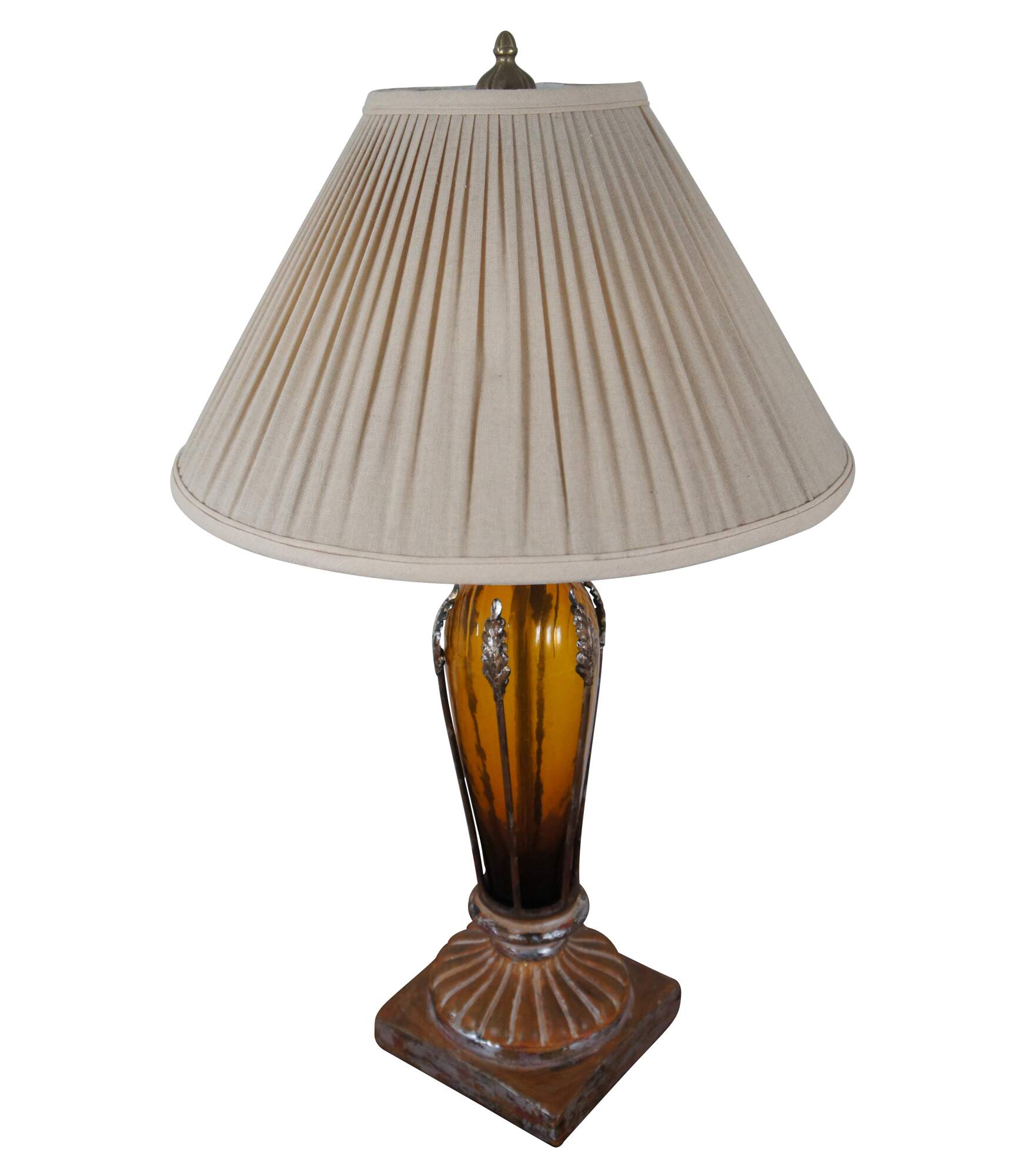 Vintage John Richard neoclassically inspired table lamp with painted chalkware column base supporting an amber glass trophy urn shaped vase topped with gold and caged with single leaf stalks. Off white, pleated linen shade. JRL5295 Amber and Gold Vase Lamp.