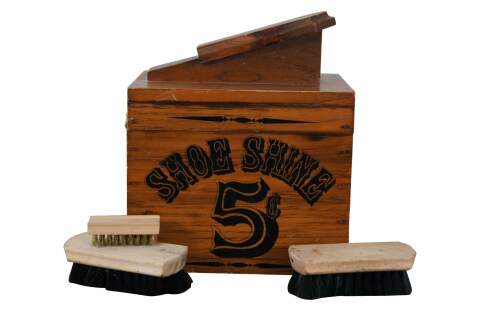 Vintage shoe shine box, produced by Triangle Products of Malden, MA. Rectangular wooden box with shoe stand fixed to the top, brass hardware, stenciled in black with the words “Shoe Shine 5 Cents” in an Old West / late 19th century type font. Includes three brushes.