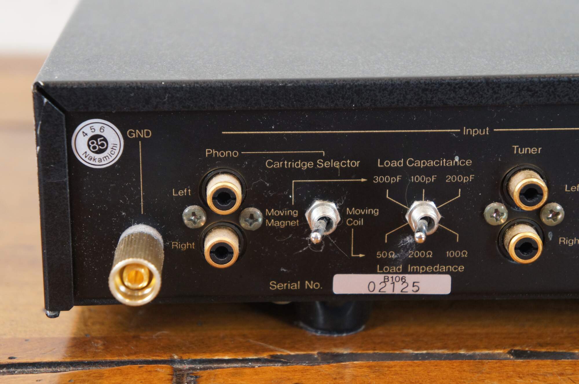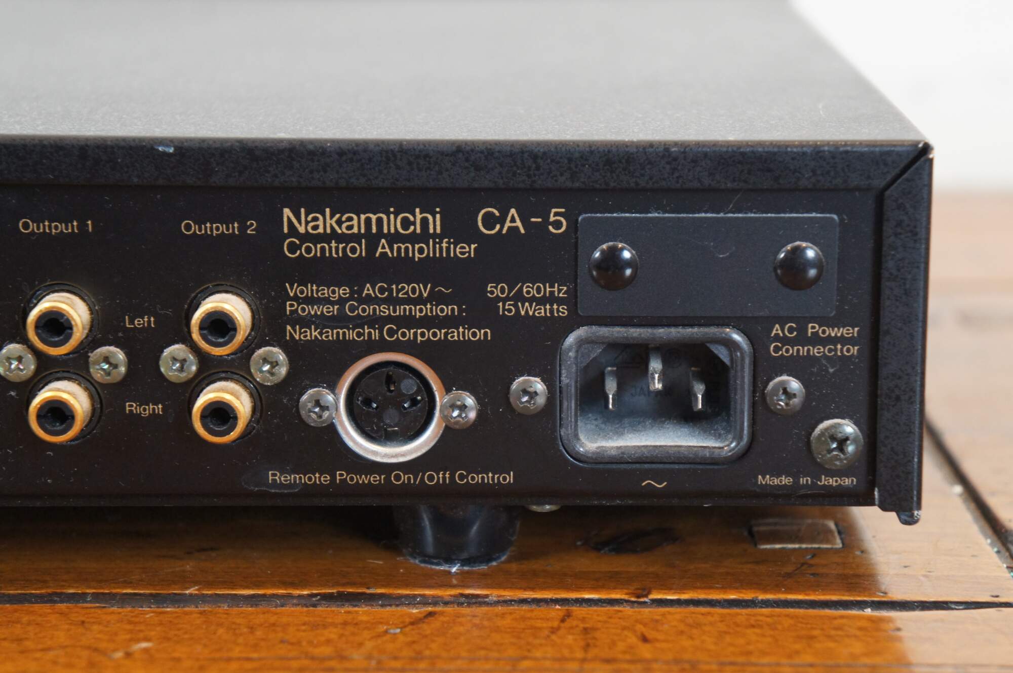 Nakamichi CA-5 E Control Amplifier, manufactured circa 1985-1988. Voltage: AC 120V ~ 50/60 Hz. Power Consumption: 15 Watts. Serial Number B106 021125. Made in Japan.
