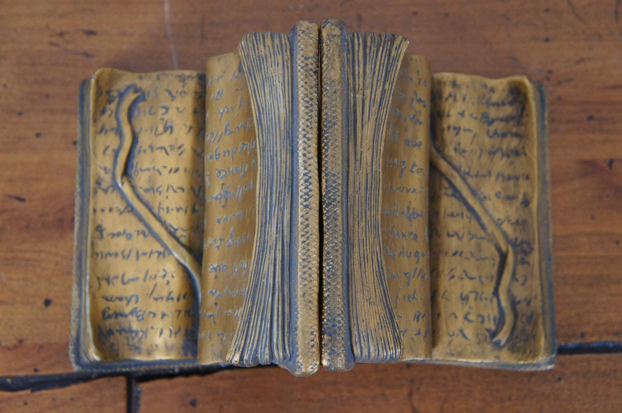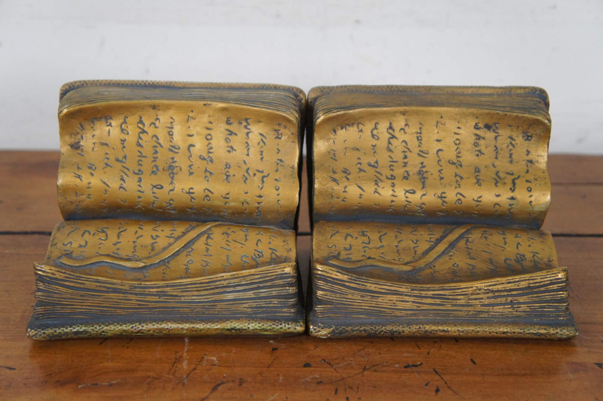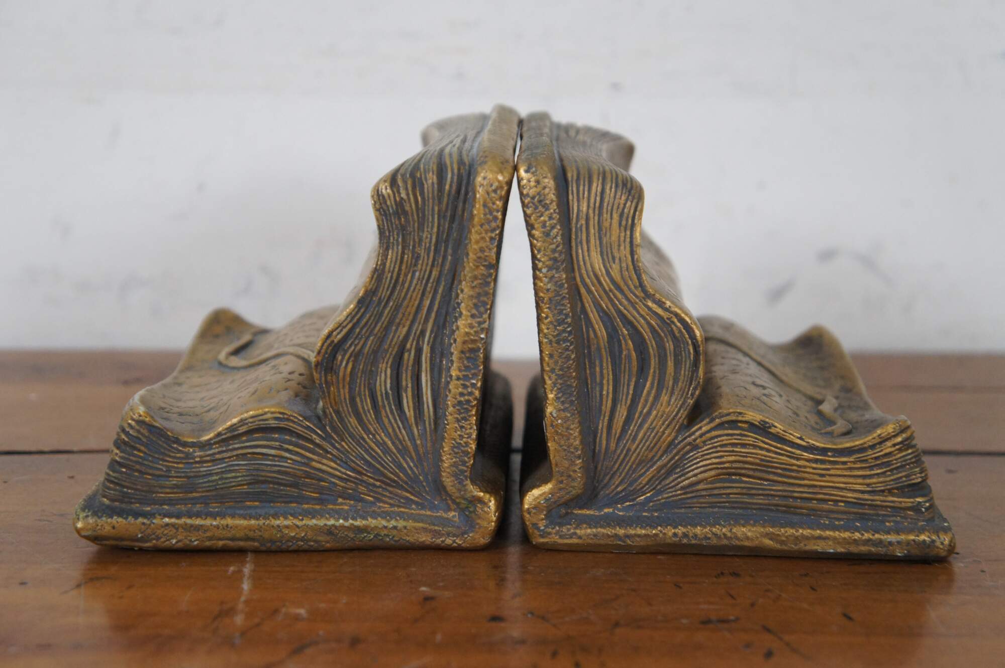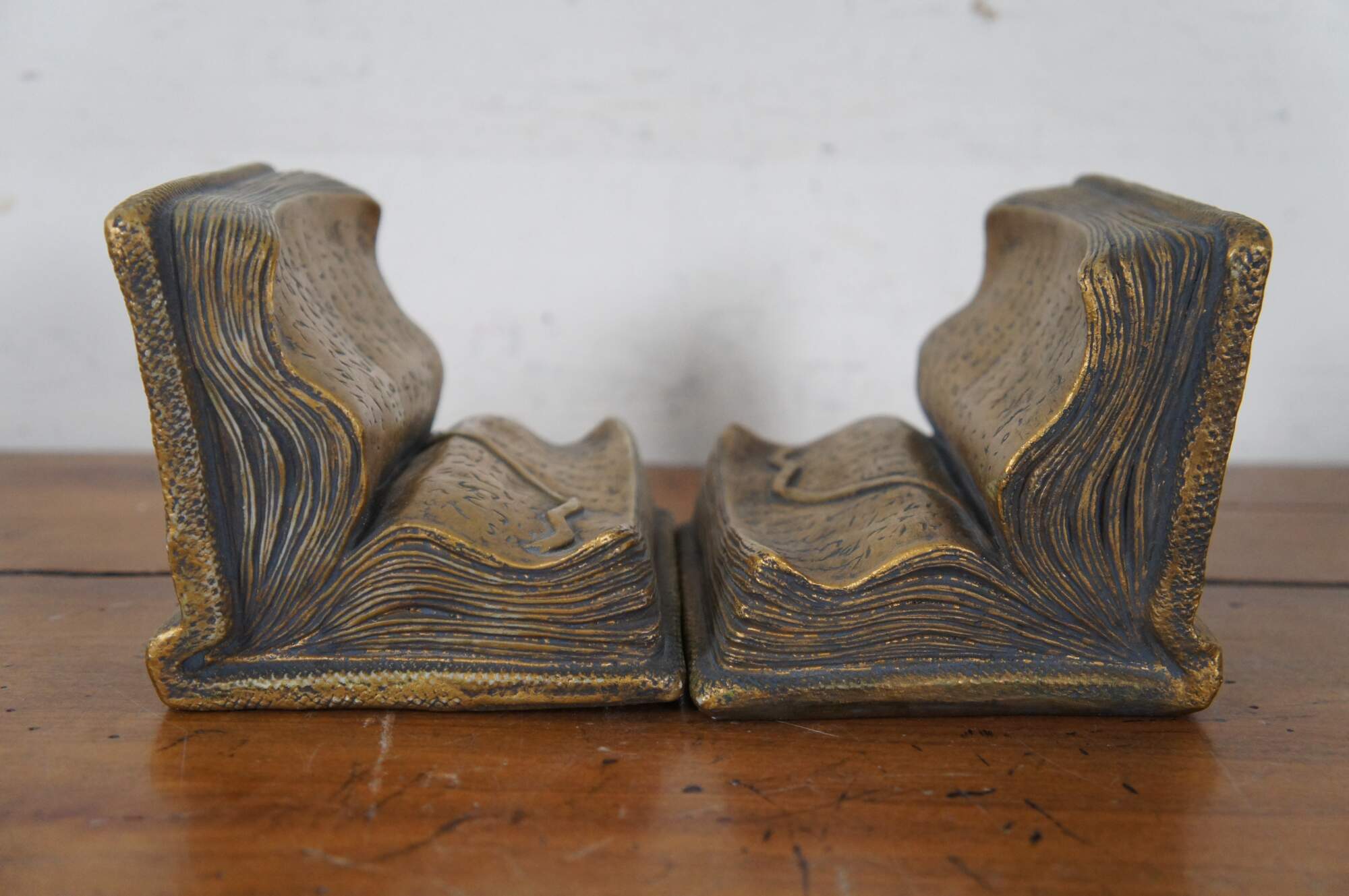 Vintage mid to late 20th century pair of bookends by Toyo; crafted of resin with a gold painted finish in the shape of half open books with page marker ribbon. Made in China.